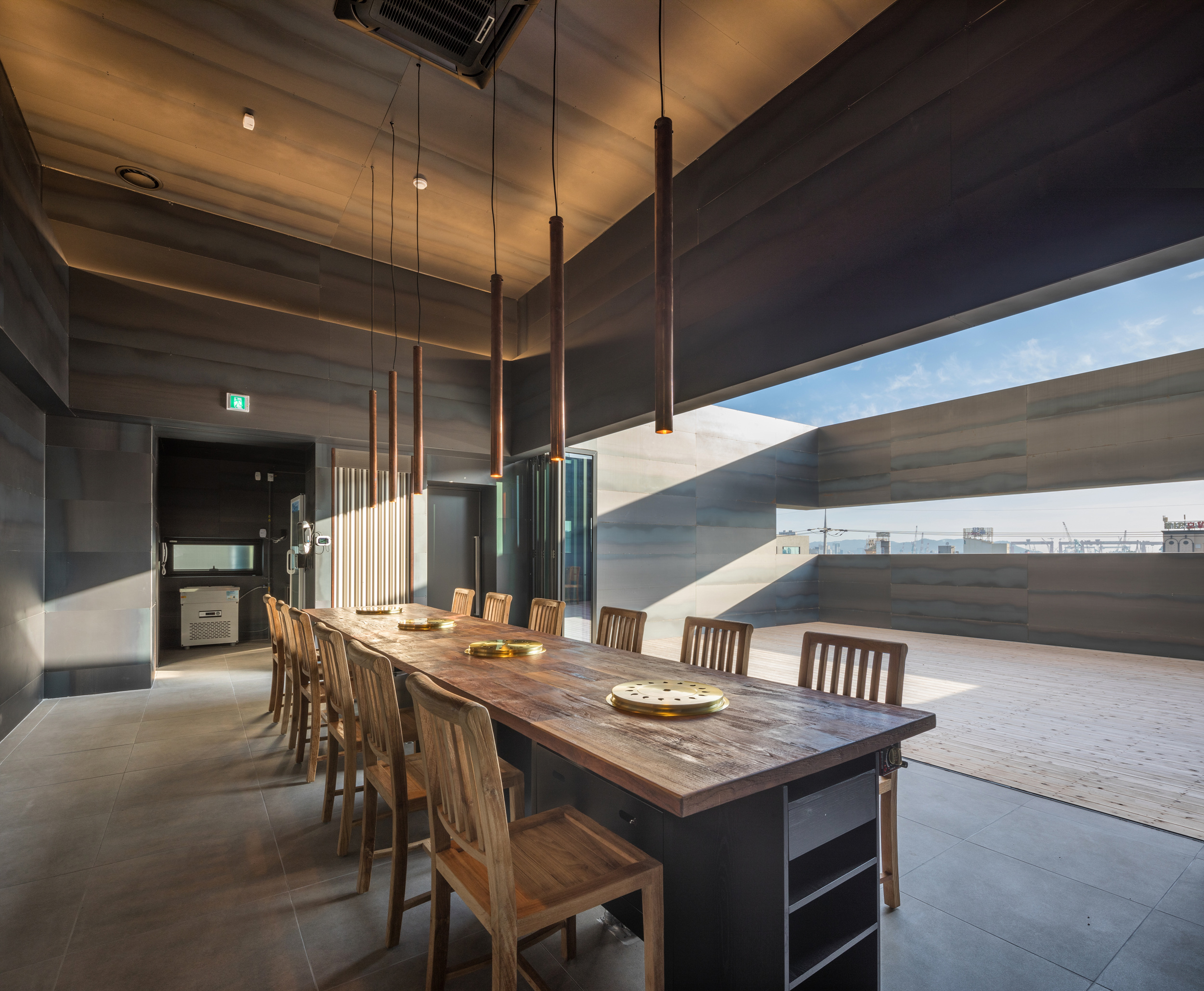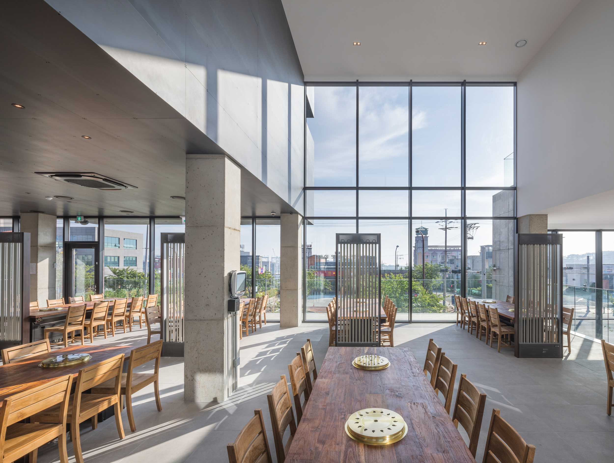 The site adjoining the entrance road of Daewangam, a tourist destination in Ulsan, is located on the border between residential areas towards the south and commercial areas towards the north. The client, who was operating a Korean beef restaurant within the vicinity, sought to carry out his commercial activities by securing his own space. It was a project intended to plan an experimental structure as a complex space where one can enjoy culinary culture via a new architectural space rather than a simple meat restaurant.