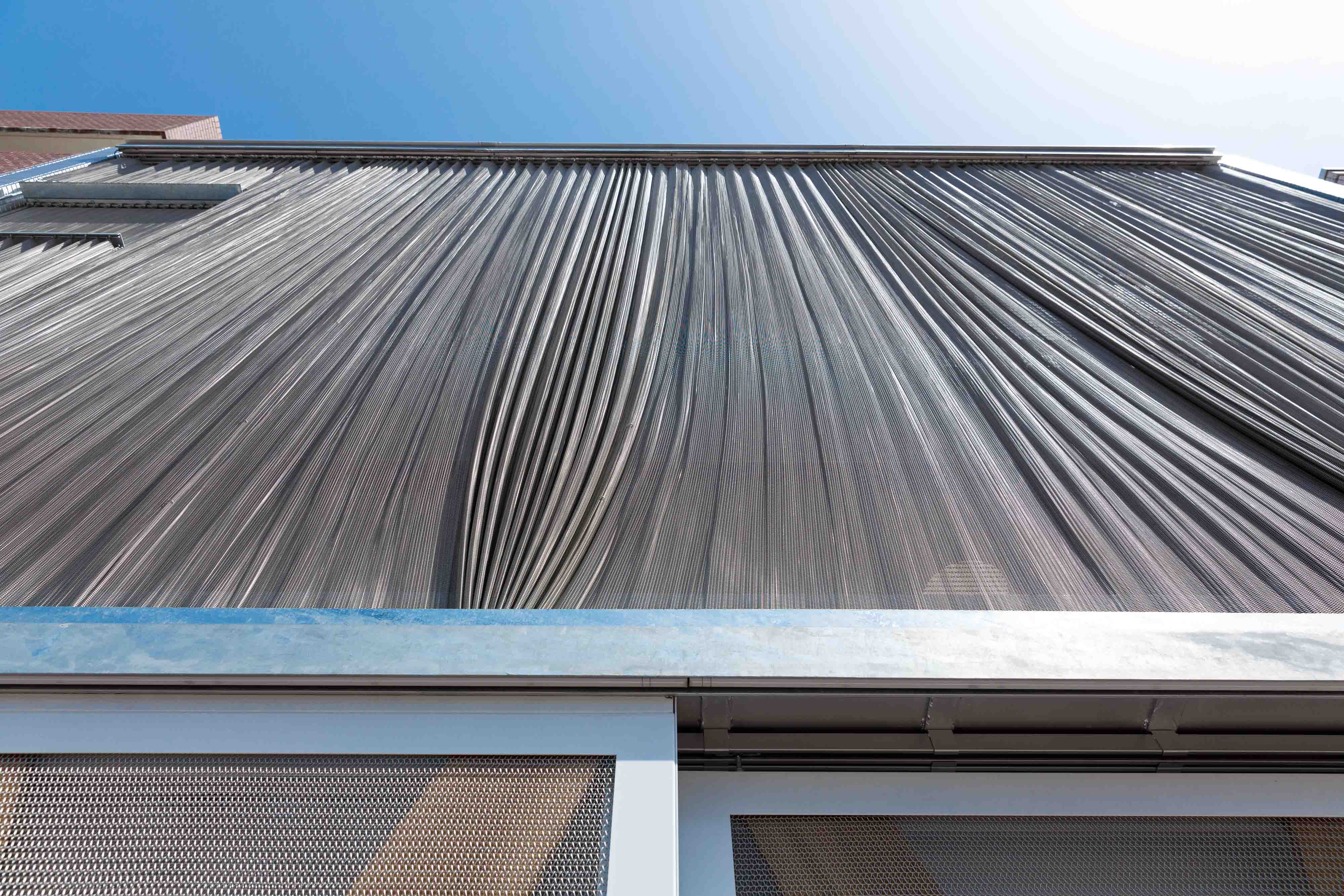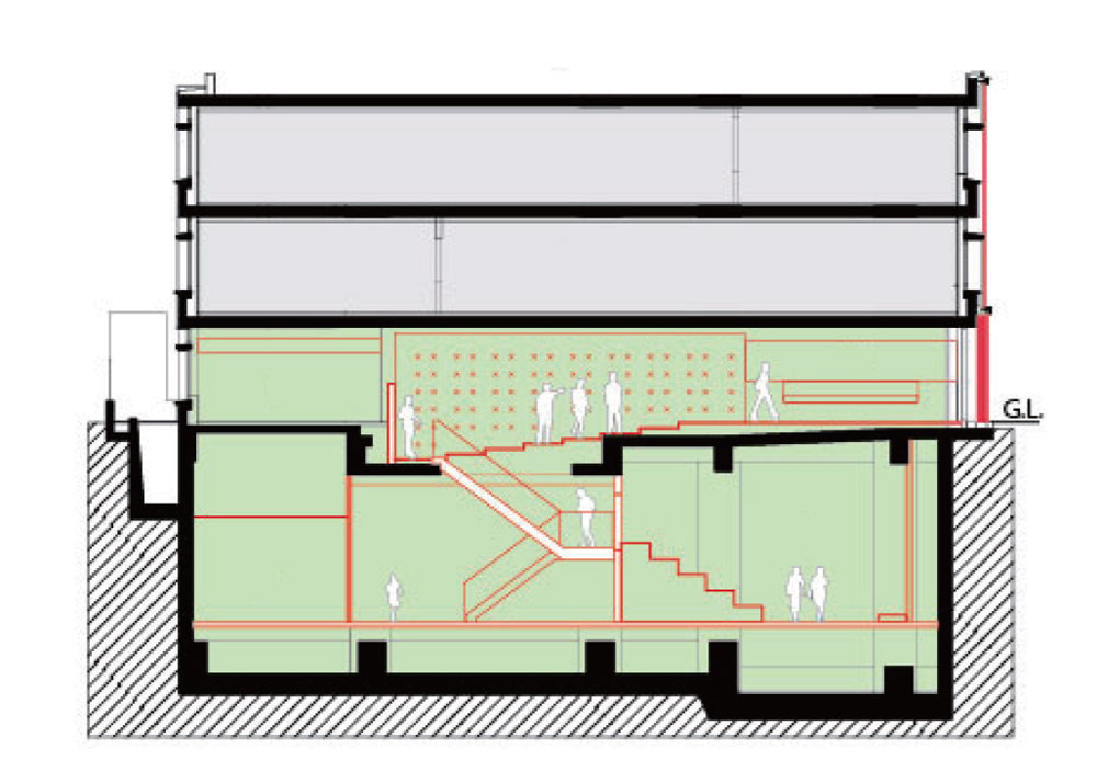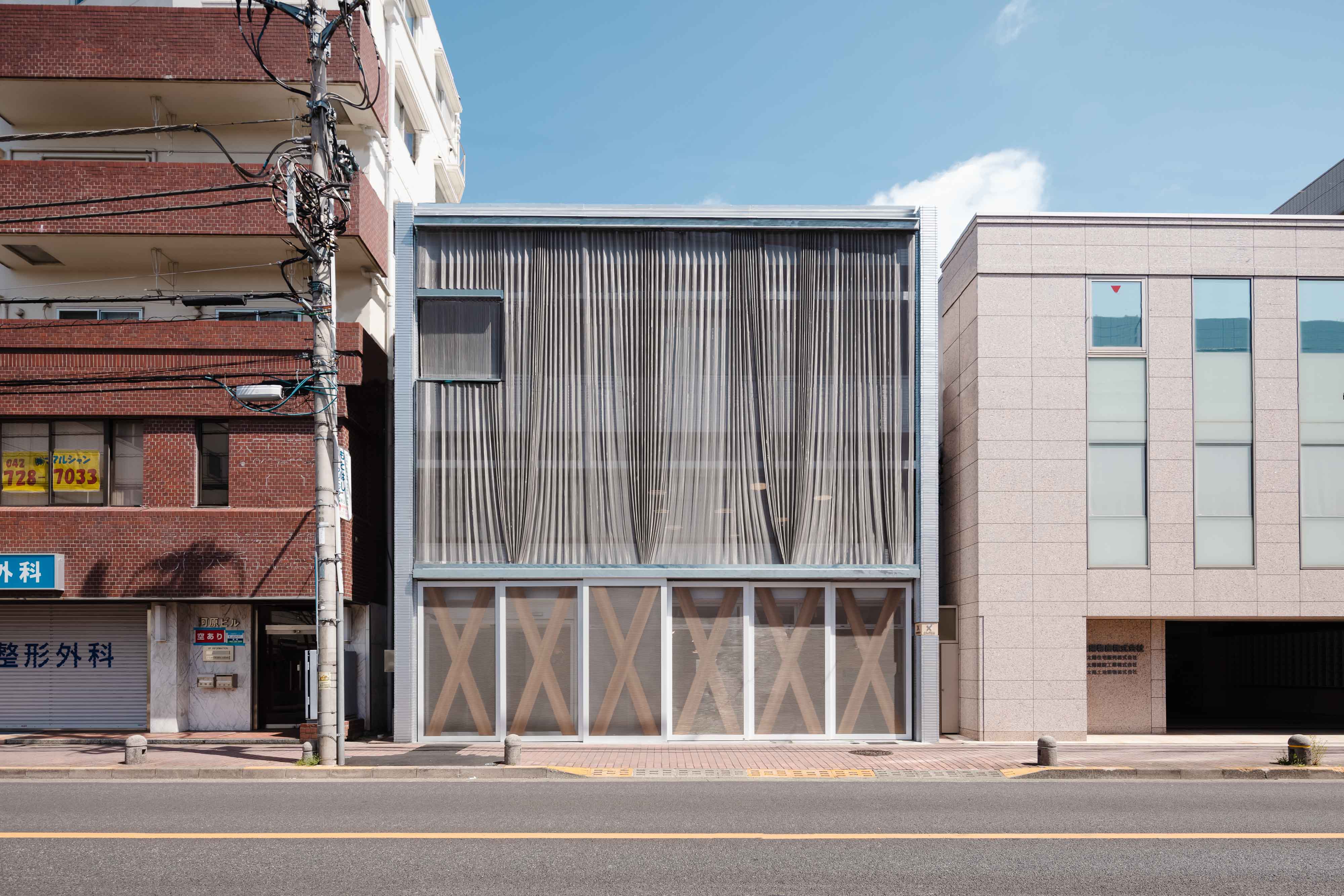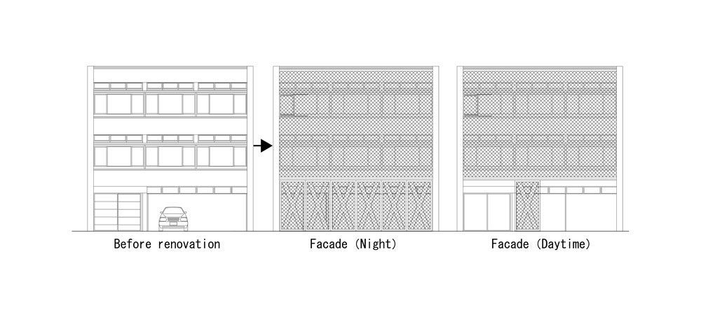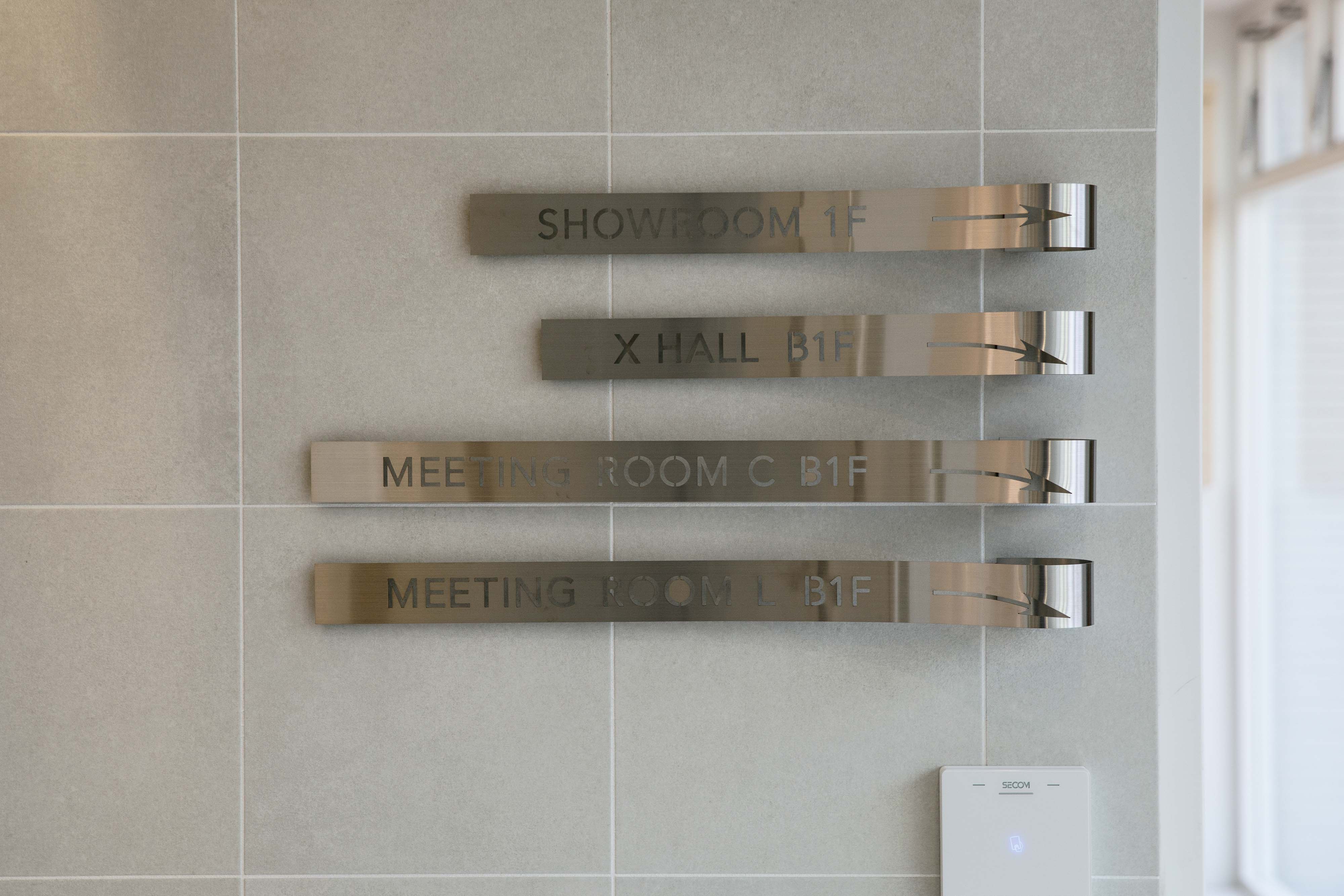 The designer covered the existing plain tile exterior wall with a wrinkled metal mesh reminiscent of the curve of the tape to add the image of the headquarters dealing with the recording medium magnetic tape. Metal mesh is an environmental device that reduces heat load by evenly spreading direct sunlight and allows an appropriate amount of light to permeate inside. The first floor’s crime prevention shutter with the motif of the company logo X can be opened, closed, and used according to the internal usage, so it is freely connected to the road in front. The interior utilized a large space in the existing mechanical parking lot, and through the void, it was designed as an integrated exchange space that did not feel closed underground. The exhibition space is finished using wood to give a warm feeling, and some walls can be communicated using magnets, and there is an open kitchen on one side, so natural exchange activities can take place. In terms of facilities, automatic ventilation by a CO2 sensor and automatic control of humidity by an integrated dehumidifying humidifier can lower the air conditioning load and save energy.