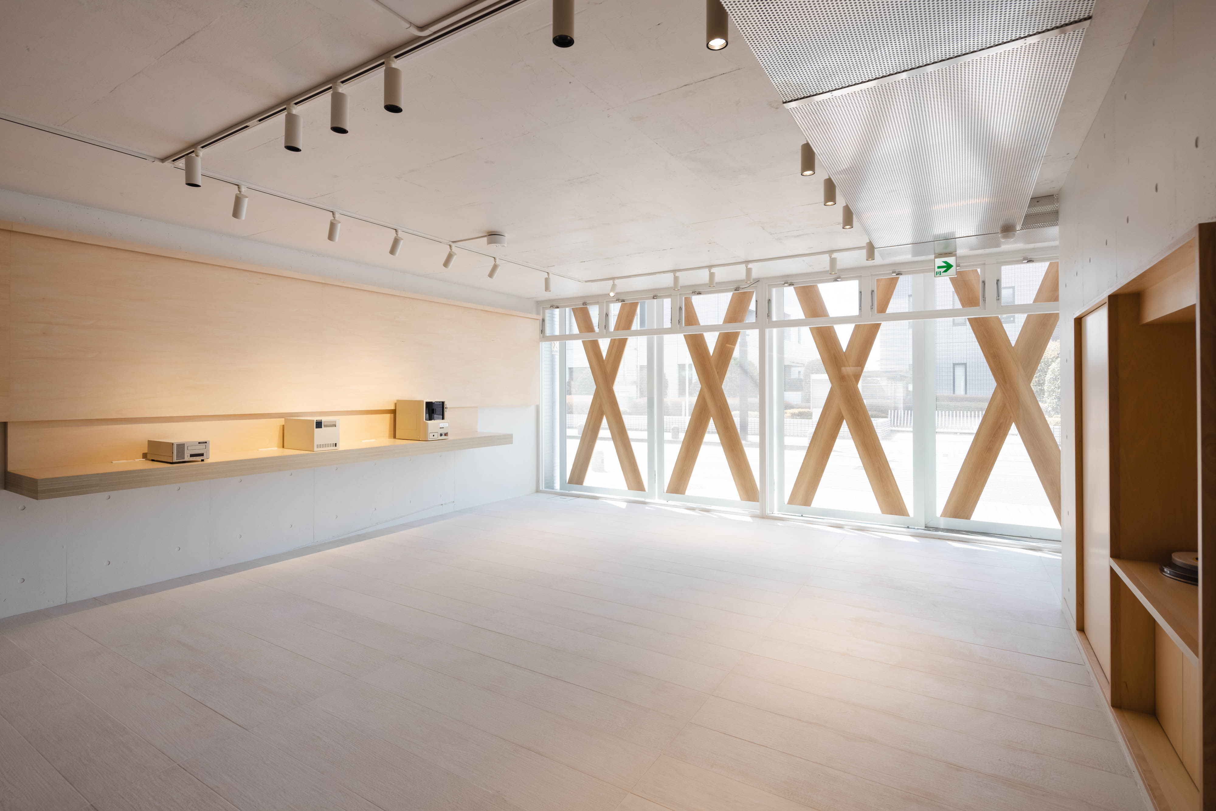 In addition, the company name UNITEX's "X" was repeatedly used for crime prevention shutters, first-floor exhibition walls, railings, furniture, and lighting, and laminated plywood was used in furniture and exhibition corners reminiscent of wood rings with the motif of wound magnetic tape's stacked form. Laminated plywood is also a means of expressing the corporate image of accumulating information called LTO. The new UNITEX headquarters, which overlapped new elements that can reveal the image of the company while maintaining the structure of the existing building, clearly shows the corporate spirit of "Ongojishin."