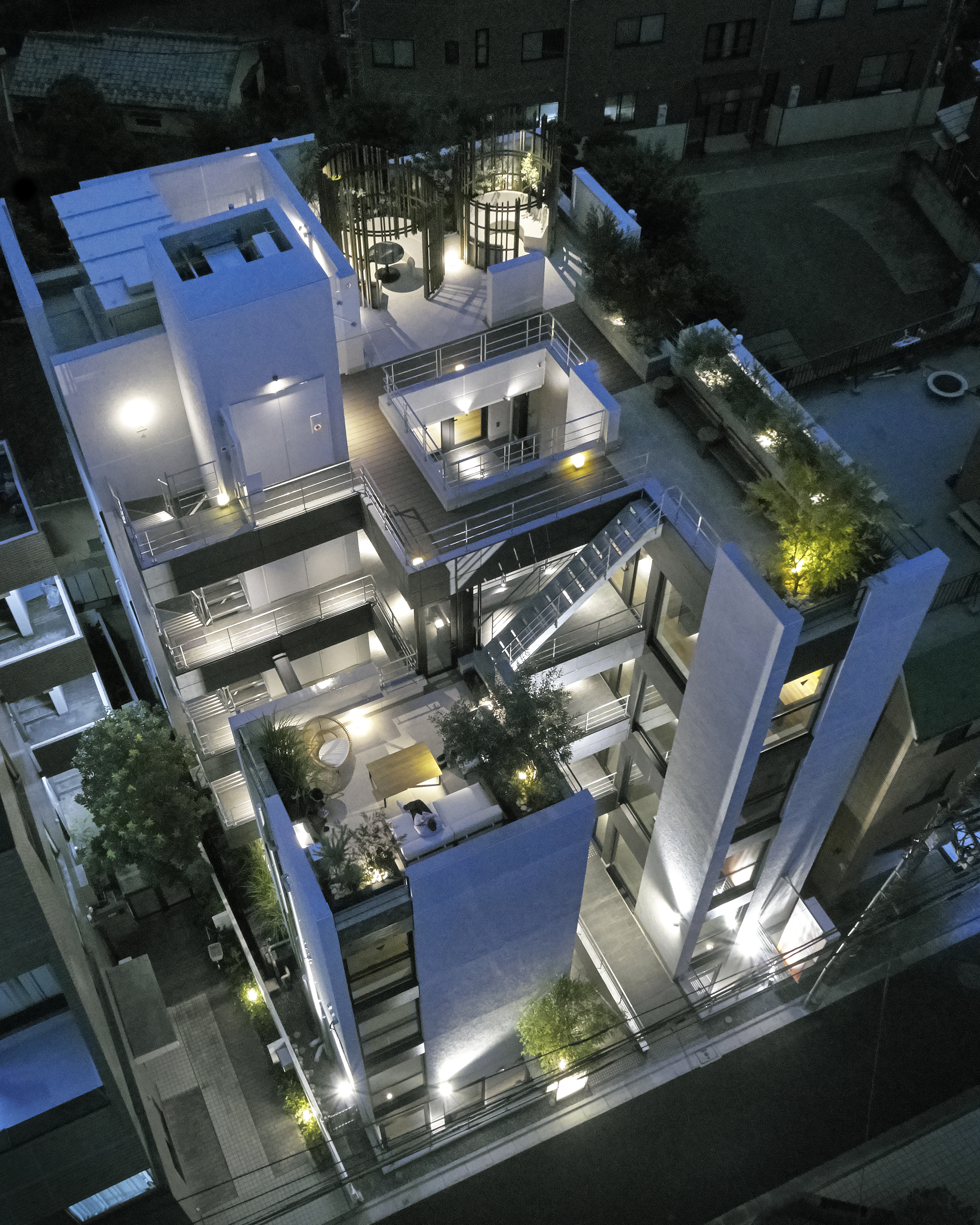Auspice Aoyama is a small complex located in the dense center of Tokyo. There are small stores and offices and all of each are connected through empty space in the middle, exterior corridor, and staircase. The divided and emptied space this way, relieves surrounding suffocating environment and as there are many exposed surfaces with emptied gaps between the blocks, sufficient natural light and active ventilation activity arose. Between the randomly located walls, the landscape spaces decorated like gardens are scattered around so it becomes a place like oasis amid of bustling city center spaces.