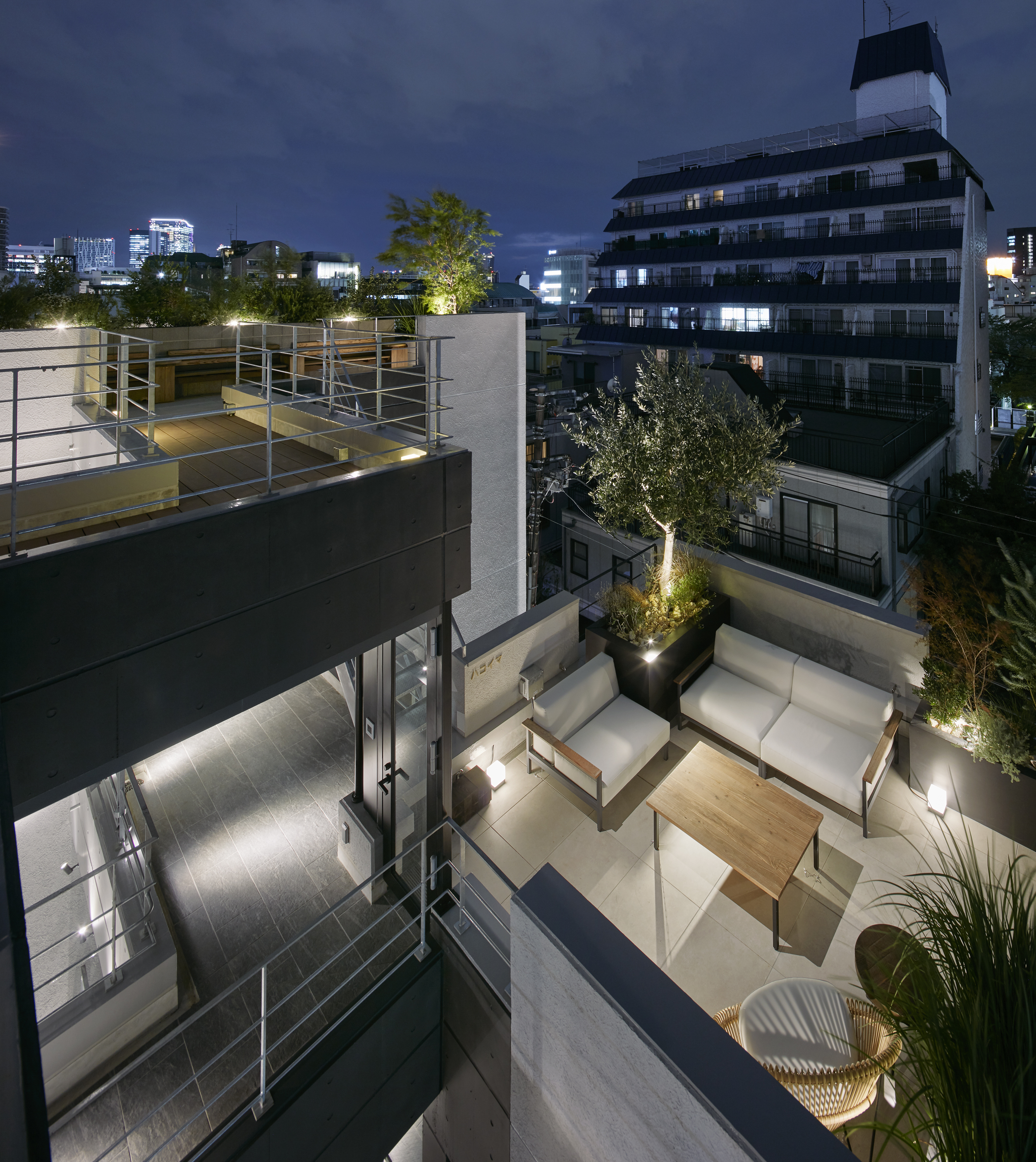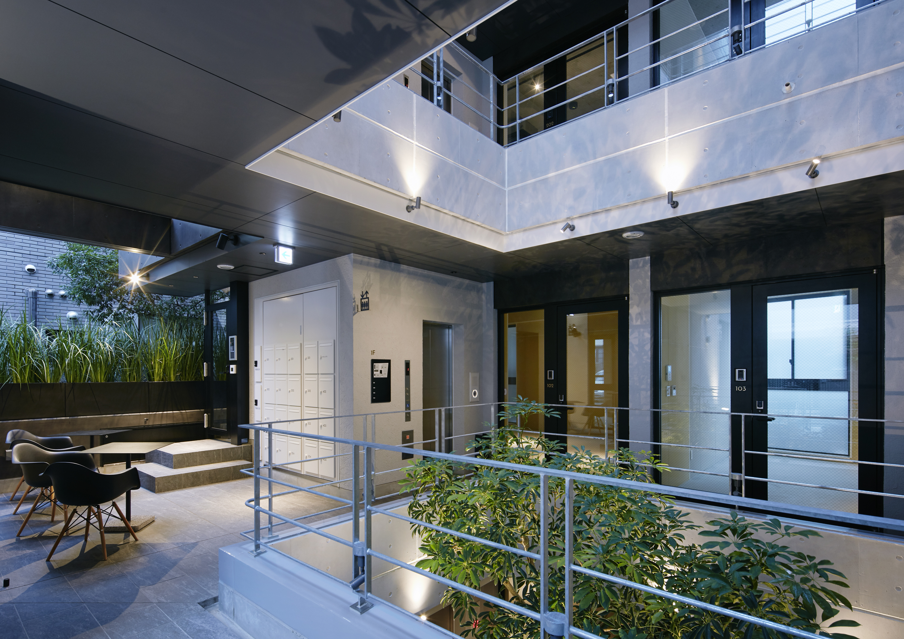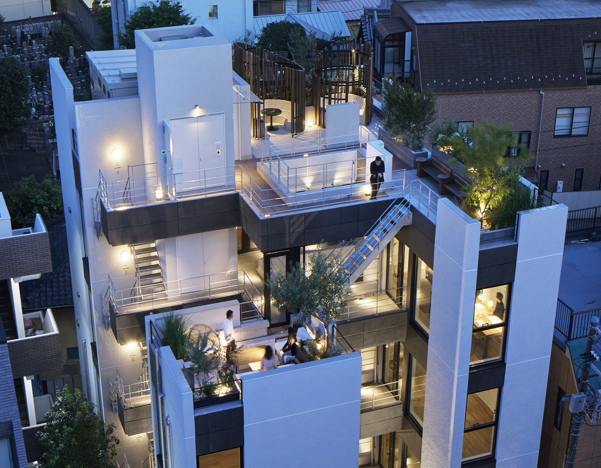 Auspice Aoyama is a small complex located in the dense center of Tokyo. There are small stores and offices and all of each are connected through empty space in the middle, exterior corridor, and staircase. The divided and emptied space this way, relieves surrounding suffocating environment and as there are many exposed surfaces with emptied gaps between the blocks, sufficient natural light and active ventilation activity arose. Between the randomly located walls, the landscape spaces decorated like gardens are scattered around so it becomes a place like oasis amid of bustling city center spaces.