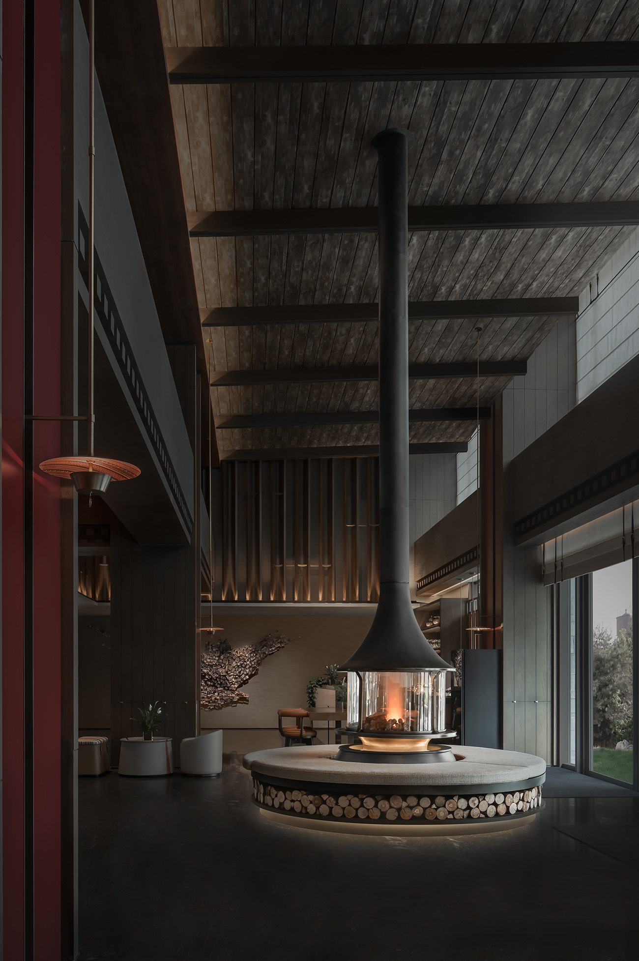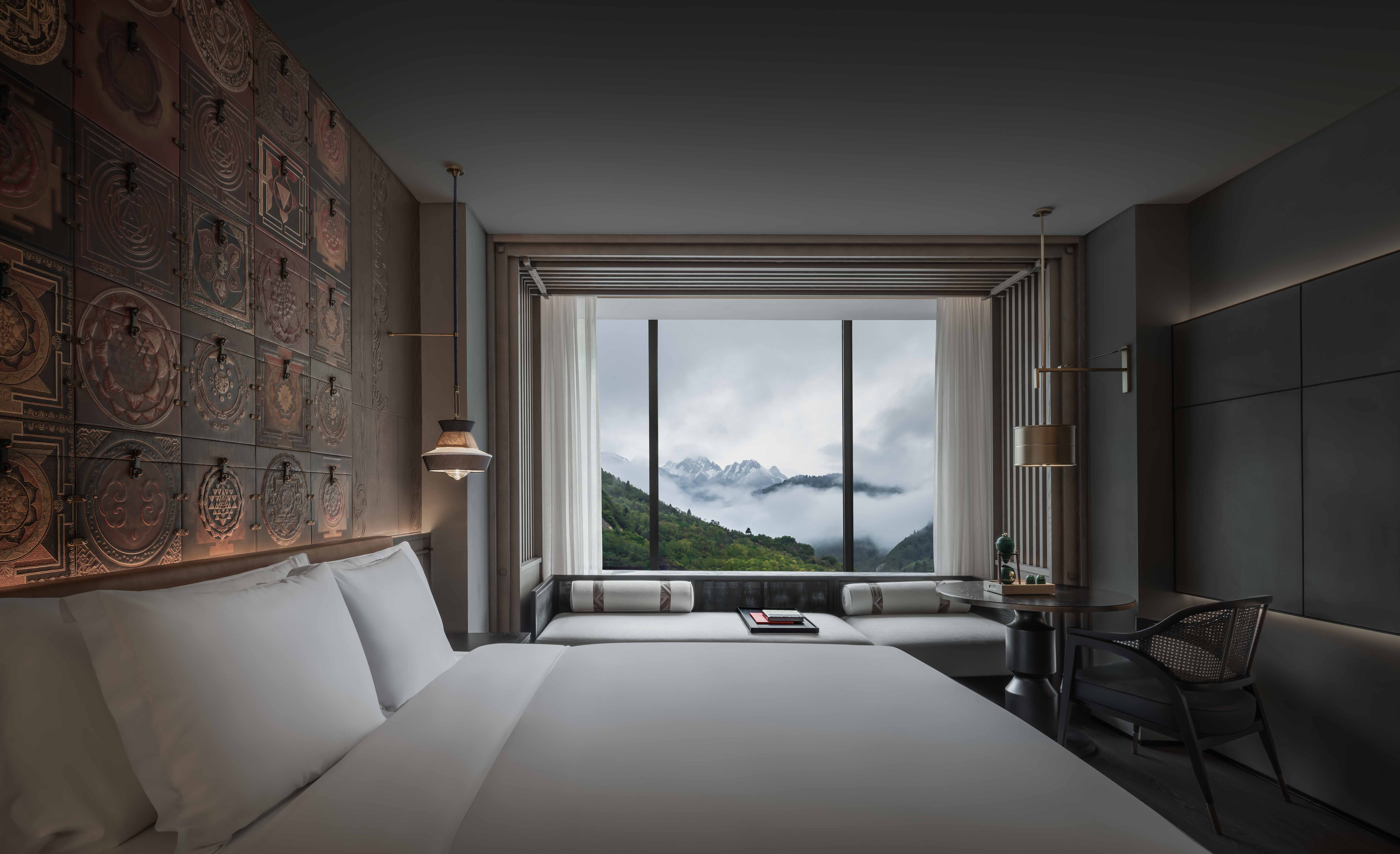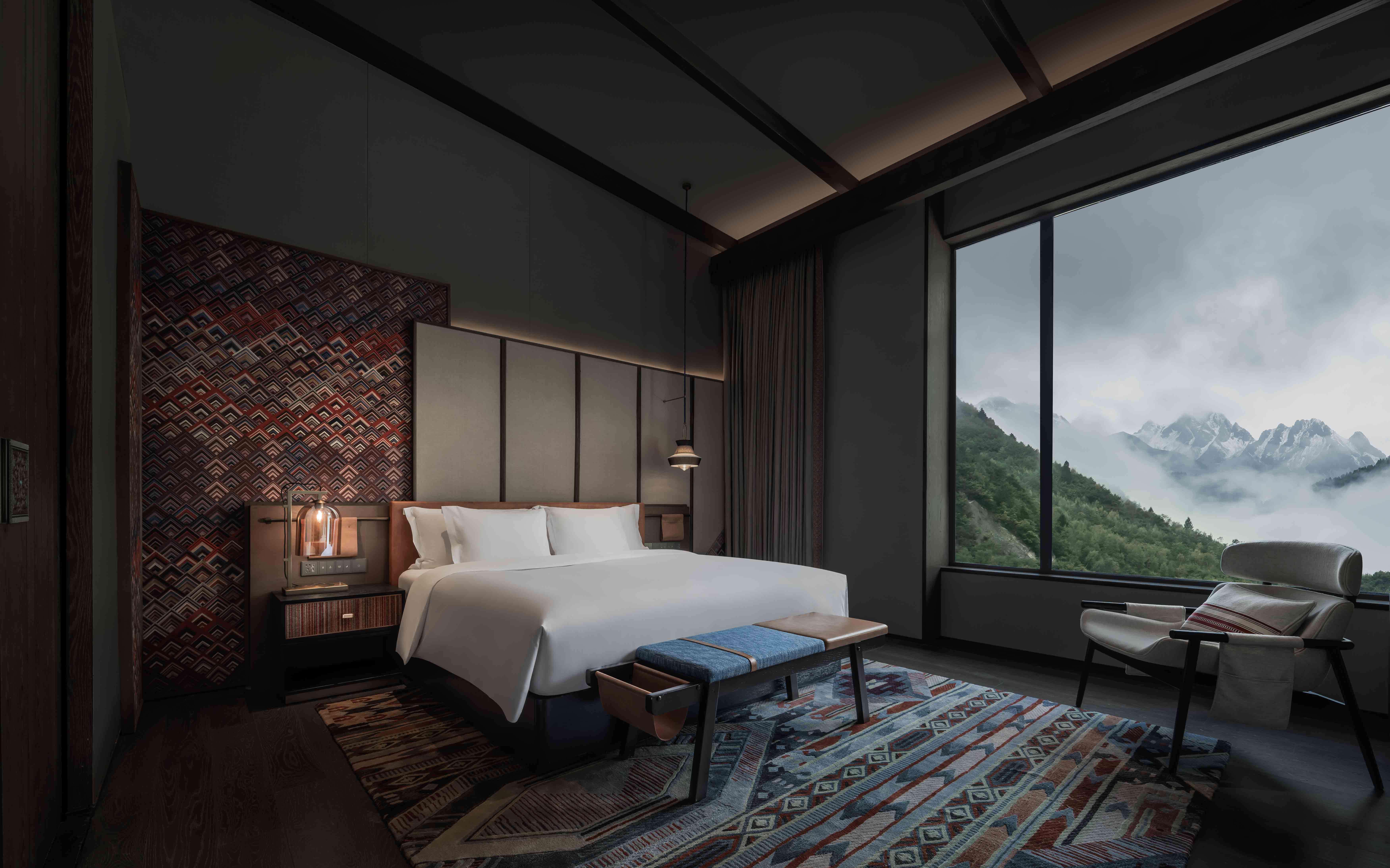 Hotel Indigo Jiuzhai is a hotel which has built in scenic area of Jaigou, which has fascinating landscape in China. The designer intended to create a musesum like space where the Tibetan, which is the culture of the region, regional elements and heritages are collected. An eagle, which is regarded divine in this region, became a basic concept of the hotel's interior. Like a divine eagle flies high, the lobby ceiling has designed high compared to the other hotels, and walls of the lobby have decorated with an eagle's wings and arouse infinite imagination. Chair and carpet design which was inspired from Tibet and Chiang nation's traditional brazier show culture of the region everywhere. In bedroom, this kind of traditional elements have been properly arranged suitable for modern hotel bedrooms, and traditional patterns and wall paintings showing the region's culture hung up everywhere.