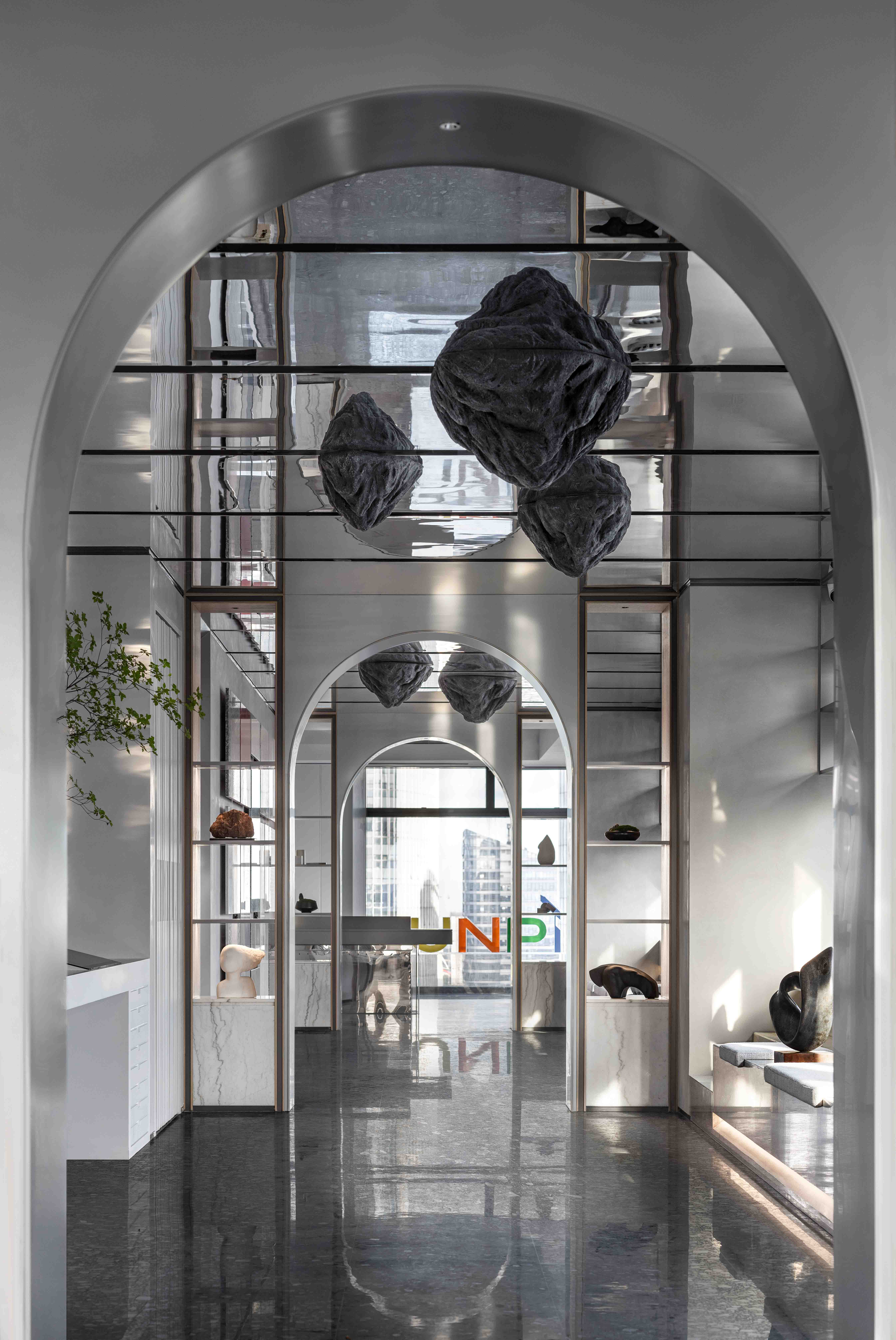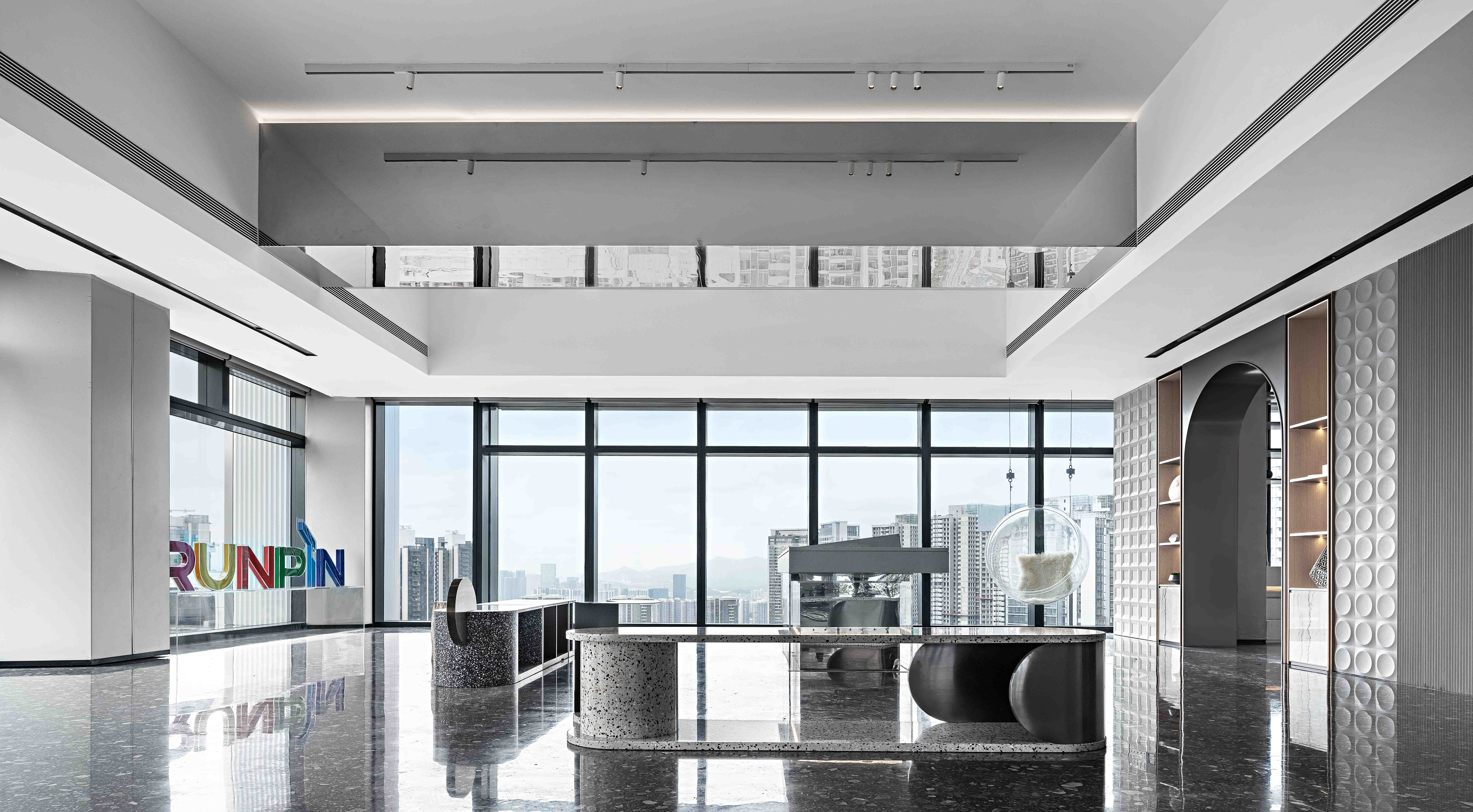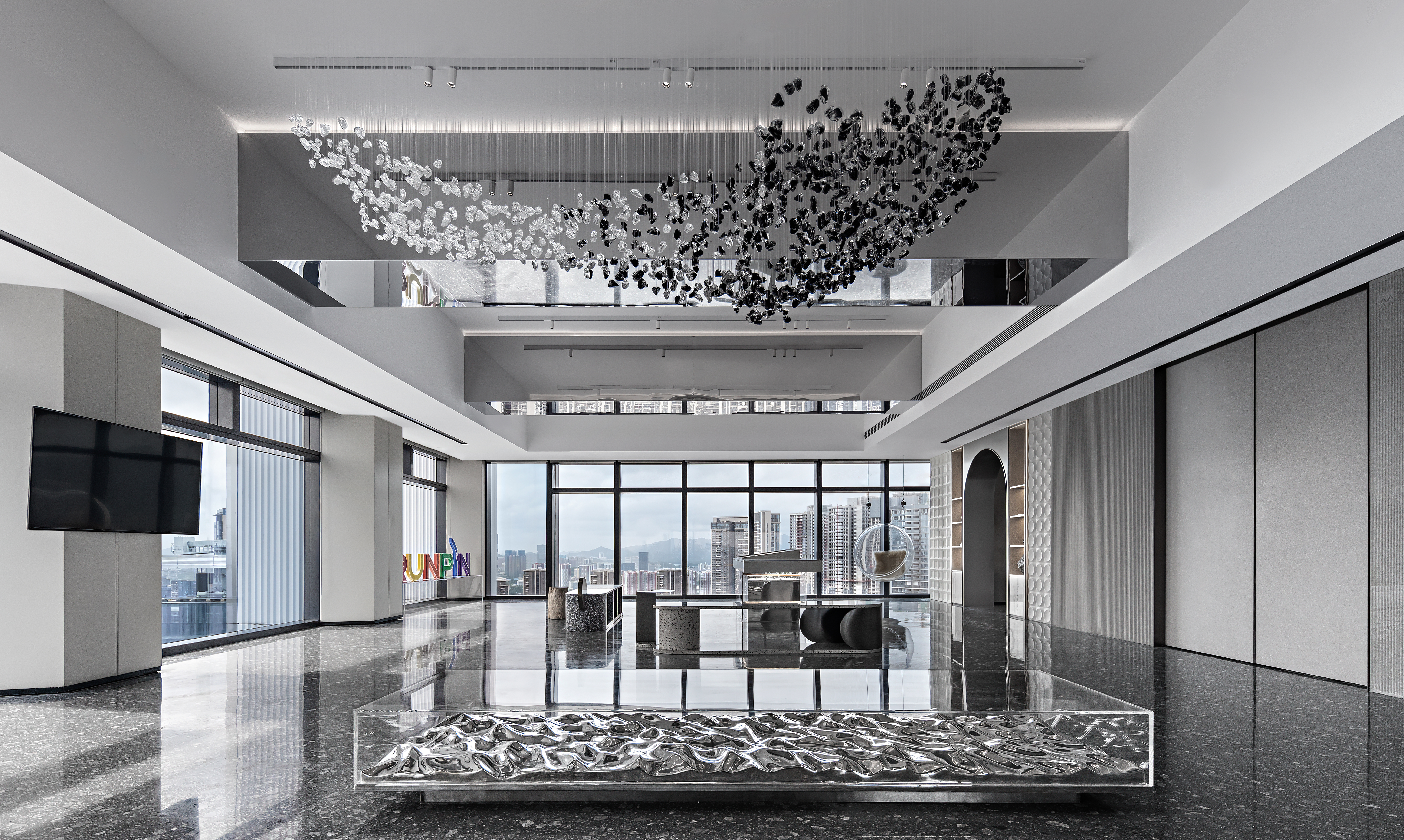 룬핀후이 스토어는 CR 시멘트를 전 세계에 선보이기 위한 소통의 창구다. ‘런핀’은 중국의 인공 석재 산업 브랜드로, 선전에 브랜드의 역사를 보여주고 자신들의 제품들을 선보일 공간을 마련했다. 디자인팀은 인공 석재 제품의 정교함과 희소성을 돋보이도록 공간을 디자인했다. ‘쿤’이라는 중국의 전통문화의 등장하는 신화적 물고기를 콘셉트가 돌의 매끄러운 느낌과 함께 사용됐다. 유리 돌로 만든 ‘쿤’의 형태가 천장에 매달려 있으며, 이는 더 높은 곳을 향하는 기업의 정신과 역동적인 기업의 이미지를 상징한다. 개방적이고 반짝이는 공간들이 미래 도시에 대한 상상력을 불러일으키며 기업 이미지에 호감을 더한다.