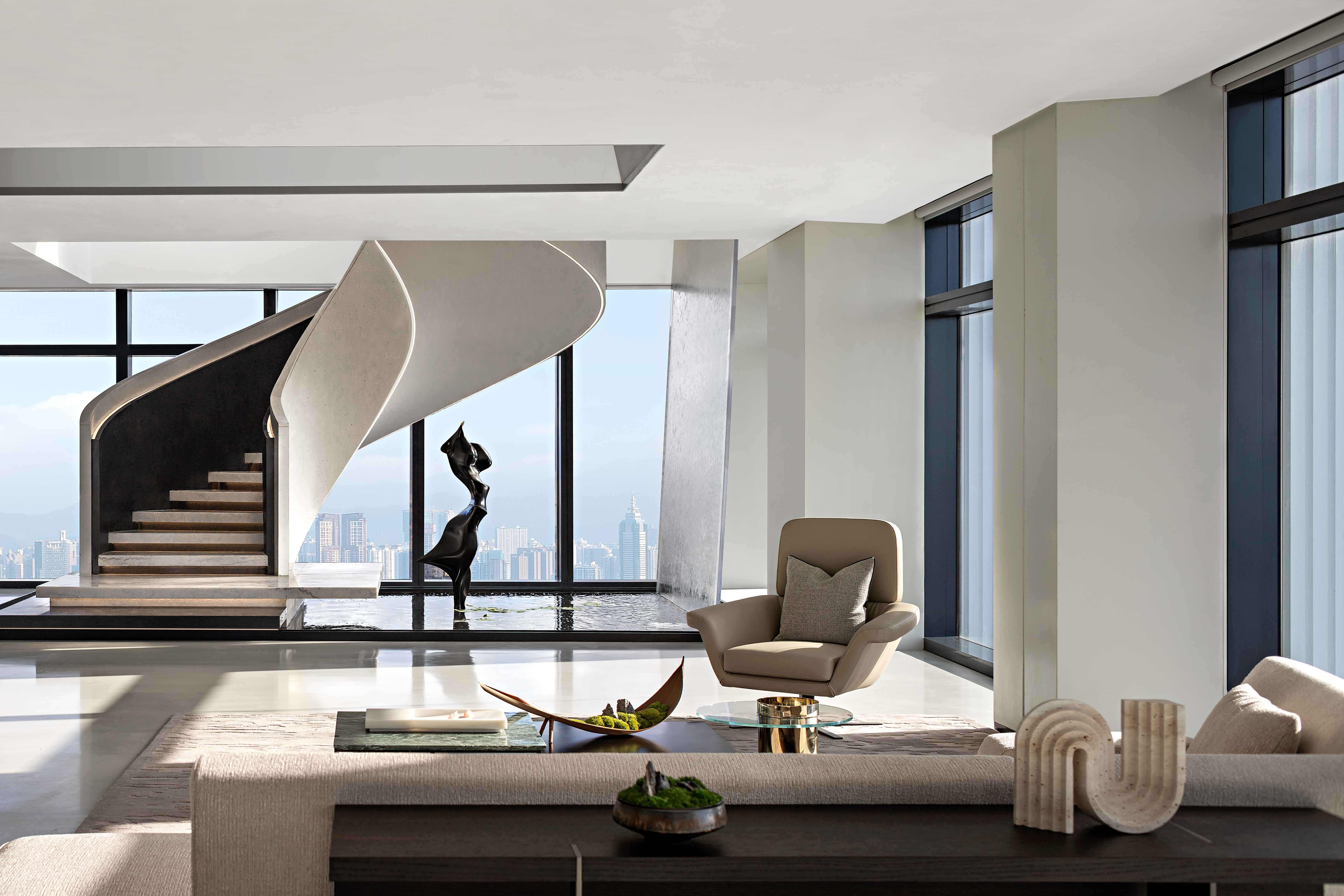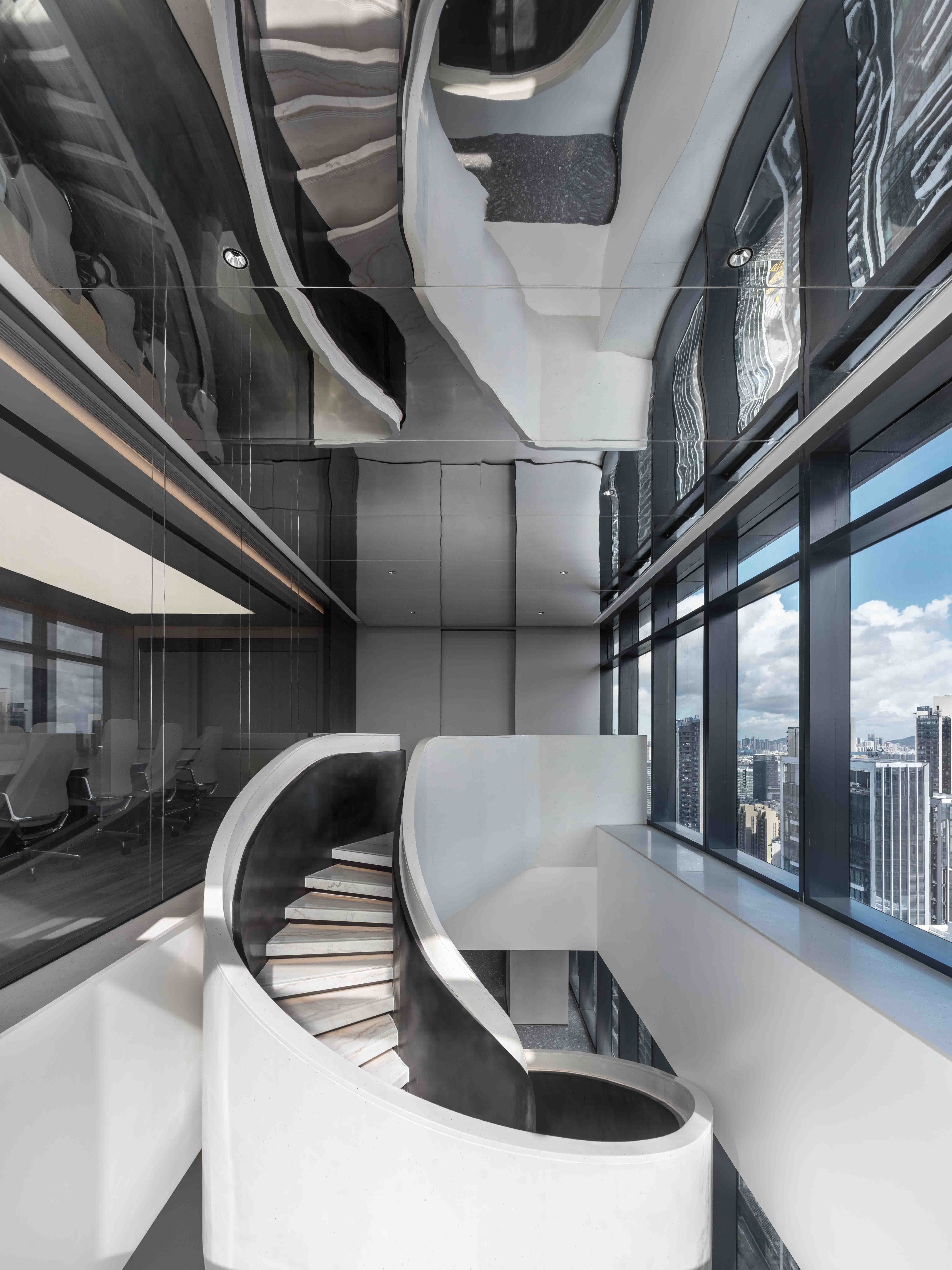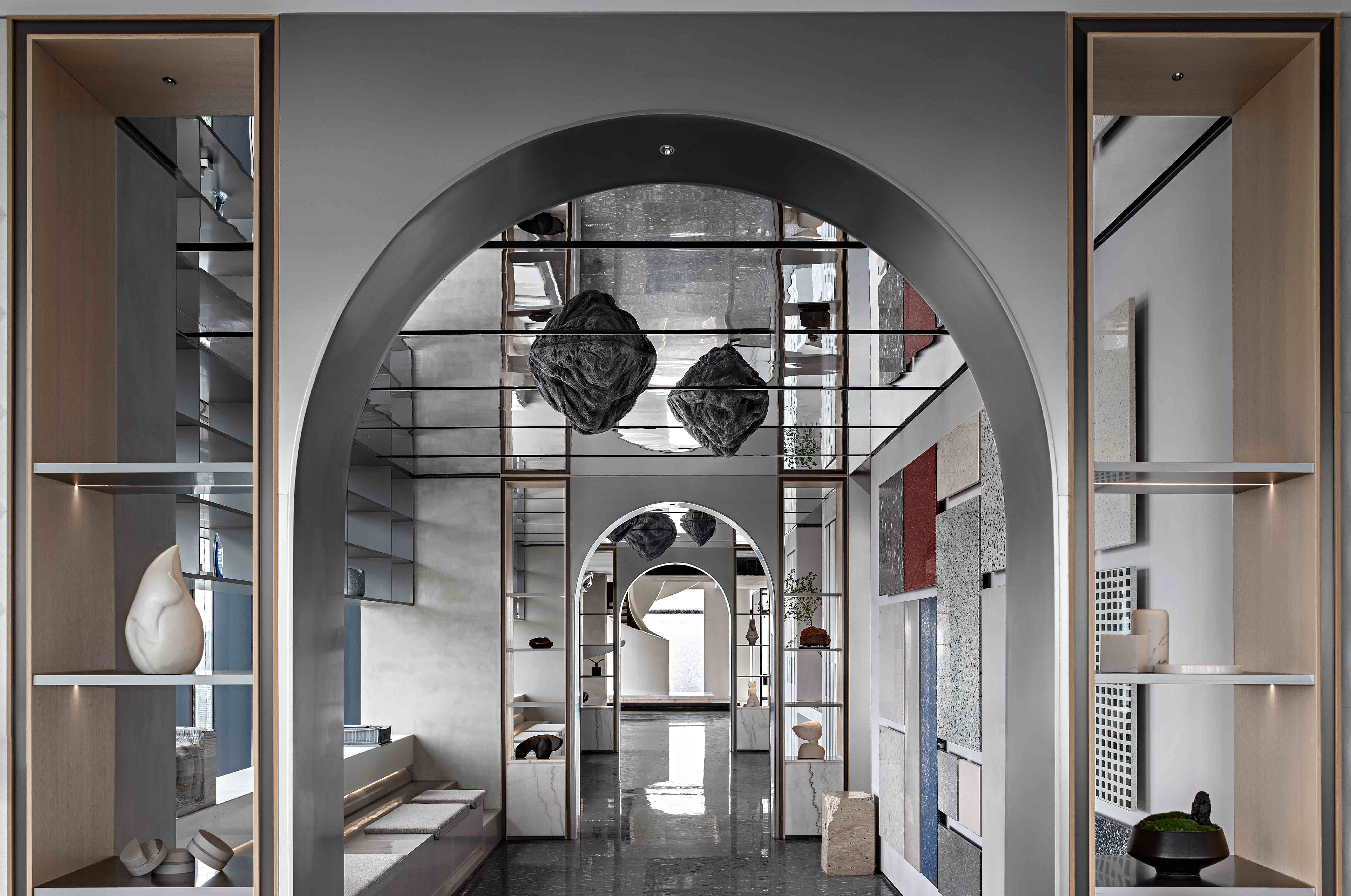 룬핀후이 스토어는 CR 시멘트를 전 세계에 선보이기 위한 소통의 창구다. ‘런핀’은 중국의 인공 석재 산업 브랜드로, 선전에 브랜드의 역사를 보여주고 자신들의 제품들을 선보일 공간을 마련했다. 디자인팀은 인공 석재 제품의 정교함과 희소성을 돋보이도록 공간을 디자인했다. ‘쿤’이라는 중국의 전통문화의 등장하는 신화적 물고기를 콘셉트가 돌의 매끄러운 느낌과 함께 사용됐다. 유리 돌로 만든 ‘쿤’의 형태가 천장에 매달려 있으며, 이는 더 높은 곳을 향하는 기업의 정신과 역동적인 기업의 이미지를 상징한다. 개방적이고 반짝이는 공간들이 미래 도시에 대한 상상력을 불러일으키며 기업 이미지에 호감을 더한다.