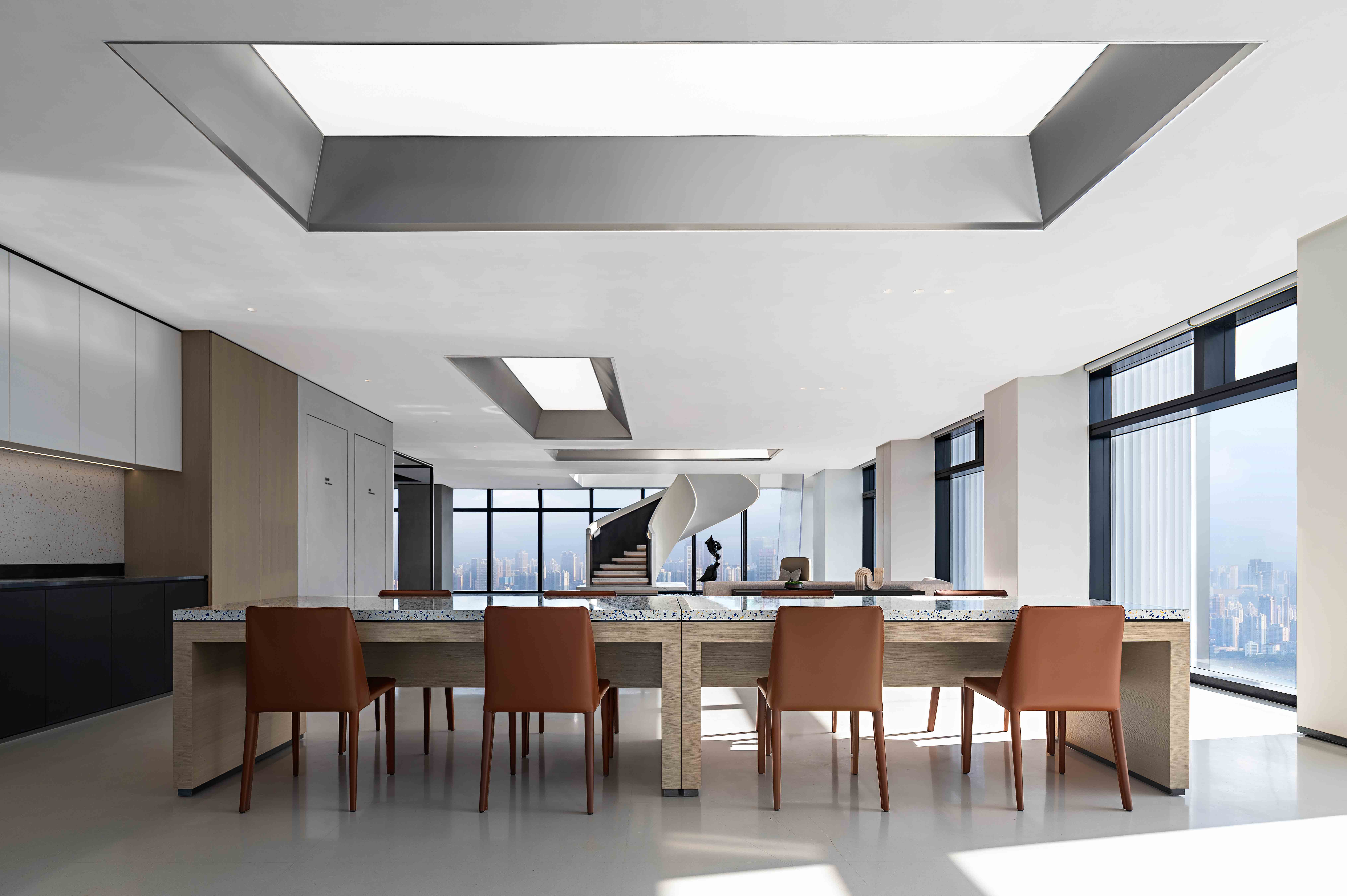 룬핀후이 스토어는 CR 시멘트를 전 세계에 선보이기 위한 소통의 창구다. ‘런핀’은 중국의 인공 석재 산업 브랜드로, 선전에 브랜드의 역사를 보여주고 자신들의 제품들을 선보일 공간을 마련했다. 디자인팀은 인공 석재 제품의 정교함과 희소성을 돋보이도록 공간을 디자인했다. ‘쿤’이라는 중국의 전통문화의 등장하는 신화적 물고기를 콘셉트가 돌의 매끄러운 느낌과 함께 사용됐다. 유리 돌로 만든 ‘쿤’의 형태가 천장에 매달려 있으며, 이는 더 높은 곳을 향하는 기업의 정신과 역동적인 기업의 이미지를 상징한다. 개방적이고 반짝이는 공간들이 미래 도시에 대한 상상력을 불러일으키며 기업 이미지에 호감을 더한다.