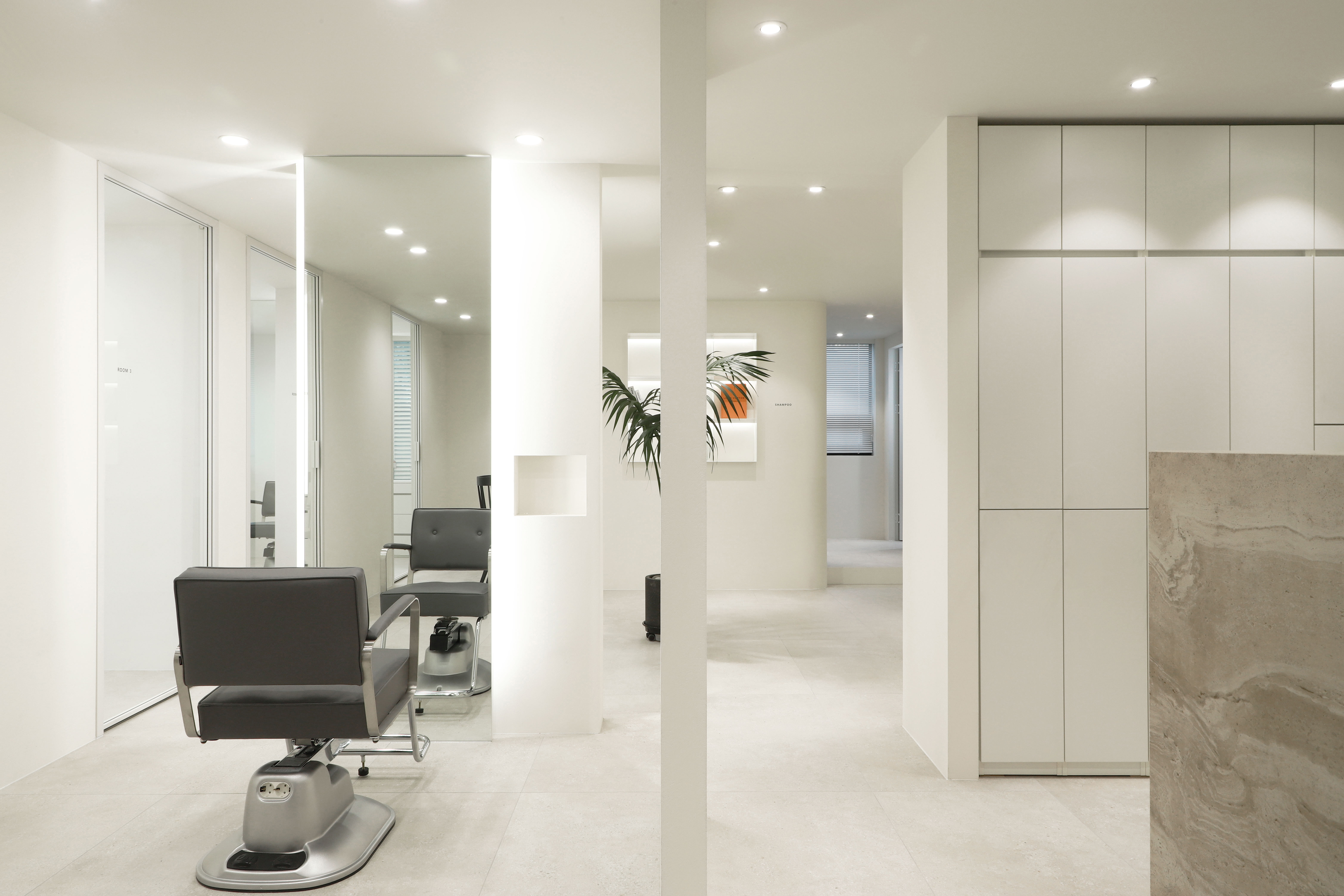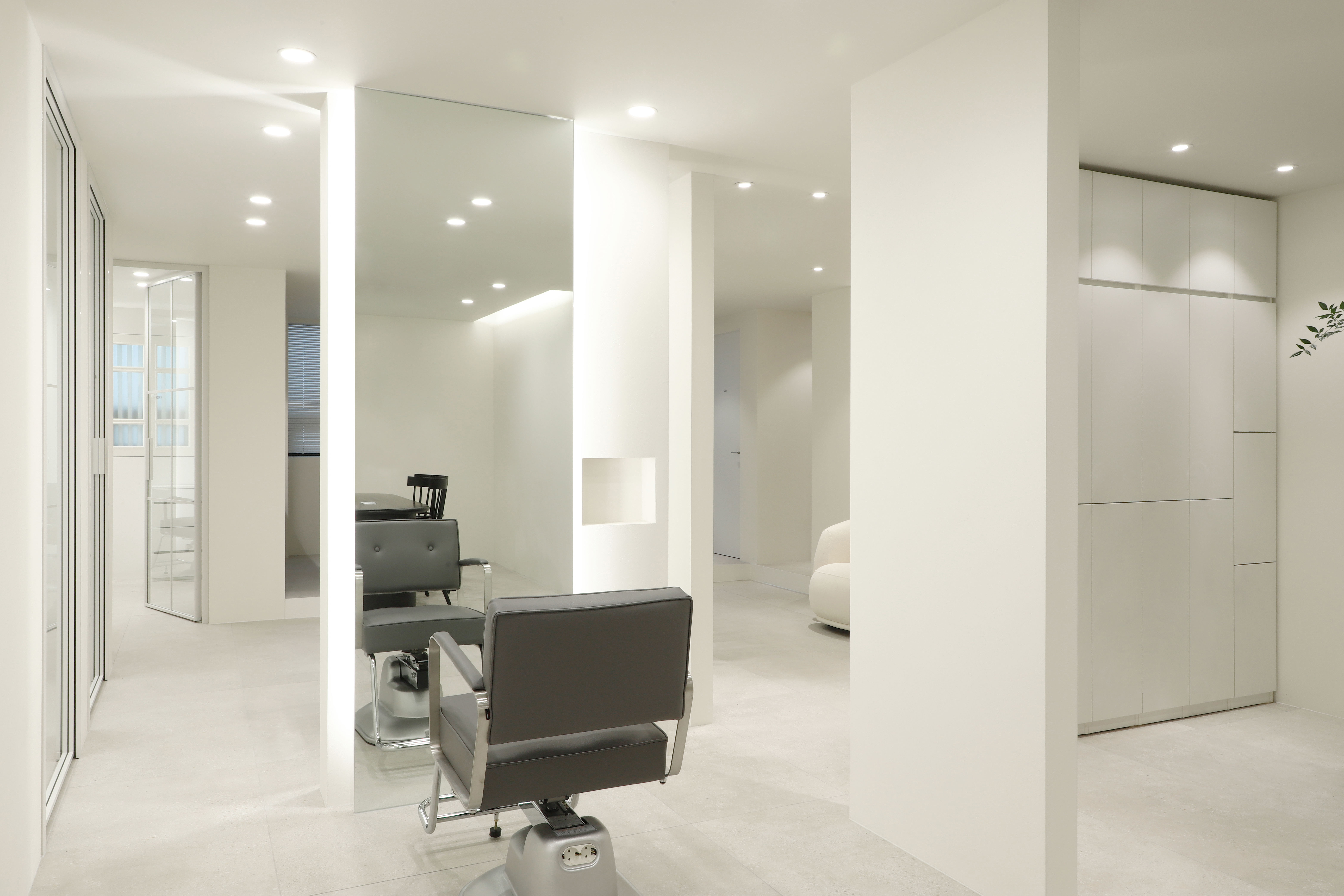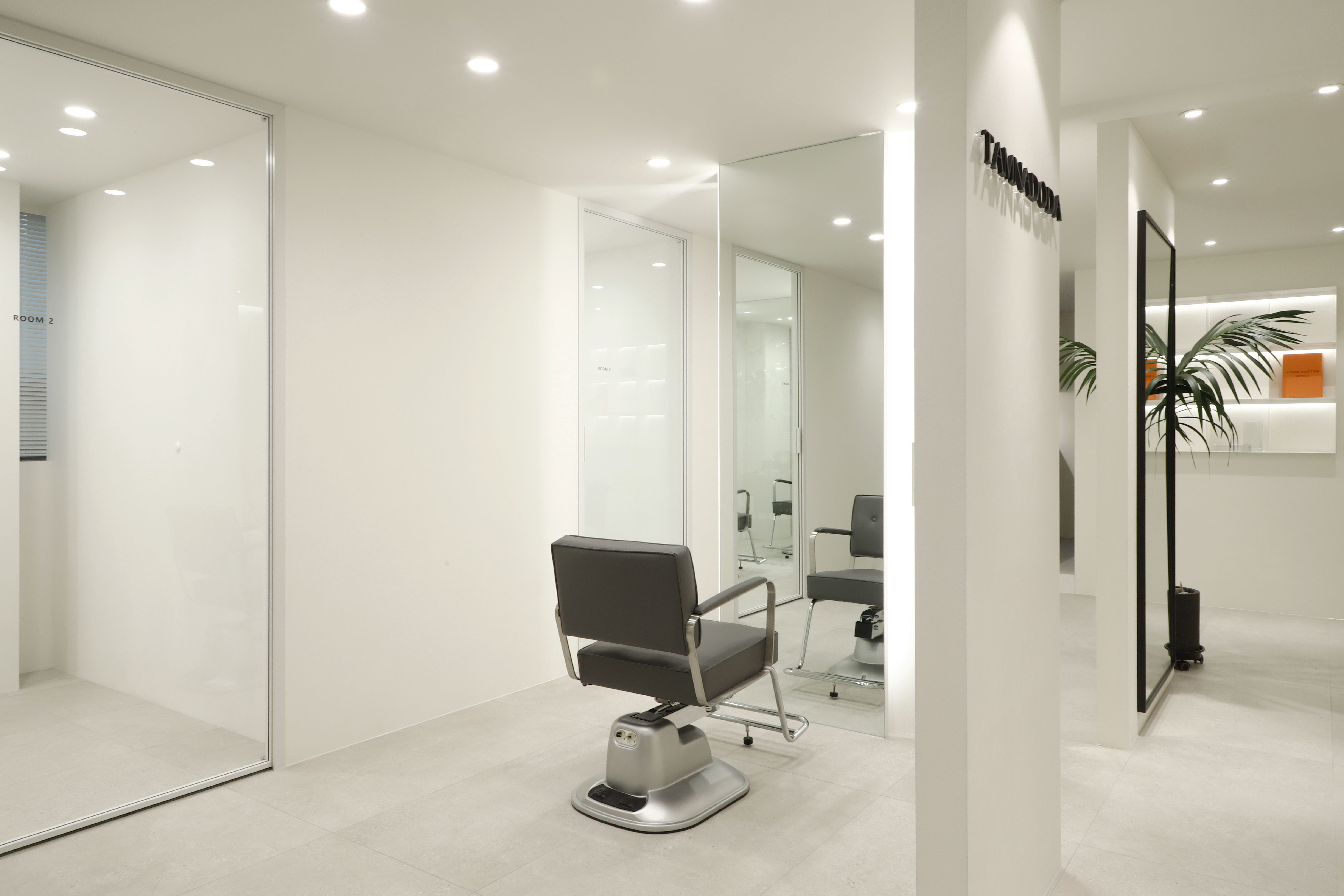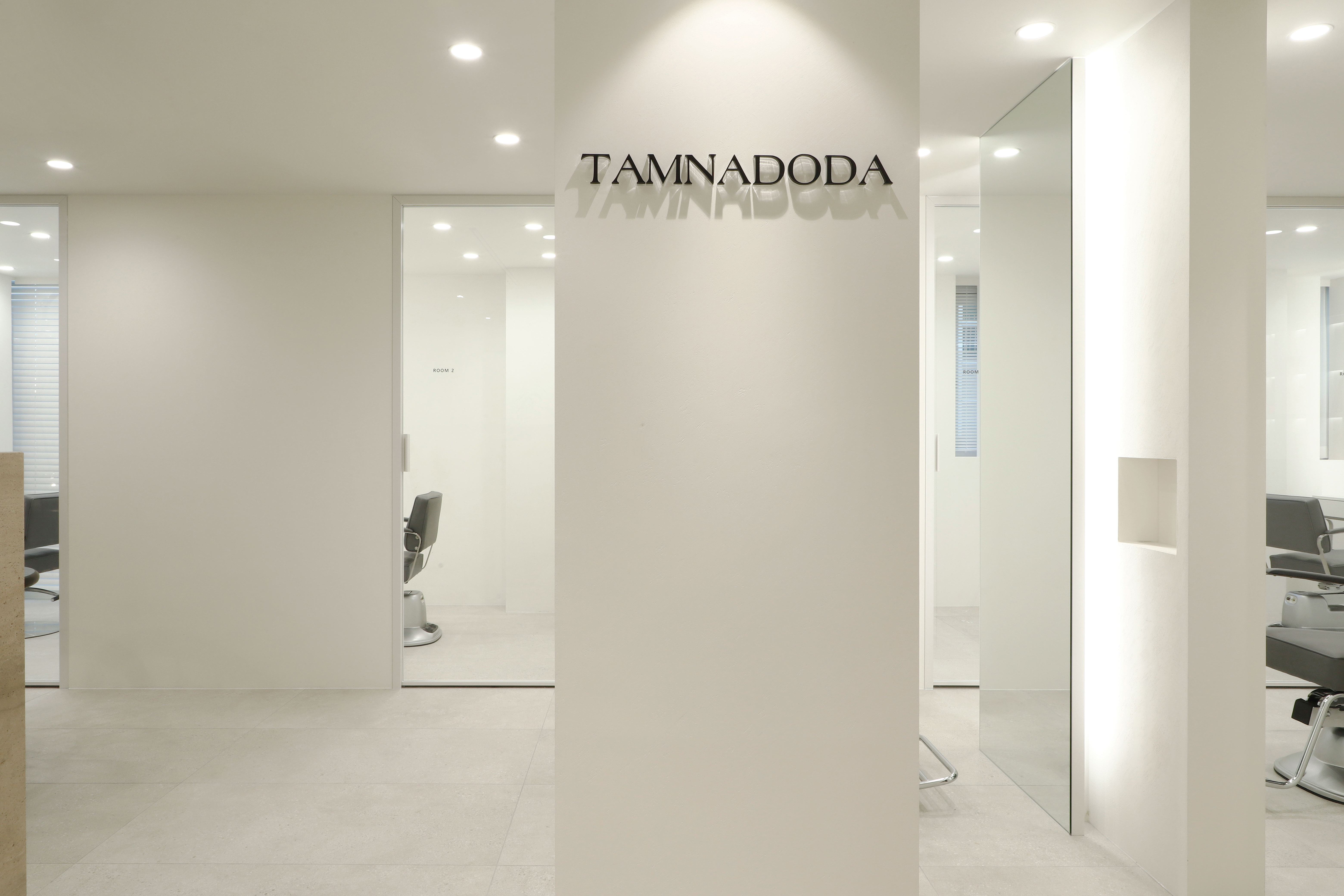 TAMNADODA is a hair salon specializing in hair extensions in Korea. We were involved in the interior design of TAMNADODA Cheongdam branch. Based on the client's needs, Design Studio Mono have created a private room- type hair salon that is out of the general structure. Cut rooms and open cut area, reception, waiting area, staff room, shampoo room, laundry room and storage had to be built in 115m² area. In addition, the design was carried out in consideration of facilities, equipment, and the flow of customers and staff. It was important to design as many private cut rooms as possible in the space. Considering using hair products, we chose the layout using windows and built an duct system. Each of the other rooms was constructed with a focus on functionality. The client preferred a configuration with straight lines and decoration excluded. So we tried to express linear space based on structural beauty. The space has been completed like a gallery that can clearly express the beautiful changes of customers. We hope it will be a space where customers can focus on their own beauty and feel comfortable.