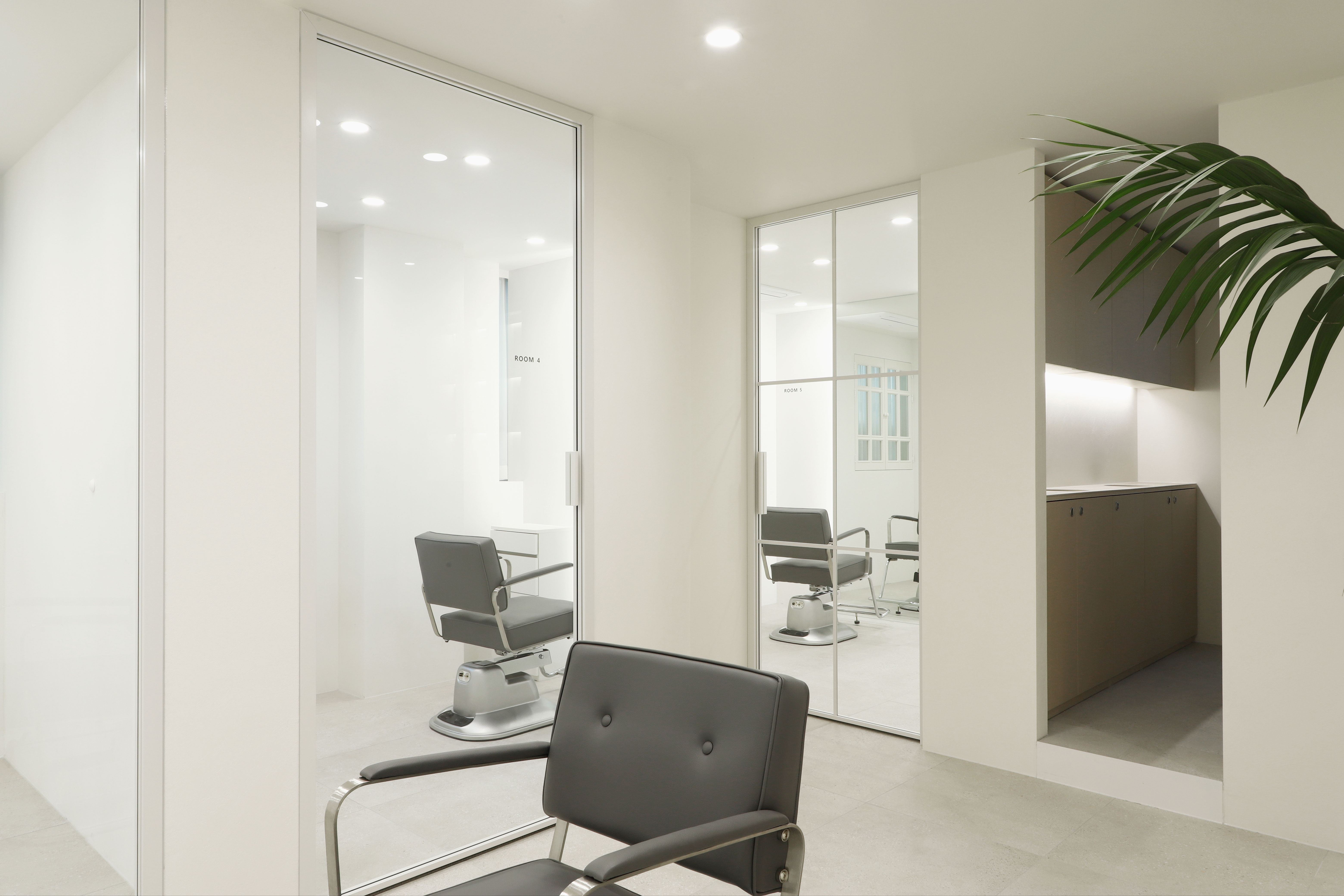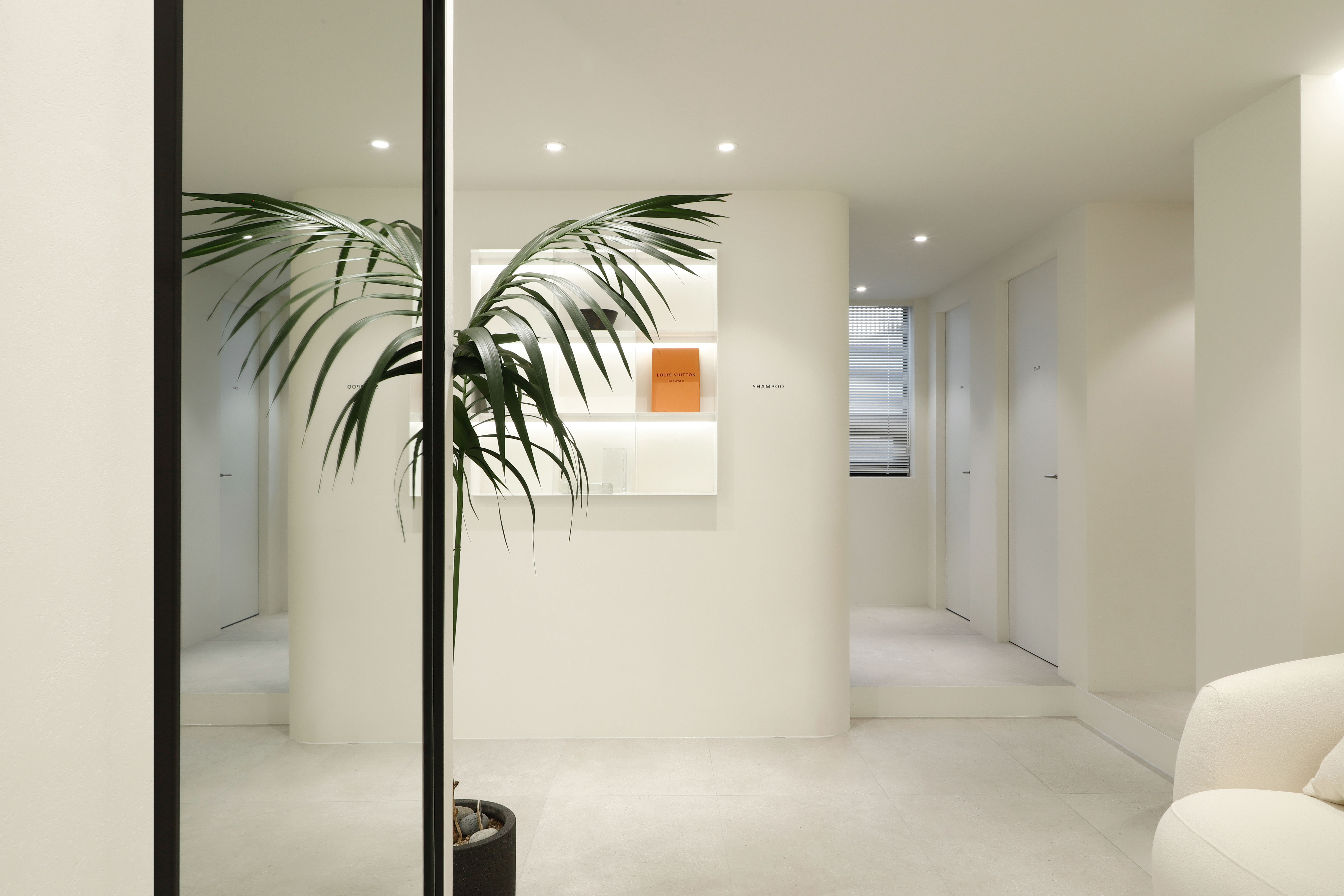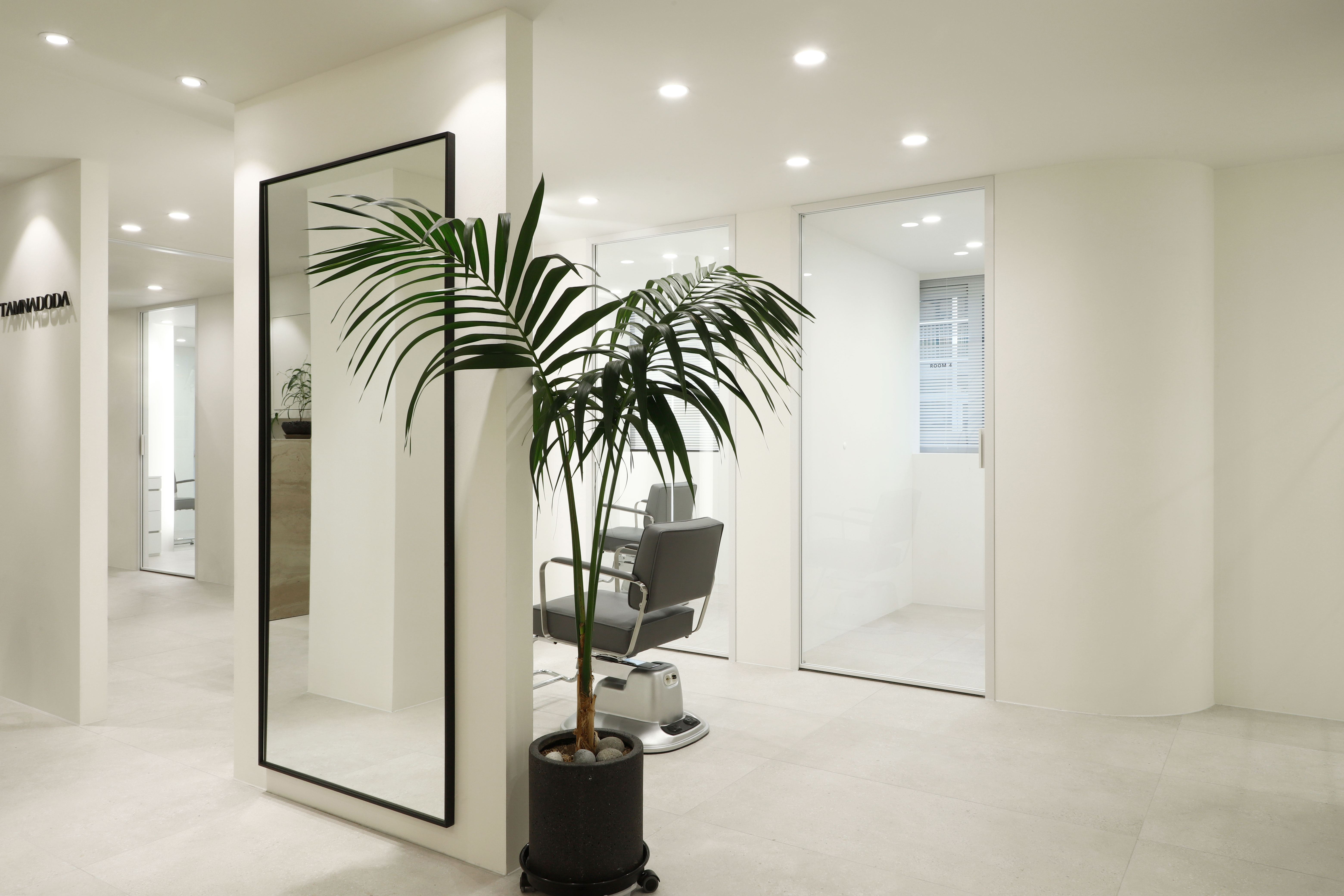 TAMNADODA is a hair salon specializing in hair extensions in Korea. We were involved in the interior design of TAMNADODA Cheongdam branch. Based on the client's needs, Design Studio Mono have created a private room- type hair salon that is out of the general structure. Cut rooms and open cut area, reception, waiting area, staff room, shampoo room, laundry room and storage had to be built in 115m² area. In addition, the design was carried out in consideration of facilities, equipment, and the flow of customers and staff. It was important to design as many private cut rooms as possible in the space. Considering using hair products, we chose the layout using windows and built an duct system. Each of the other rooms was constructed with a focus on functionality. The client preferred a configuration with straight lines and decoration excluded. So we tried to express linear space based on structural beauty. The space has been completed like a gallery that can clearly express the beautiful changes of customers. We hope it will be a space where customers can focus on their own beauty and feel comfortable.