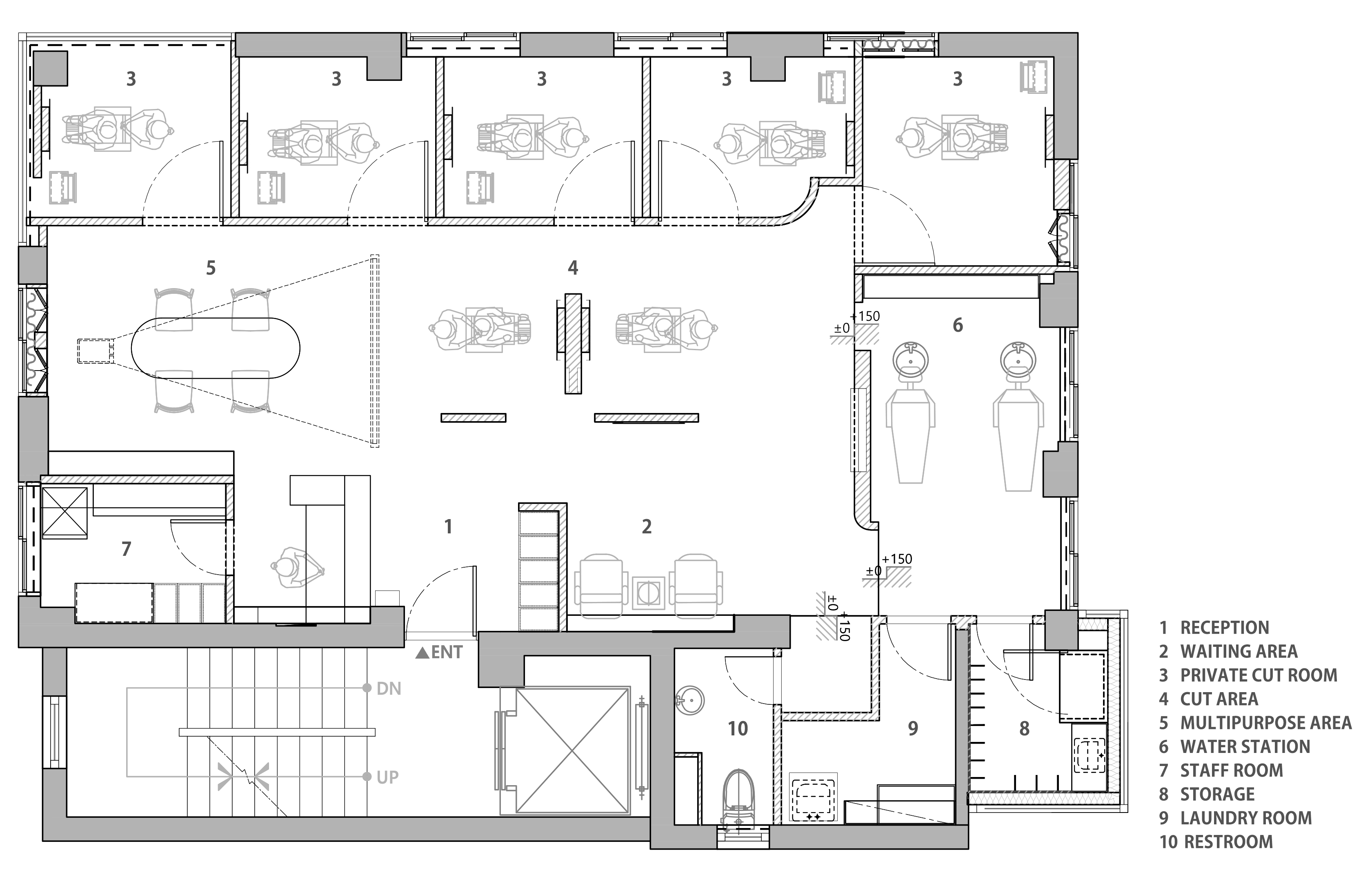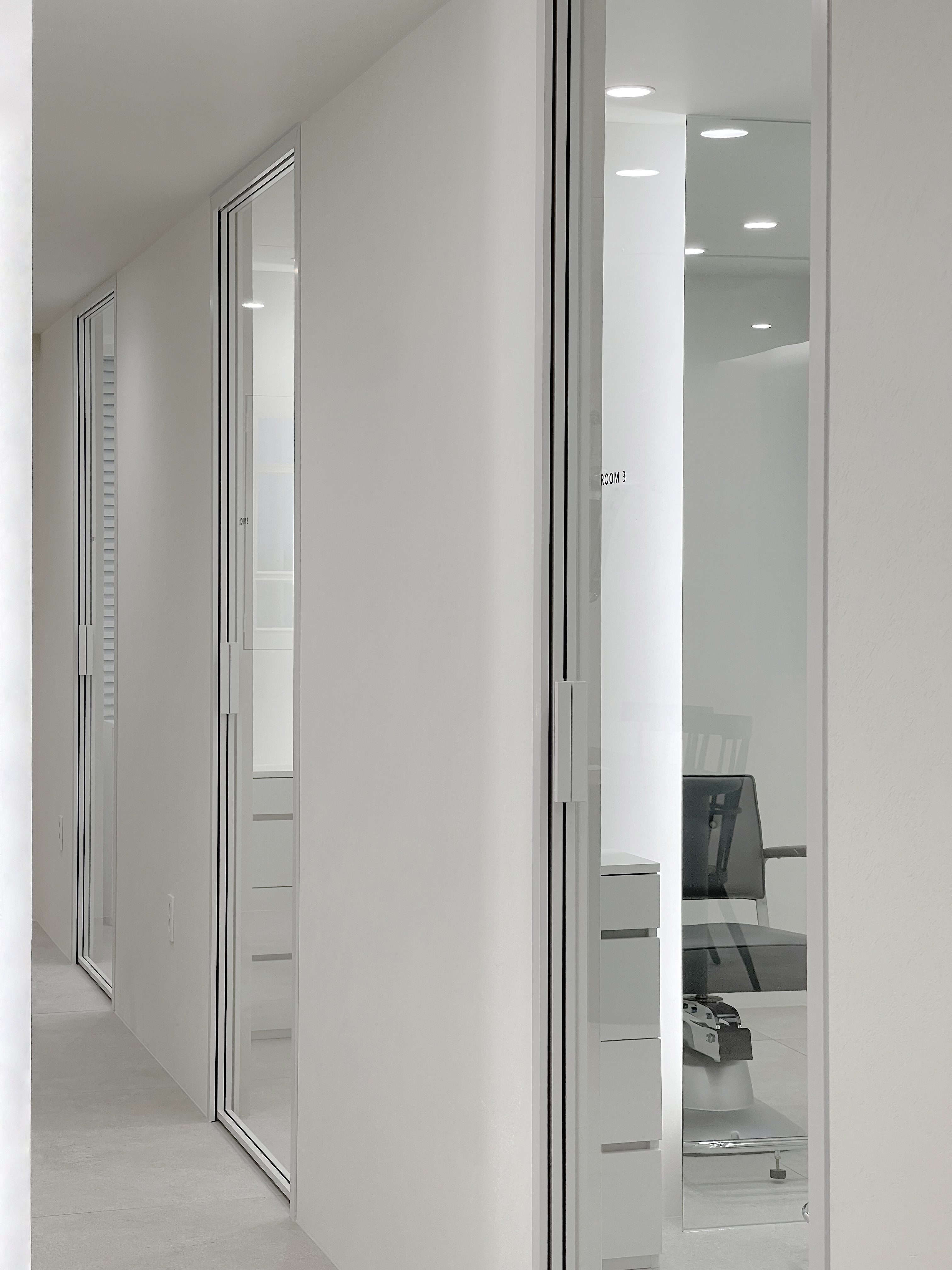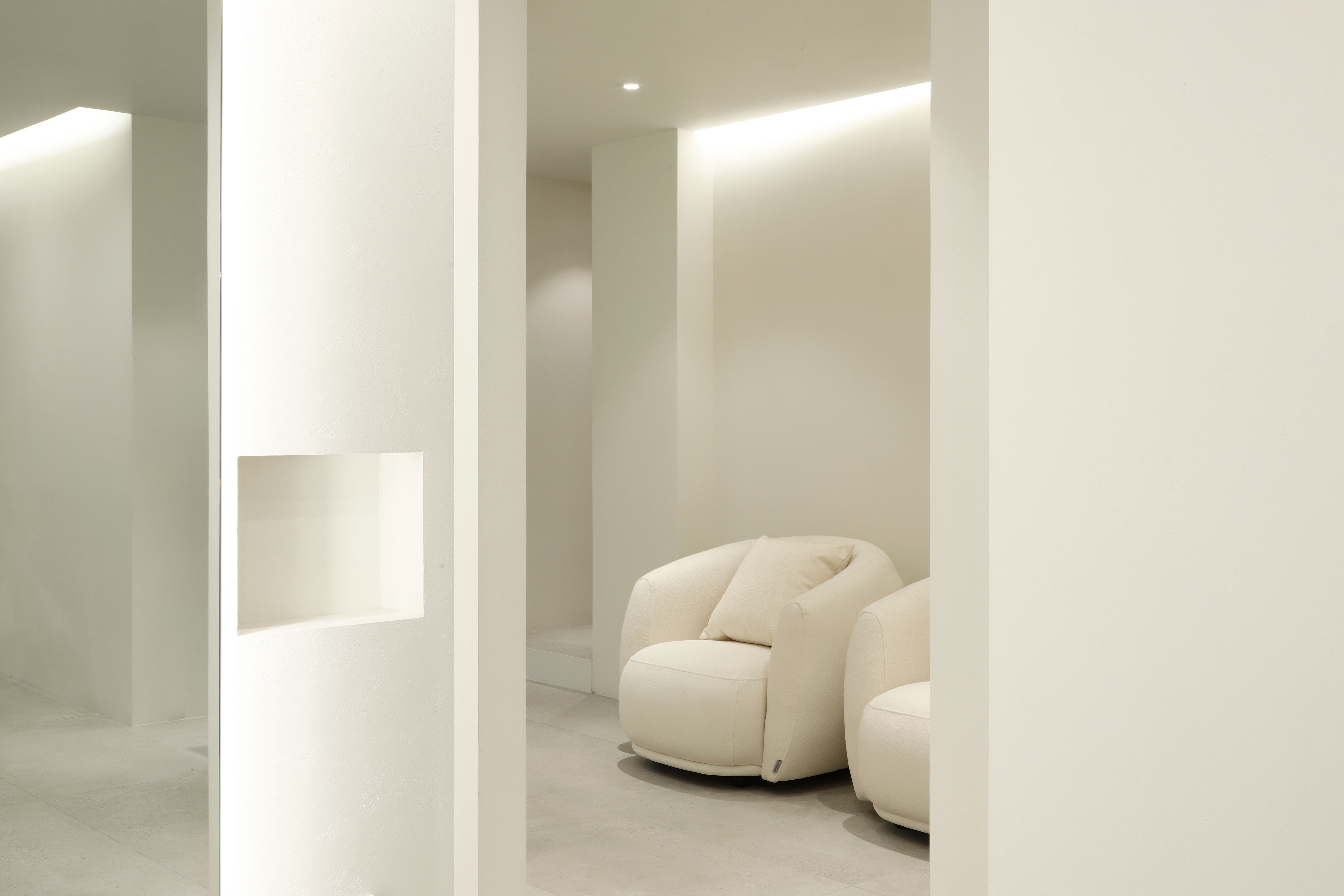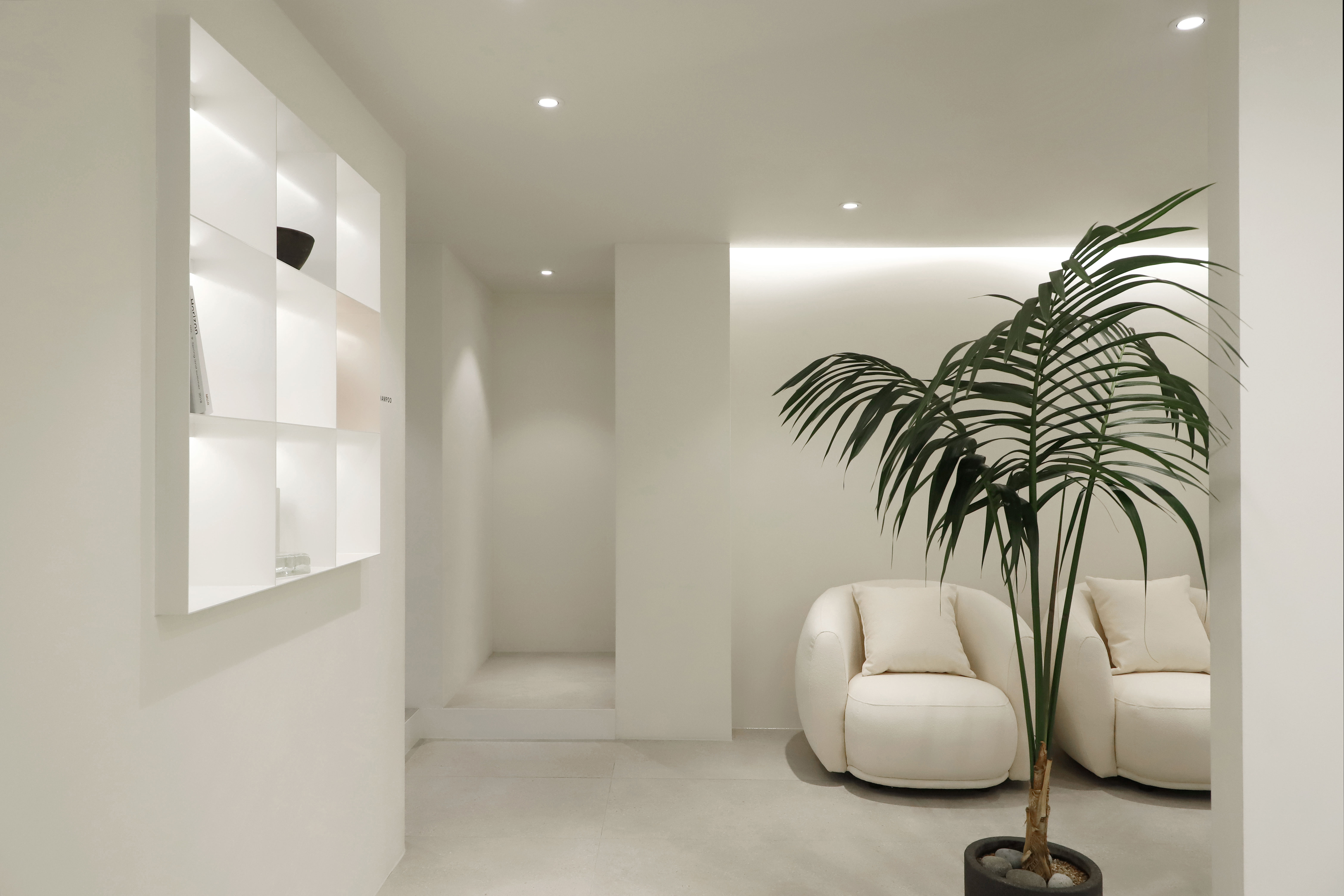 TAMNADODA is a hair salon specializing in hair extensions in Korea. We were involved in the interior design of TAMNADODA Cheongdam branch. Based on the client's needs, Design Studio Mono have created a private room- type hair salon that is out of the general structure. Cut rooms and open cut area, reception, waiting area, staff room, shampoo room, laundry room and storage had to be built in 115m² area. In addition, the design was carried out in consideration of facilities, equipment, and the flow of customers and staff. It was important to design as many private cut rooms as possible in the space. Considering using hair products, we chose the layout using windows and built an duct system. Each of the other rooms was constructed with a focus on functionality. The client preferred a configuration with straight lines and decoration excluded. So we tried to express linear space based on structural beauty. The space has been completed like a gallery that can clearly express the beautiful changes of customers. We hope it will be a space where customers can focus on their own beauty and feel comfortable.