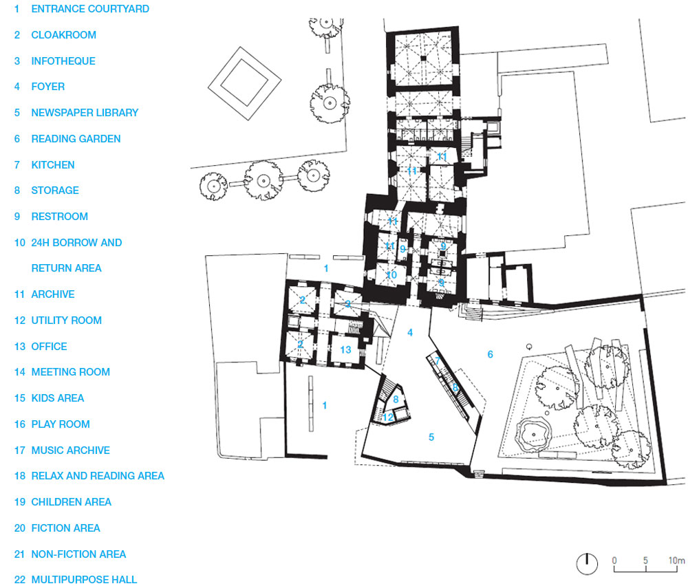 도서관은 주변 환경에 조용하고 최대한 방해되지 않게 자리잡으며, Ex 법원 남쪽, 철거 전에 교구에 속한 구역에 있었던 두 개의 기존 건물 사이에 생성된 빈 공간에 위치해 있다. 실제 연결 인프라인 새 건물은 Ex Finance 및 Ex 법원의 건물을 향해 시멘트 ‘가지’를 뻗는 ‘나무’처럼 구조적으로 작동하여 새 건물과 이전 건물 사이의 영원한 관계를 만들기 때문에 ‘문화의 나무, 쿨트르바움’이라고 부르기로 했다. 새 건축물의 1층 인포테크를 통해 건물 안으로 들어올 수 있으며, 넉넉한 4배 높이의 리셉션 공간은 엘리베이터를 통해 이용 가능하다.