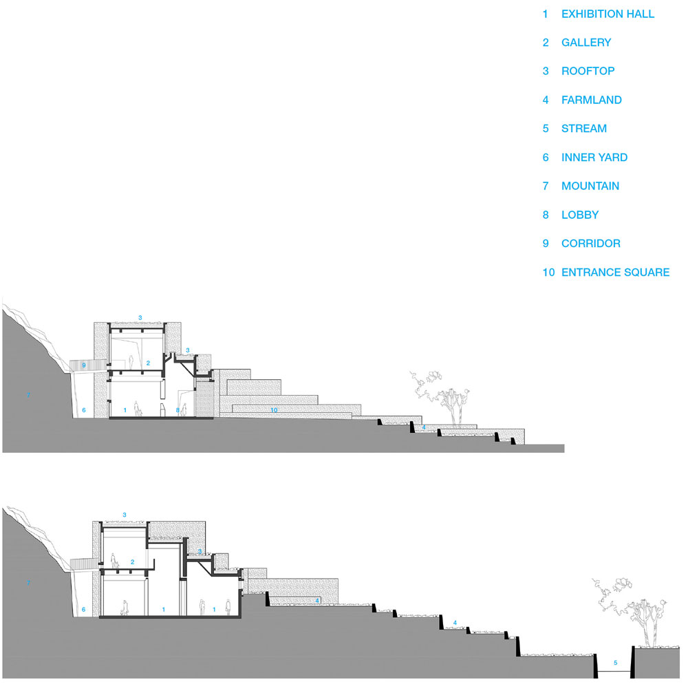 이번 프로젝트의 주요 설계 원칙은 자연을 존중하고, 환경과 조화를 이루는 것이다. 이 프로젝트는 산과 물이 가까운 아름다운 계단식 밭에 자리 잡고 있다. 외부 공간은 대지의 지형과 자연환경에 맞추어 지어졌다. 건물의 실루엣은 지형과 조화를 이루도록 계단식으로 지어졌다. 또한, 옥상에는 농작물을 심어 주변의 계단식 밭과 조화를 이룬다. 내부 공간은 외부 형태를 따라 만들어졌다. 불규칙한 벽과 엇갈린 지붕은 시골에서 볼 수 있는 다양한 골목처럼 공간마다 독특하고 다양한 변화로 가득하게 한다. 자연광이 창문과 채광창을 뚫고 벽과 바닥을 비추고, 공간마다 다양한 장면을 연출한다. 건설 과정에서 지역 재료를 선택하여 최대한 활용했다. 지역 내 경험이 풍부한 석공을 고용하고, 현지 자연석을 사용해 건물을 지었으며, 계단식 밭이라는 독특한 특징을 보여주고 있다. 단순한 기술과 방법을 사용해 건물 전체의 질감과 형태가 주변의 계단식 밭과 산과 함께 조화를 이룬다. 돌로 된 창틀과 물방울 가장자리 같은 디테일에는 장인의 세심함을 볼 수 있다. 실내 공간을 위해 선택된 재료는 질감을 그대로 드러낸다. 노출 콘크리트 천장, 흰색 규조토 벽, 나무색 문과 창을 통해 시골 건축의 원시적인 미학을 표현한다.