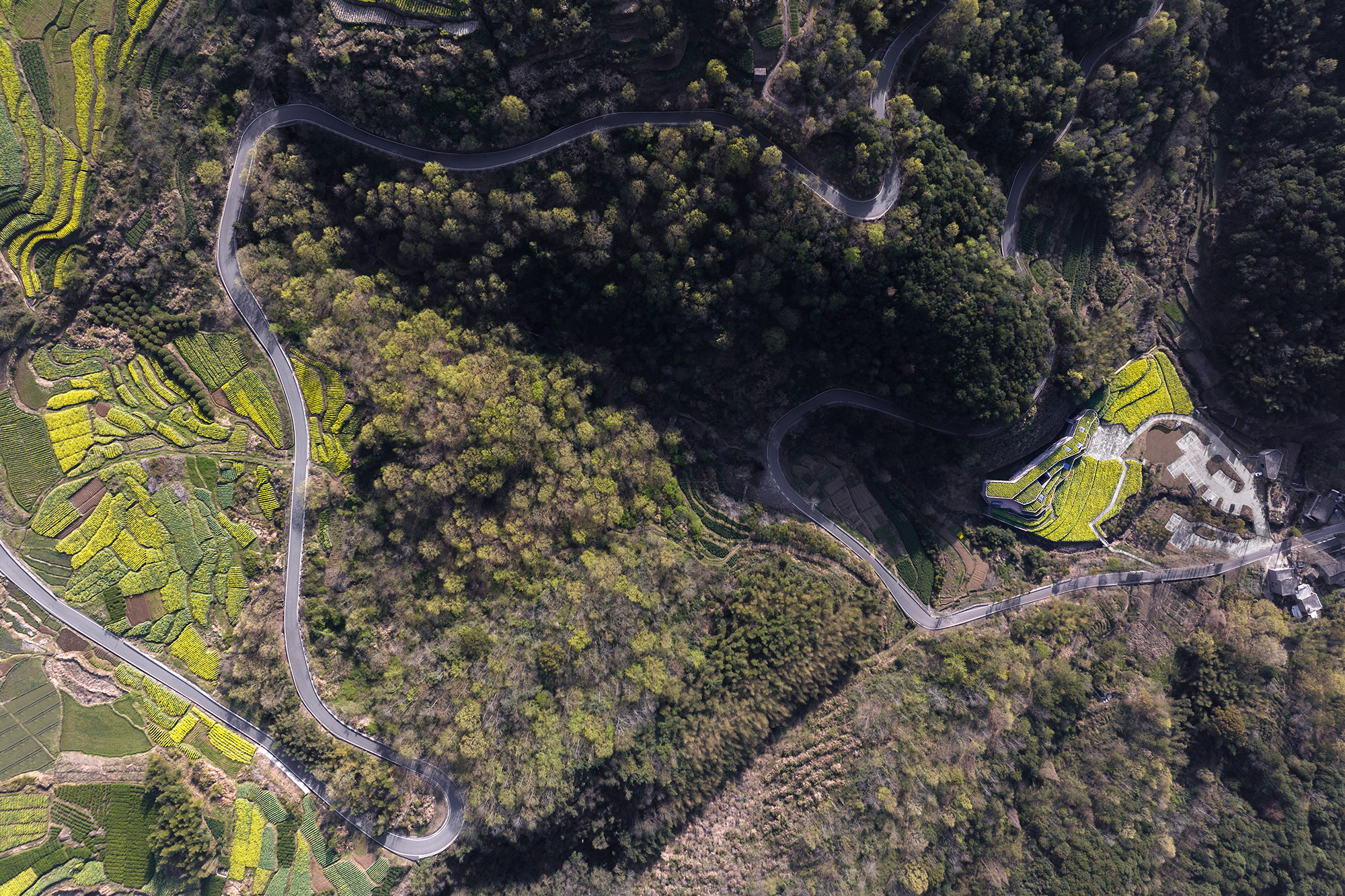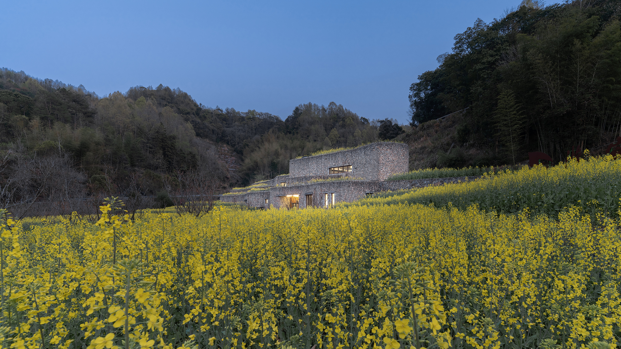 Respecting nature and blending into environment is the key design principle of the project. The project sits on beautiful terraced fields, close to mountains and water. The exterior spaces are created in a way of adapting to the site’s terrain and natural setting. The architectural silhouette conforms to the plot’s terraced landform, to blend into the environment. And the rooftops are planted with crops, to harmonize with the terraced fields nearby. The interior spaces are created in accordance with the external form. Irregular walls and staggered roofs make every space unique and full of variations, like the diverse paths in the countryside. Natural light penetrates windows and skylights, and falls onto the walls and the floor, generating varying scenes in the space. In the construction process, local materials were selected and brought into full play. Local experienced stonemasons were employed to construct the building by the use of local natural stones, to present the most original features of terraced fields. Based on simple techniques and methods, the whole building harmonizes with surrounding terraced fields and mountains both in texture and in form. Details such as stone window frames and drip edges were meticulously made by craftsmen. Materials selected for interior space reveal the authenticity of textures. The fair-faced concrete ceiling, the white diatom mud wall, and the wood-colored doors and windows, embody the primitive aesthetics of the countryside architecture.