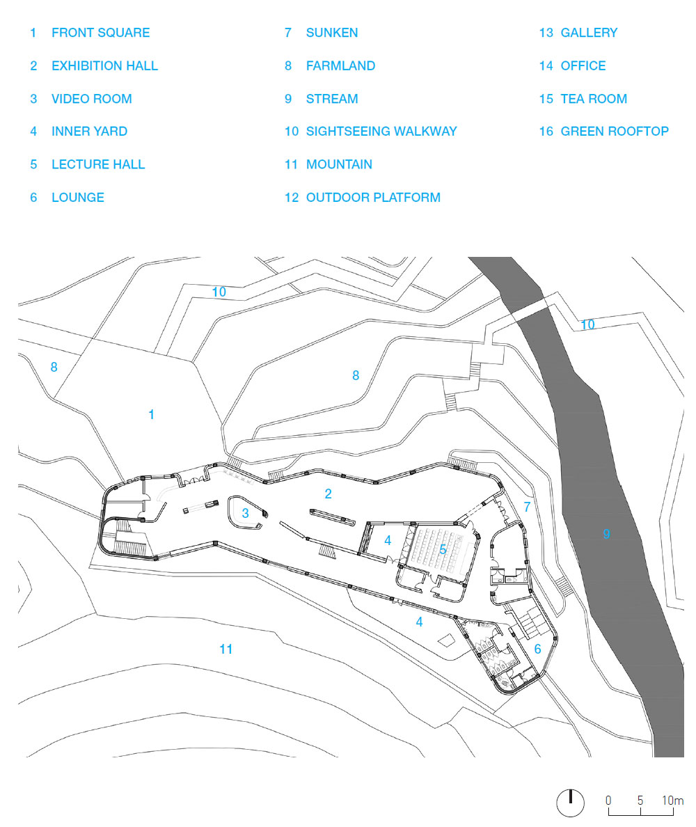 Sited at a corner of the valley, the rustic building “dissolves” into the mountain and river landscape that has been existed for centuries. Environment is a unity that integrates natural and artificial spaces with different functions. As a substantial building in such a context, the project embodies not only style and appearance, but also expresses long-standing social, cultural and technical systems and the recognition of nature and local features. The architecture features a volume that dissolves into the environment and delicate spaces crafted by appropriate techniques. The building dialogues with the surroundings such as terraced fields, creek, bridge and paths. Walking through the bridge above the stream, and approaching the building nestling under mountains, visitors will continuously encounter unexpected surprises along the way. For this project, the designers created a small cultural destination that reflects local and site features in a low-profile gesture and a vernacular form.