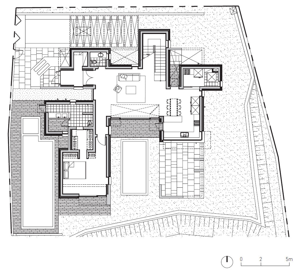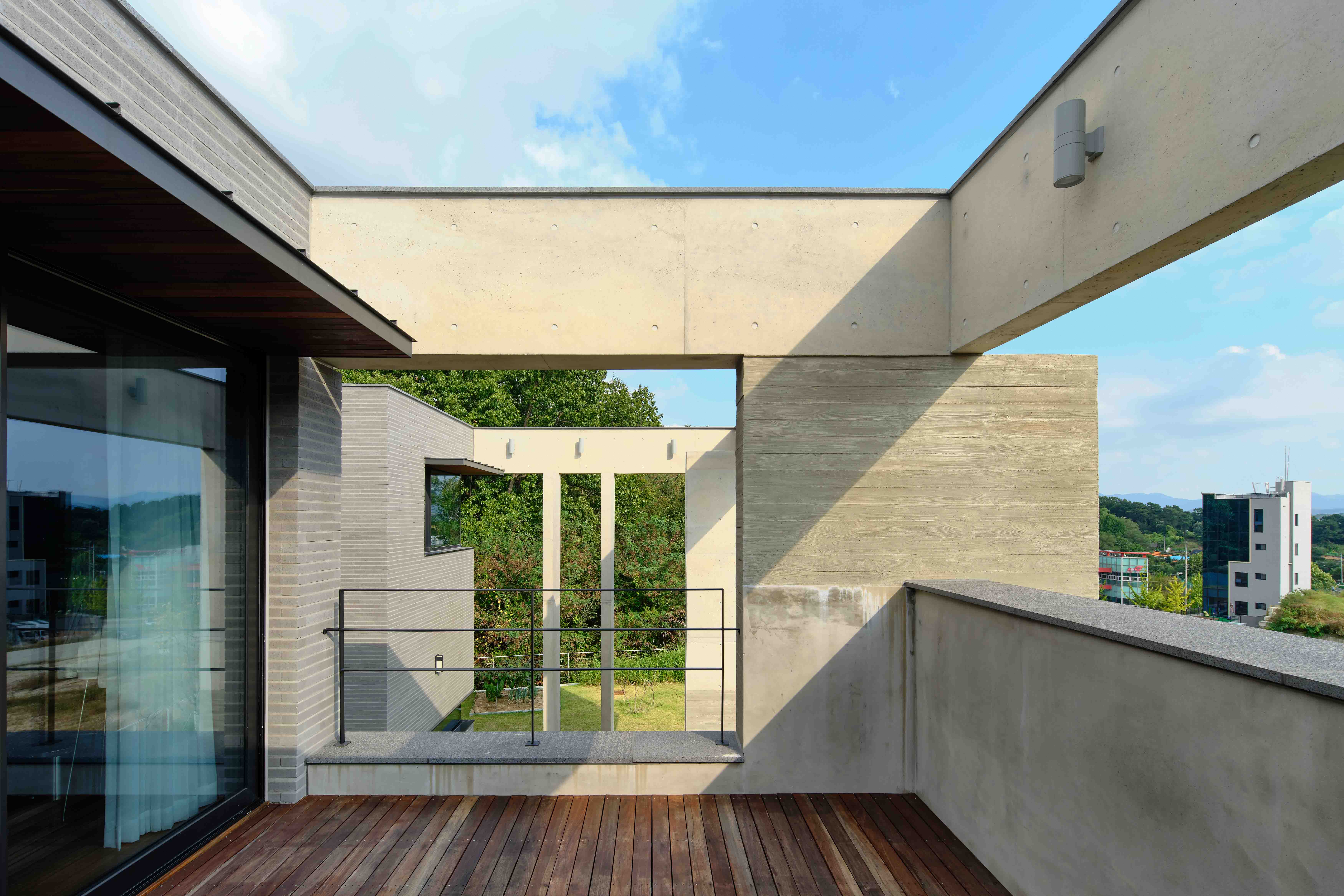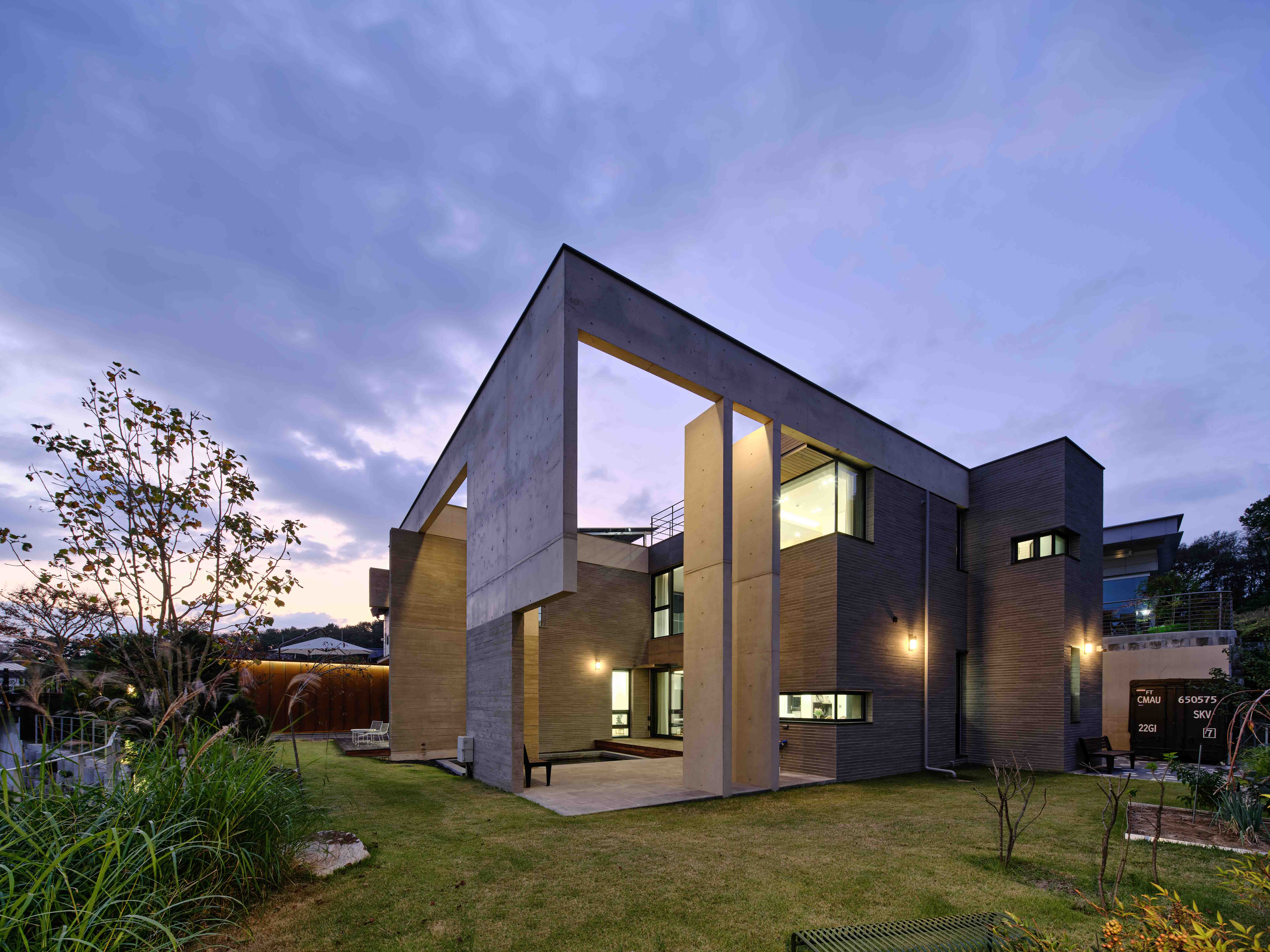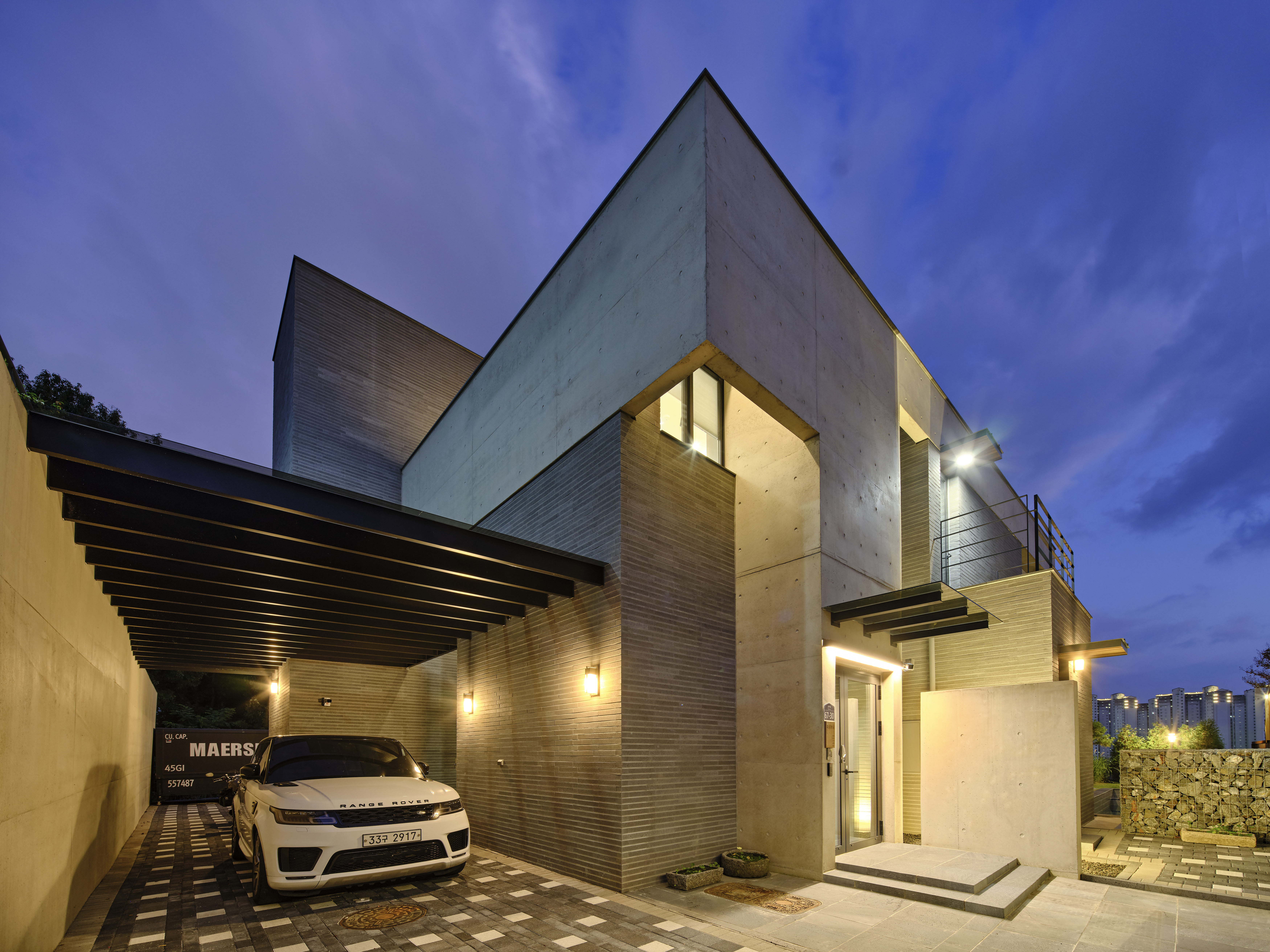 The site is located in a housing complex built at the foot of a mountain facing south in the middle of Mipyeong-dong, which lies long from east to west at the southern end of downtown Cheongju. It is located in the front, so it has an open view. The area is a little over 700 square meters, considering the building-to-land ratio of the natural green area, as is the case with most housing complexes on the outskirts of the city. There was not much room in the planar composition, and in order to overcome this, a semi-exterior space was created around the outer edge to create an external space that communicates with the inside. As a result, the narrow interior space seems to be expanded to the outside, and the landscape of the distant view is a cozy, closed exterior space from the kitchen, a strong direction from the first and second floor living rooms, and varied views to the left and right from the rooms and balconies on the second floor. It is bordered from a completely different style of house on the west side by a high oxidized steel fence, and a rectangular swimming pool is placed in between, giving space. The entryway coming in through the dead-end road was painted with lines and lighting was installed to give it a sense of vitality, and the louvers and exposed concrete side walls at the top of the parking lot continue to emphasize the entry axis. In any case, I hope it will be a place where fun and joy are endless, just like its name Hwan-hee-mu-ryang(boundless joy), given by its owner.