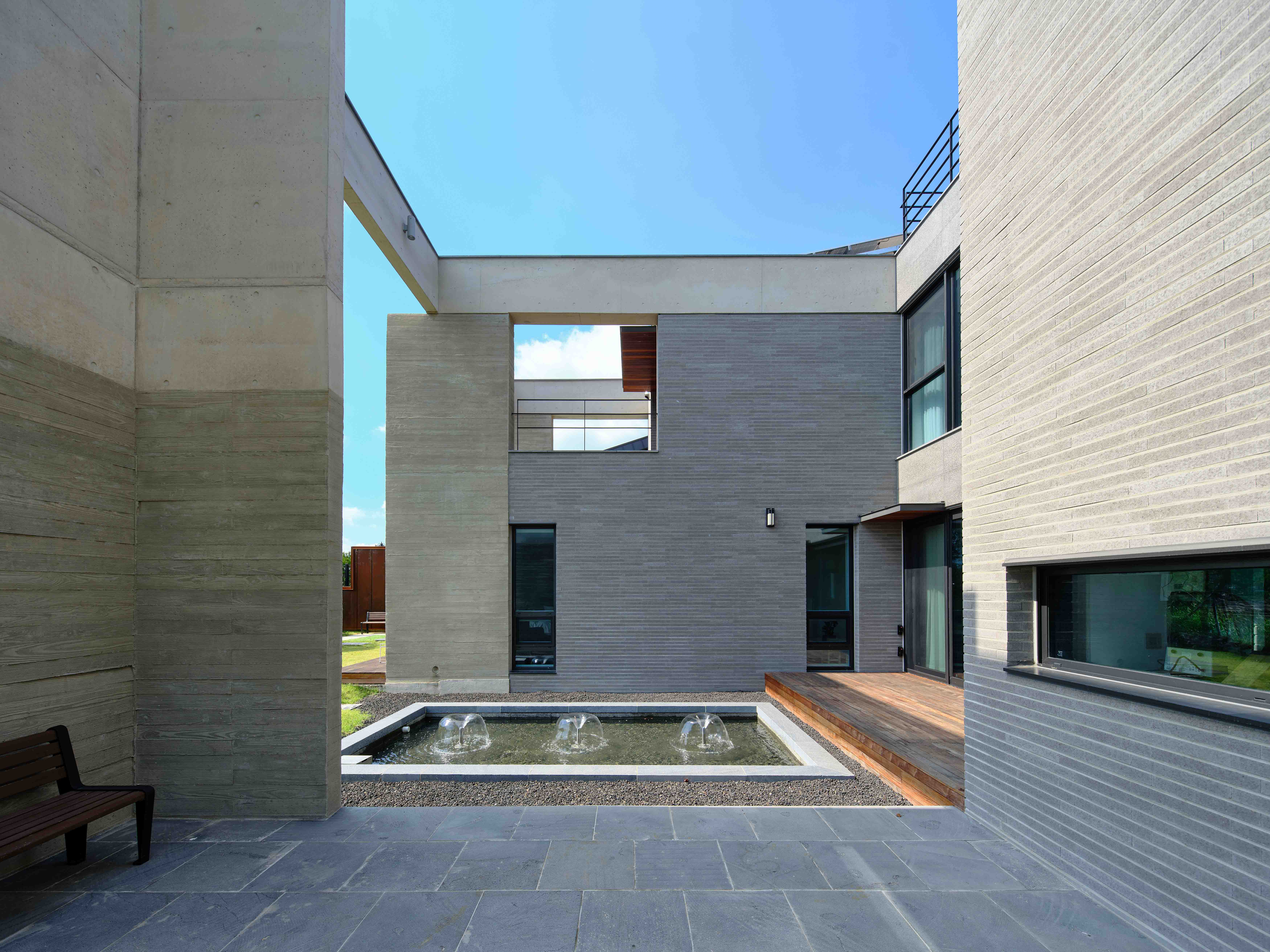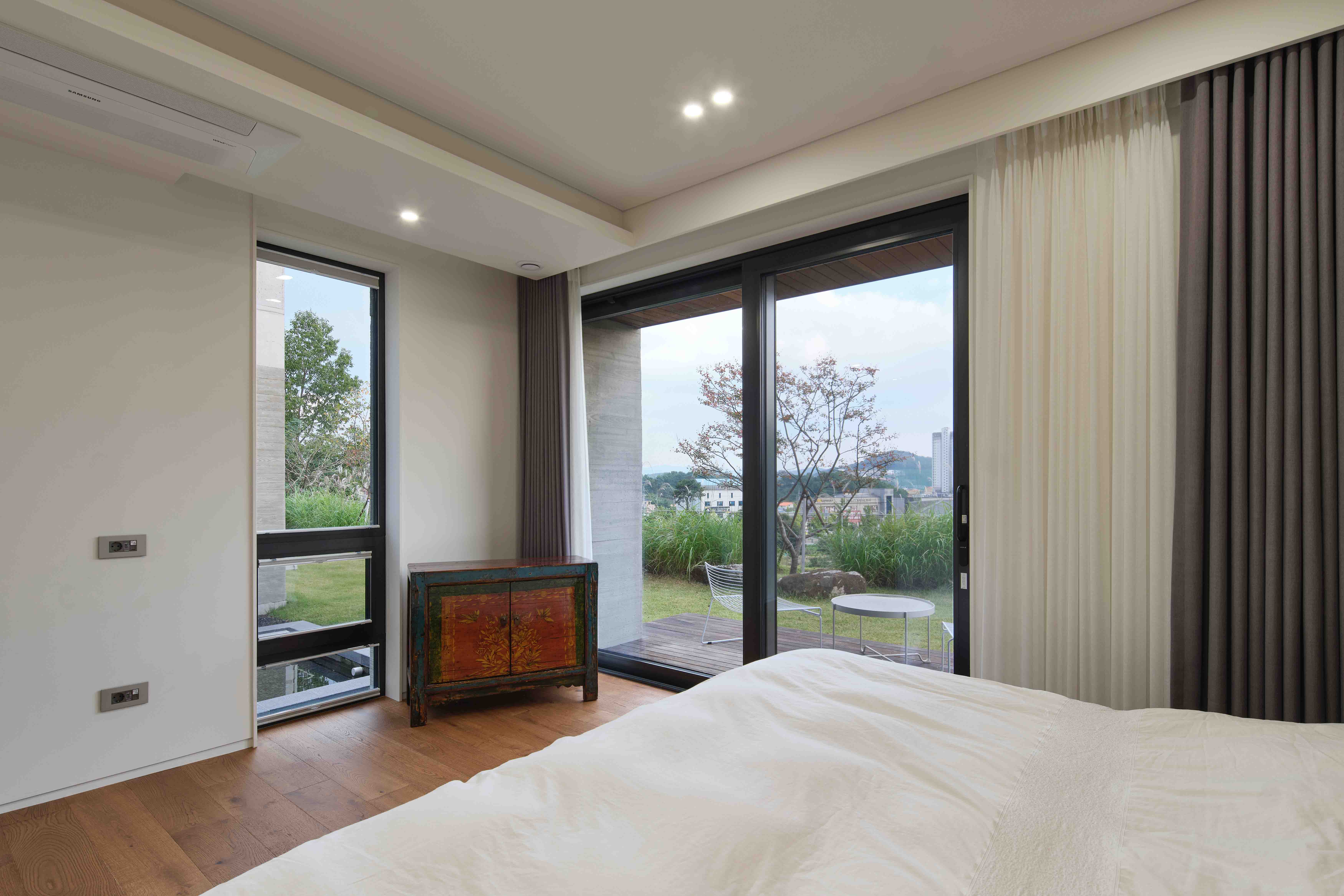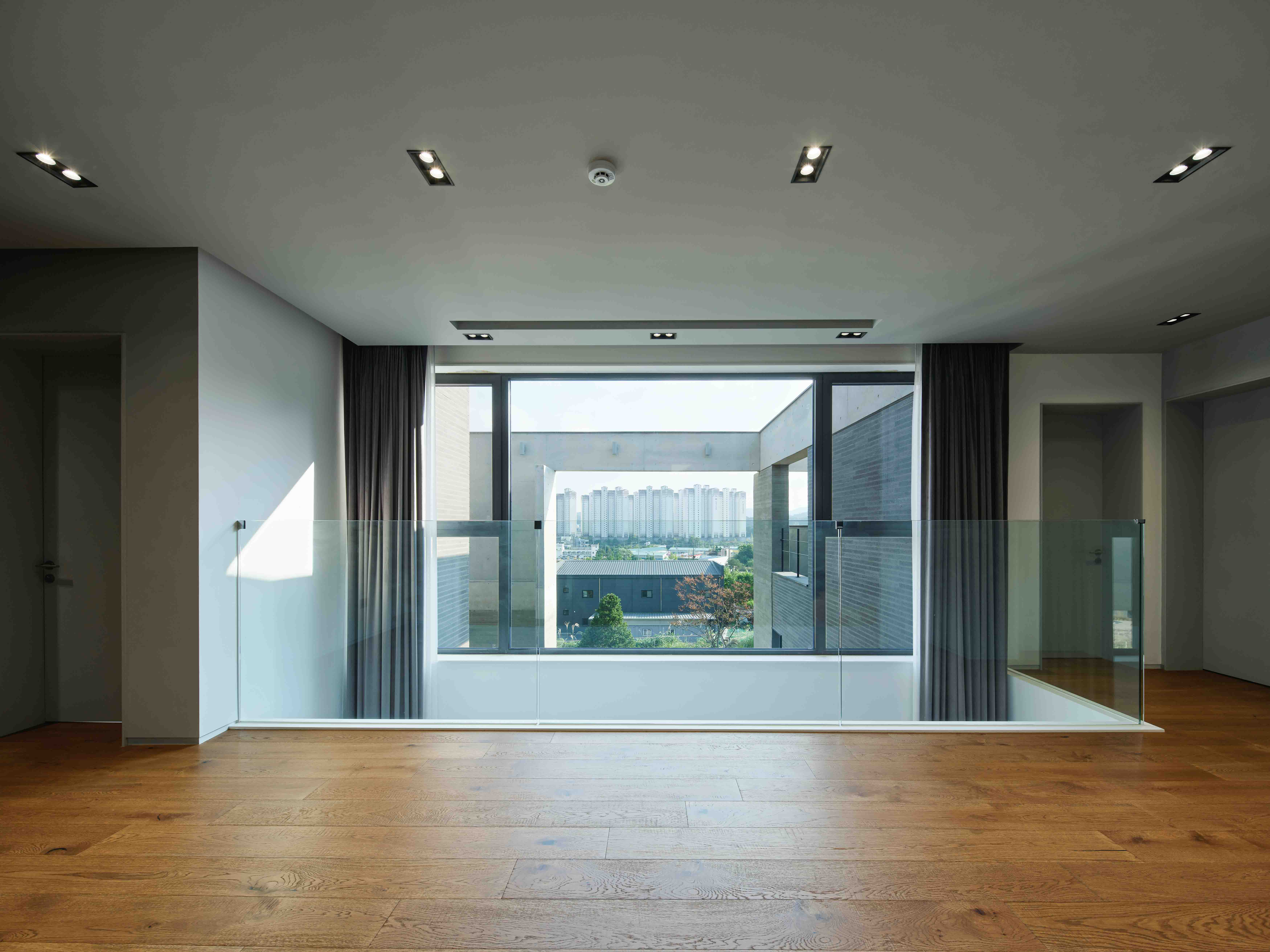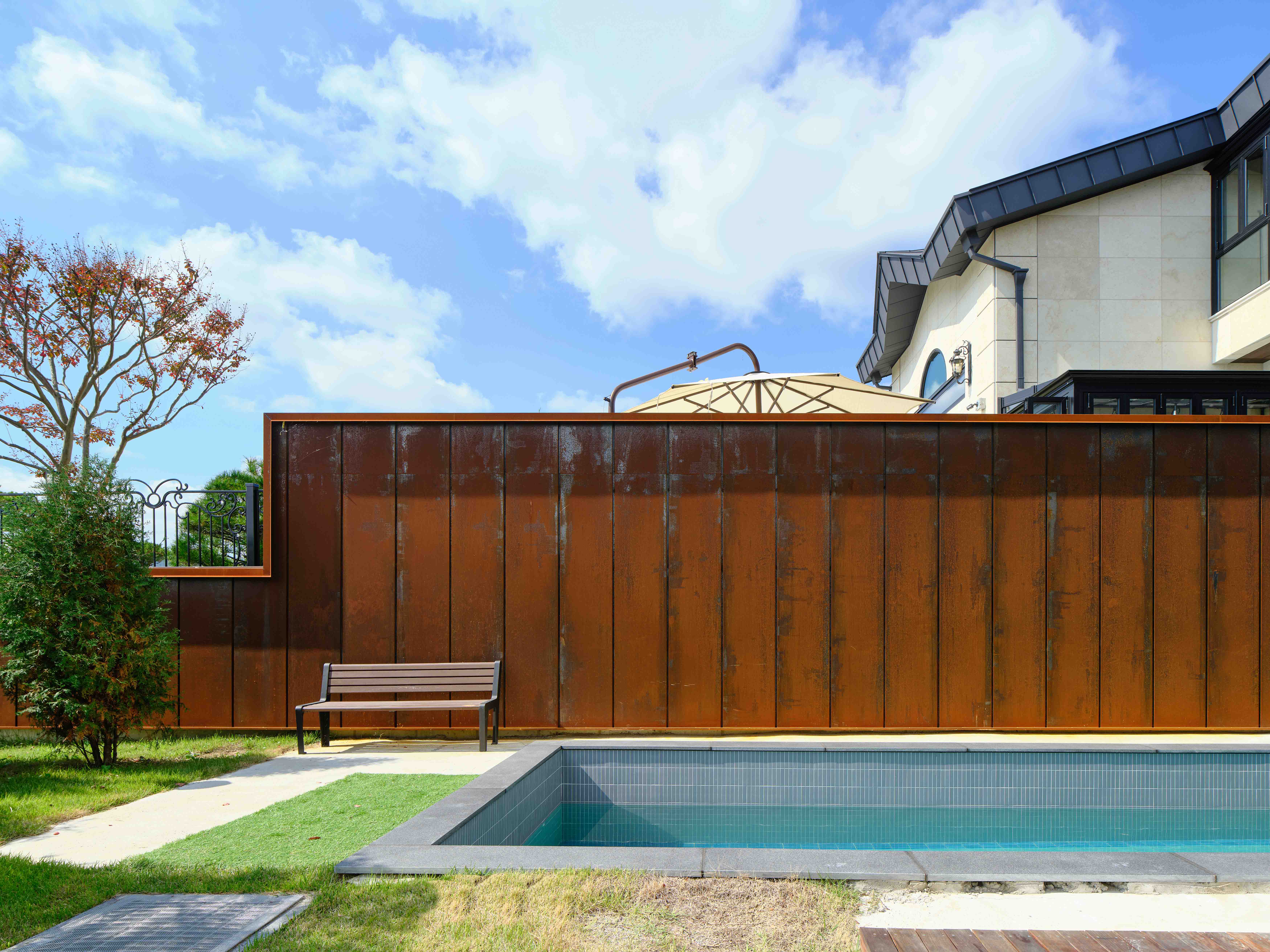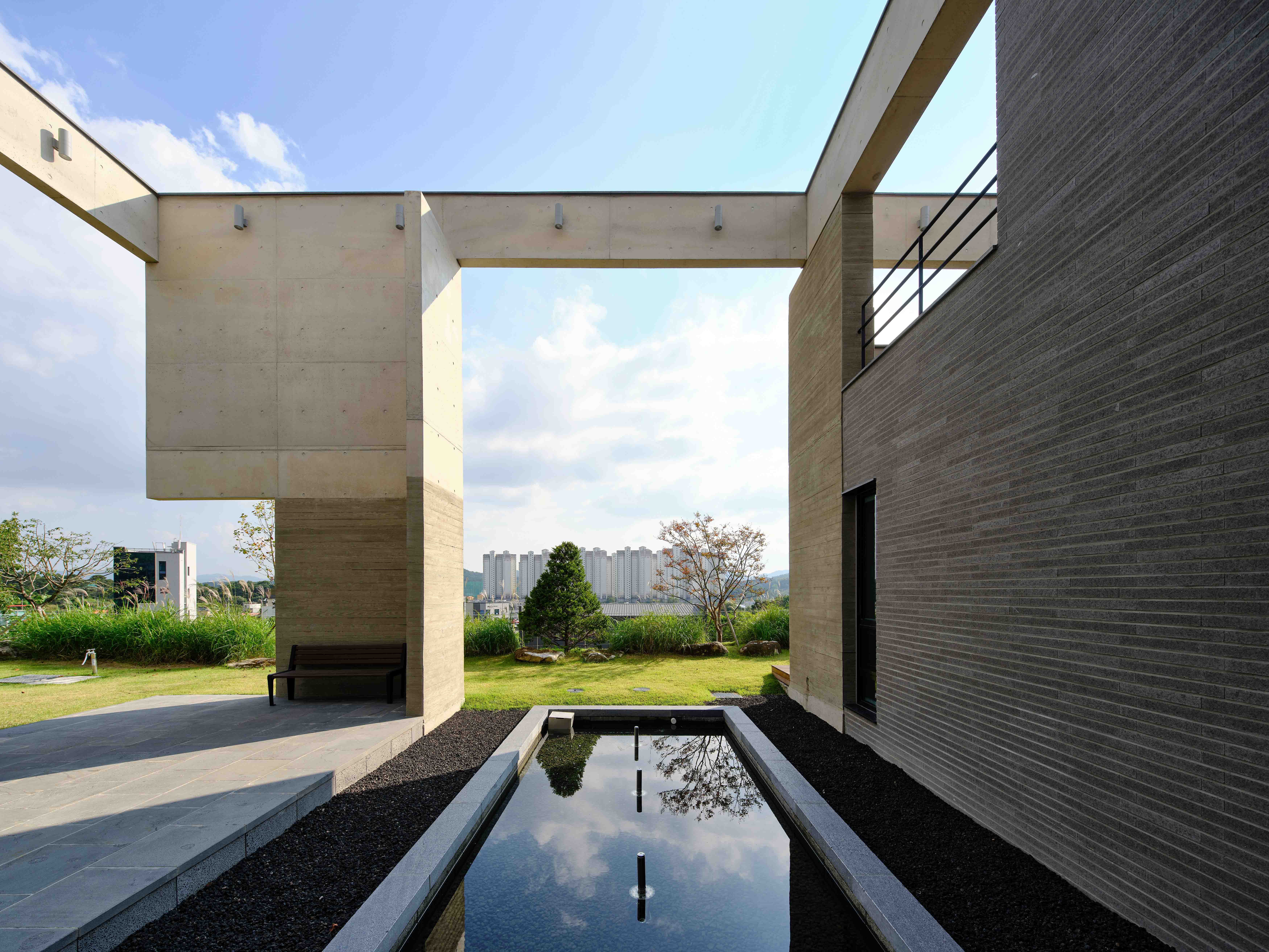 The site is located in a housing complex built at the foot of a mountain facing south in the middle of Mipyeong-dong, which lies long from east to west at the southern end of downtown Cheongju. It is located in the front, so it has an open view. The area is a little over 700 square meters, considering the building-to-land ratio of the natural green area, as is the case with most housing complexes on the outskirts of the city. There was not much room in the planar composition, and in order to overcome this, a semi-exterior space was created around the outer edge to create an external space that communicates with the inside. As a result, the narrow interior space seems to be expanded to the outside, and the landscape of the distant view is a cozy, closed exterior space from the kitchen, a strong direction from the first and second floor living rooms, and varied views to the left and right from the rooms and balconies on the second floor. It is bordered from a completely different style of house on the west side by a high oxidized steel fence, and a rectangular swimming pool is placed in between, giving space. The entryway coming in through the dead-end road was painted with lines and lighting was installed to give it a sense of vitality, and the louvers and exposed concrete side walls at the top of the parking lot continue to emphasize the entry axis. In any case, I hope it will be a place where fun and joy are endless, just like its name Hwan-hee-mu-ryang(boundless joy), given by its owner.