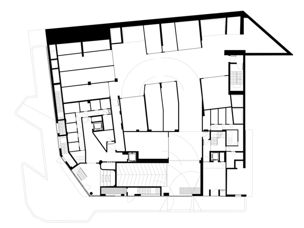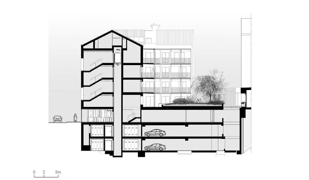토리노에는 작은 샌프란시스코가 있다. 언덕 쪽으로 얇아지는 길을 따라 2, 3층짜리 단독주택들이 줄지어 서 있다. 파우스트 코피 모토벨로드로모(Fausto Coppi Motovelodromo) 뒤에 있는 마돈나 델 필로네(Madonna del Pilone)지역의 교차로에 대지가 있었다. 건축가는 주차장으로 사용되었던 공간을 노출 콘크리트와 강철, 원목과 유리를 사용해 새로운 주거단지로 탈바꿈했다. 기존에 남아있던 주차장의 지하 2층은 남겨두고, 건물의 입면에 사라진 부분을 재구성했다. 땅과 연결된 4층 높이의 건물은 경사진 지붕에 돌출된 창을 가지고 있다. 새로운 건물은 빈 공간과 꽉 찬 공간을 번갈아 배치했고, 서북부의 해체주의 건축물을 바라보게 했다. 지하실은 50년대 주변 건물들을 재해석했다. 당시 지어진 건물은 종종 필로티 구조로 건물을 땅에서 띄워 올렸다. 따라서 아파트는 지하실이 만들어진 나무판 위에 놓여 받쳐지고 가볍고 투명하게 ‘공중에 떠’ 있다. 이 프로젝트는 경사진 대지에 교묘히 올려져 언덕에 적응한 간결하고, 밝은 디자인의 ‘기둥 위에 있는 집’이다.
