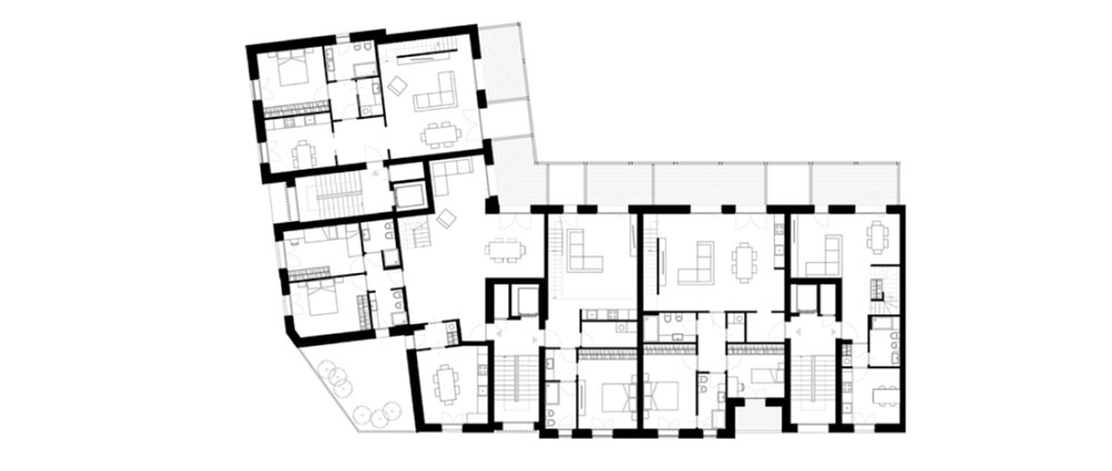 There is a bit of San Francisco in Turin too. Single-family houses of 2 or 3 floors lined up along the streets that thin out towards the hill. We are in the Madonna del Pilone area, behind the Fausto Coppi Motovelodromo, at the intersection of Via Lomellina and Via Tonello. Here + Studio architetti Filippo Orlando with Mediapolis Engineering has just completed the transformation of a corner lot, previously used as a parking lot, into a new residential complex, with an unusual language for Turin, alternating exposed concrete, steel, raw wood strips and glass. Preserving the two underground floors of the existing garage, the project reconstructs the missing piece in the building curtain. Articulated in a corner volume of four floors above ground with a pitched roof with dormer windows, the new building, in the alternation of materials and full and empty spaces, looks to the deconstructivist architecture of the west-coast. The basement is a reinterpretation of the surrounding buildings of the ‘50s, in which the building is often raised from the ground by a pilotis floor: the apartments are therefore “suspended”, going to rest and set on the wooden slats from which the basement is made, light and transparent. The project thus outlines a house “on stilts” with a simple and bright design that with a clever play of staggered floors adapts to the slope of the hill.