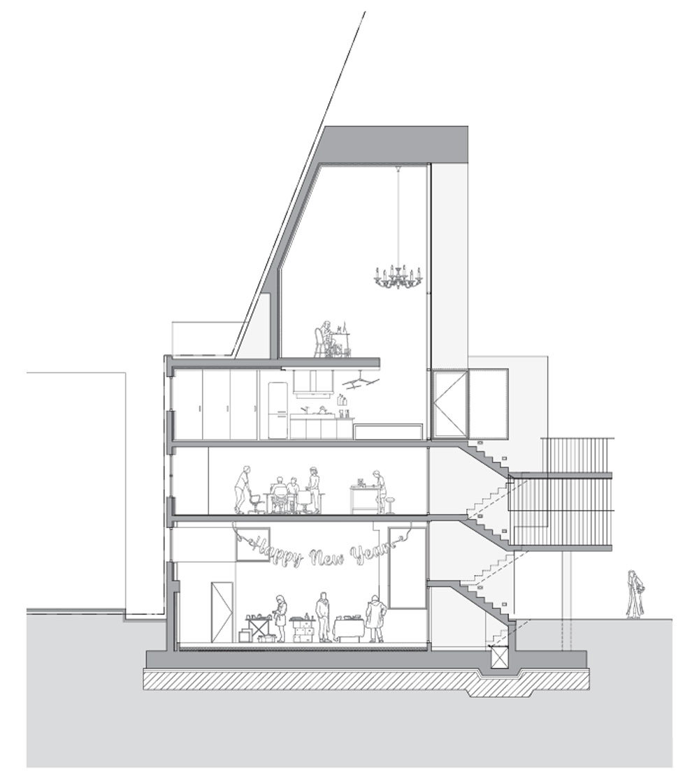 주거지역의 모든 건축물은 정북방향 일조권 사선이 적용된다. 일조권 사선제한은 건축물의 최대 볼륨과 허용 가능한 최외곽선을 규정한다. 건축 가능한 모든 대지는 다른 모양, 방위, 면적을 갖고 있으며 따라서 모두 다른 형상을 침범해서는 안 되는 가상의 볼륨을 가진다. 소슴당인은 주거지역에 있다. 우리는 소슴당인에 적용되는 법적 제한을 적극적으로 수용하여 특징적인 볼륨이 되도록 계획했다. 정북방향 사선제한이 적용되는 면과 건물의 입면이 평행되며, 이렇게 뻗어나간 사면과 수직의 벽과 만나는 지점까지 방향성을 유지하고 끊김없이 연장하여 솟아있는 볼륨과 뾰족한 내부 공간이 만들어졌다.