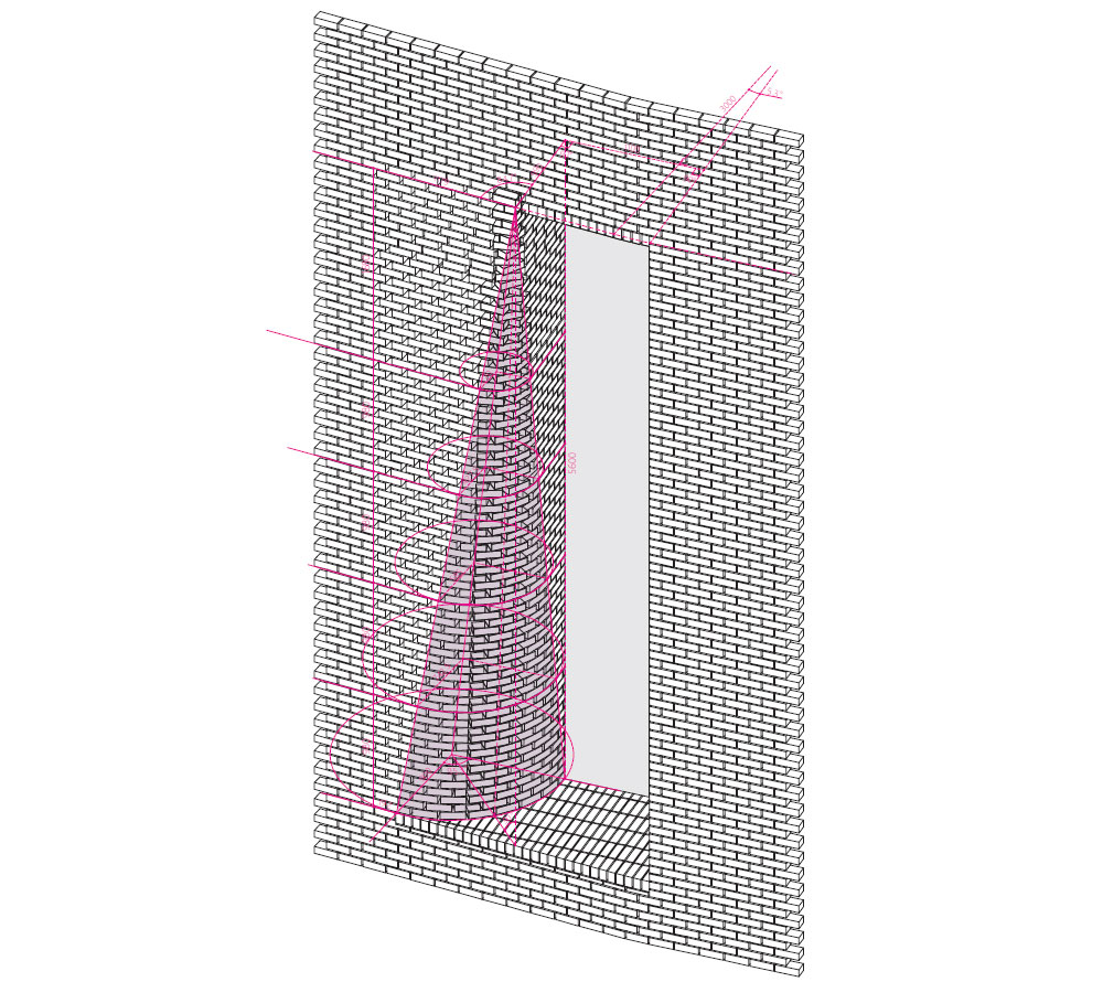 집은 남쪽 도로에 바로 접해 있고 주 출입구는 입면의 중심에 있다. 입구는 2개 층의 높이와 깊이감을 느끼도록 계획했는데, 이는 물리적 거리를 심리적, 시각적으로 보정하기 위한 장치다. 현관의 우측 벽은 수직으로 서 있고 좌측 벽은 부드러운 곡면으로 돌아간다. 하지만 바닥에서 시작한 곡면의 모든 벽돌은 다른 각도와 위치값을 가지고 입구 천장면에 가까워질수록 직각 방향의 두 벽면과 일체화된다. 상승하면서 벽체의 곡률은 작아지지만, 벽돌을 자르지 않고 형상을 온전히 쌓았다.