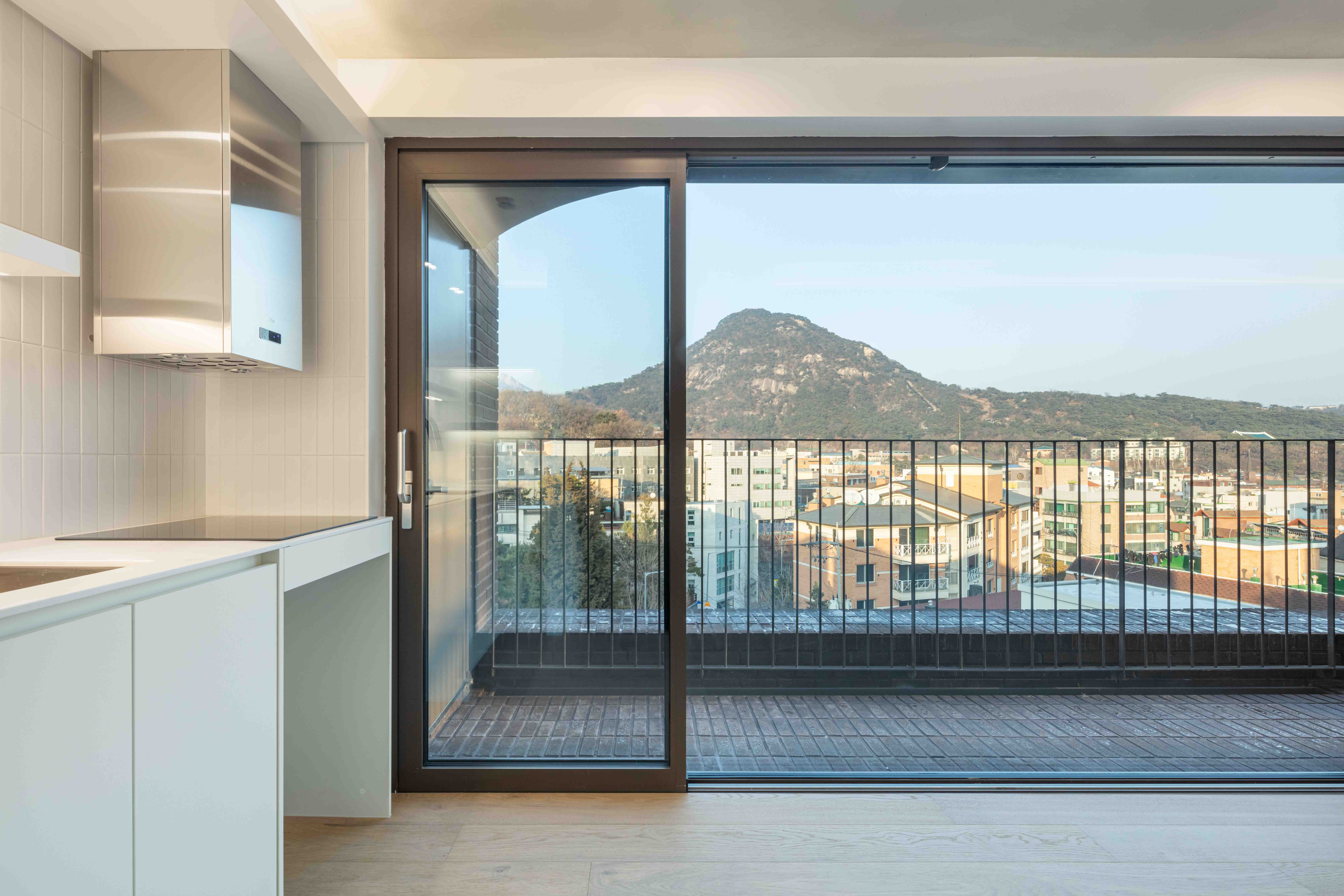 Ogindan Dandan is on the left side of Gyeongbokgung Palace in Seochon. Cafes and restaurants can be found one after another along the street from Gyeongbokgung Station, but the area is quiet because it is somewhat far from the main boulevard. The site where Ogindan Dandan is located sits at the end of the mountain ridge to the west. To be exact, the road next to it was created at a right angle to the mountain range, and the land next to the road was used to build the last house in the village that was formed all the way to the bottom of the mountain. It would be appropriate to say that the stature of the place can be appreciated from the east, west, and south sides. If you look from the three sides, other than the west side, the house is located at the beginning point of the village on the hill. The relatively gentle slope in the south curves to the west as it meets the land and leads to the top of the hill. When viewed from the east side, the site sits above the retaining wall next to the road, and it is 8m apart from the house to the north. Due to these characteristics, Namsan Mountain can be seen far away in the south. Bukaksan Mountain and Cheong Wa Dae can be seen simultaneously to the north. The landscape surrounding the site and the environmental characteristics around the building had an integral influence on the appearance of the house and the planning of each space inside it. Ogindan Dandan is right next to the road to the south. The yard is on the opposite side of the solid-looking southern part of the building. Additionally, balconies were planned for the second and third floors above the yard. The client requested a house with spaces in which families could live independently on each floor. The combination of rooms and three external areas forms an independent space with each floor having a different shape. As a result, the shape of the house as a whole is formed by a large stylobate and stacked layers. The initial design was to have a large window in the direction of the patio on each floor so that everything could be seen, from the balcony indoors to the scenery of Bukaksan Mountain far away. In this way, the interior extends to the outer part of the house, making the interior appear to be more expansive. In the study room, where retired parents could spend most of their time, the changing scenery outside the window throughout the day would be expected to fill the space with color. To protect residents’ privacy from the surrounding environmental factors, the windows were carefully positioned except for the ones on the northern part of the building, blocking people’s views from surrounding areas through an extended volume of walls.