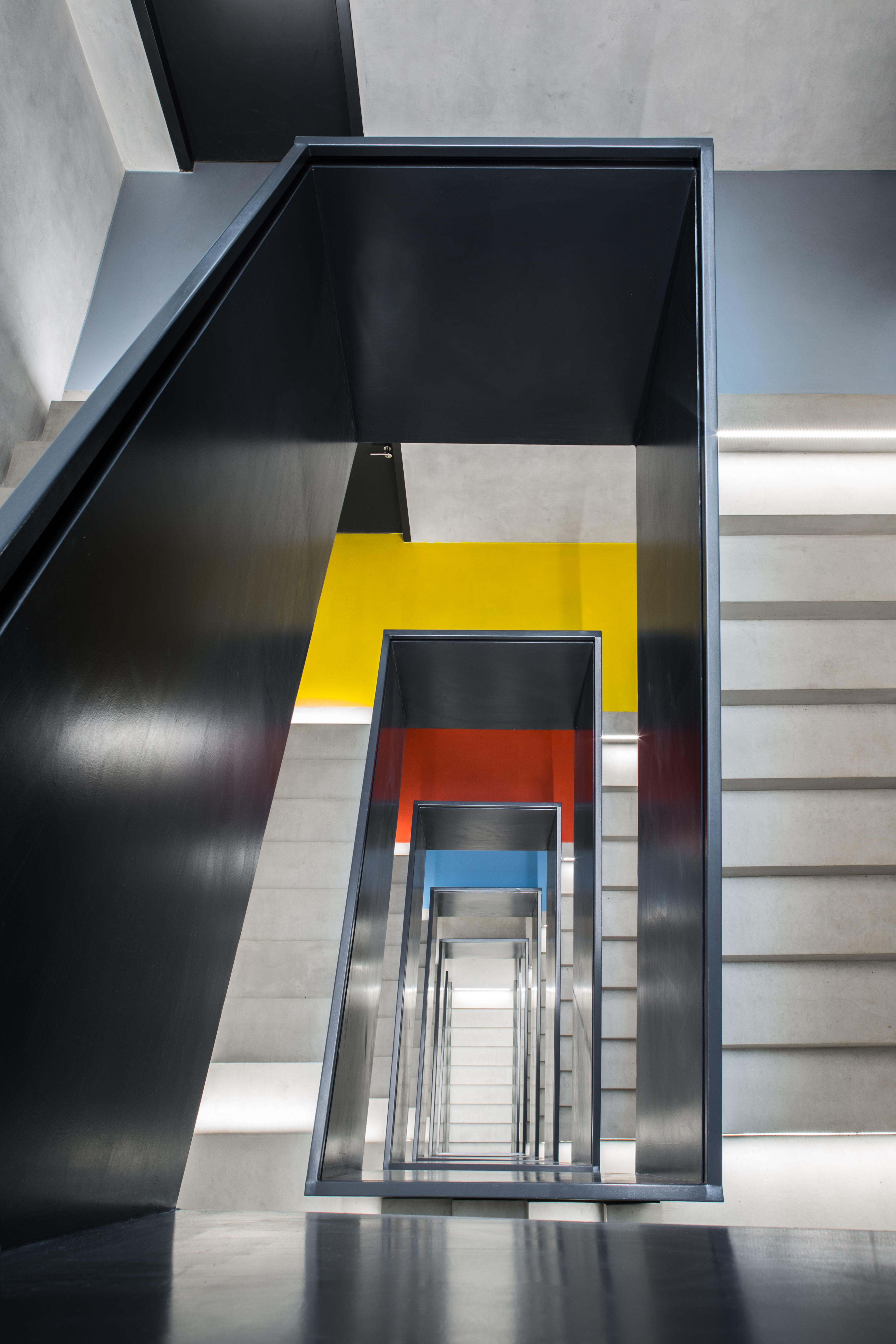The concept of the interior of the house is based on the rhythmization of the spaces, on the use of permanent materials. The structure of the supporting structure is accentuated in the interior. We strive for a clearly recognizable boundary between new and old, between supporting and embedded. This simple consideration, if strictly adhered to, leads to a very pronounced rhythmization of interior corridors. All the new partitions in the corridors never directly reach the load-bearing structure - the spans and the columns. The partitions act as inset boxes - most often they are used as storage space for the office. What ultimately connects the partition and the column is the door with the window and the overlight. This principle also has an operational advantage - there is little visibility into the offices and the corridors inside the building have natural lighting. All the departments and divisions of City Hall are designed in a similar fashion. The building has two halls. The large council chamber is located underground, where the structural height of the building is greater. The council chamber, on the other hand, is located on the top floor. Each floor has its own unique floor colour scheme, which will lead to easier orientation in the building. A prominent feature that connects all the interior spaces is the metal look with acoustic treatment.