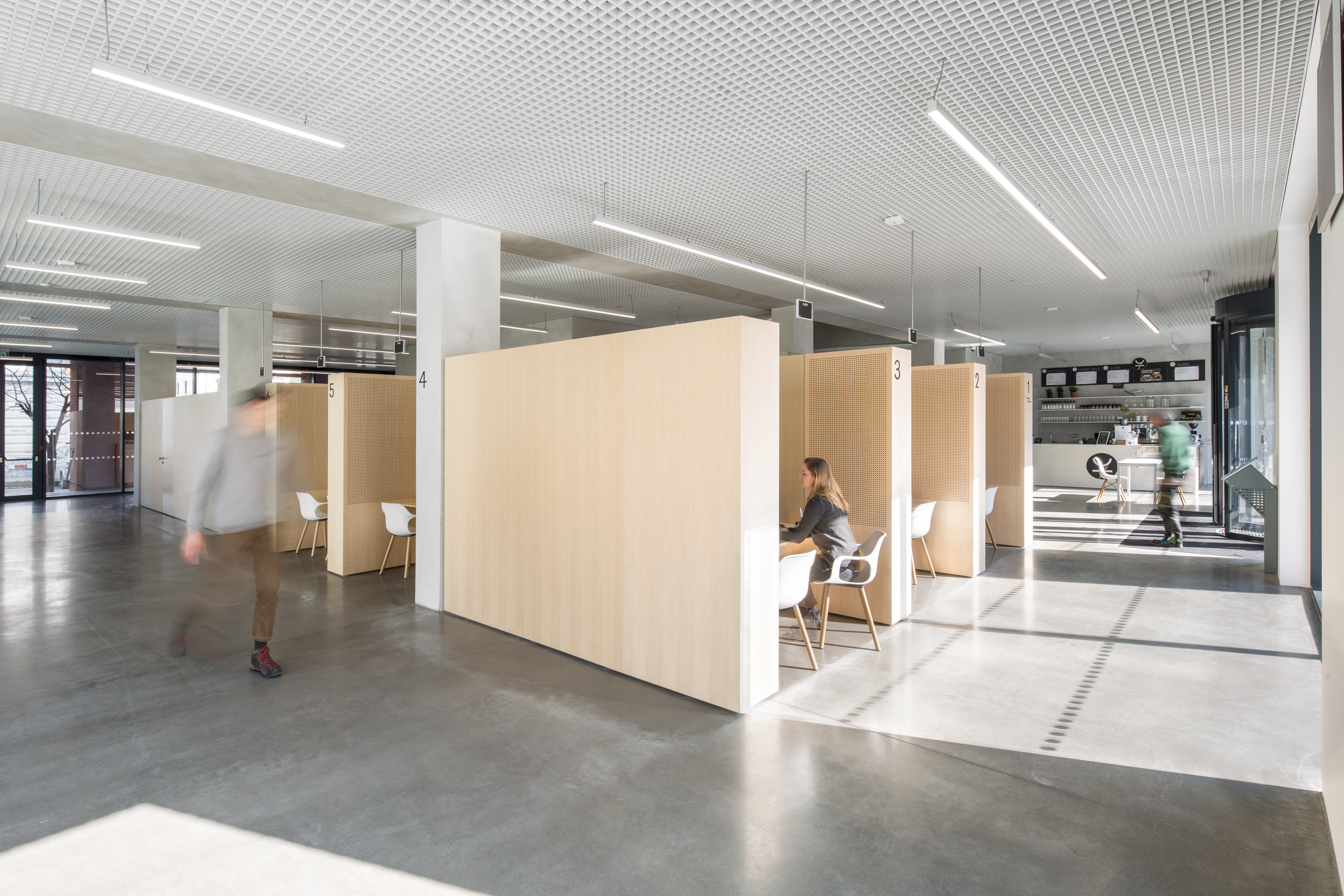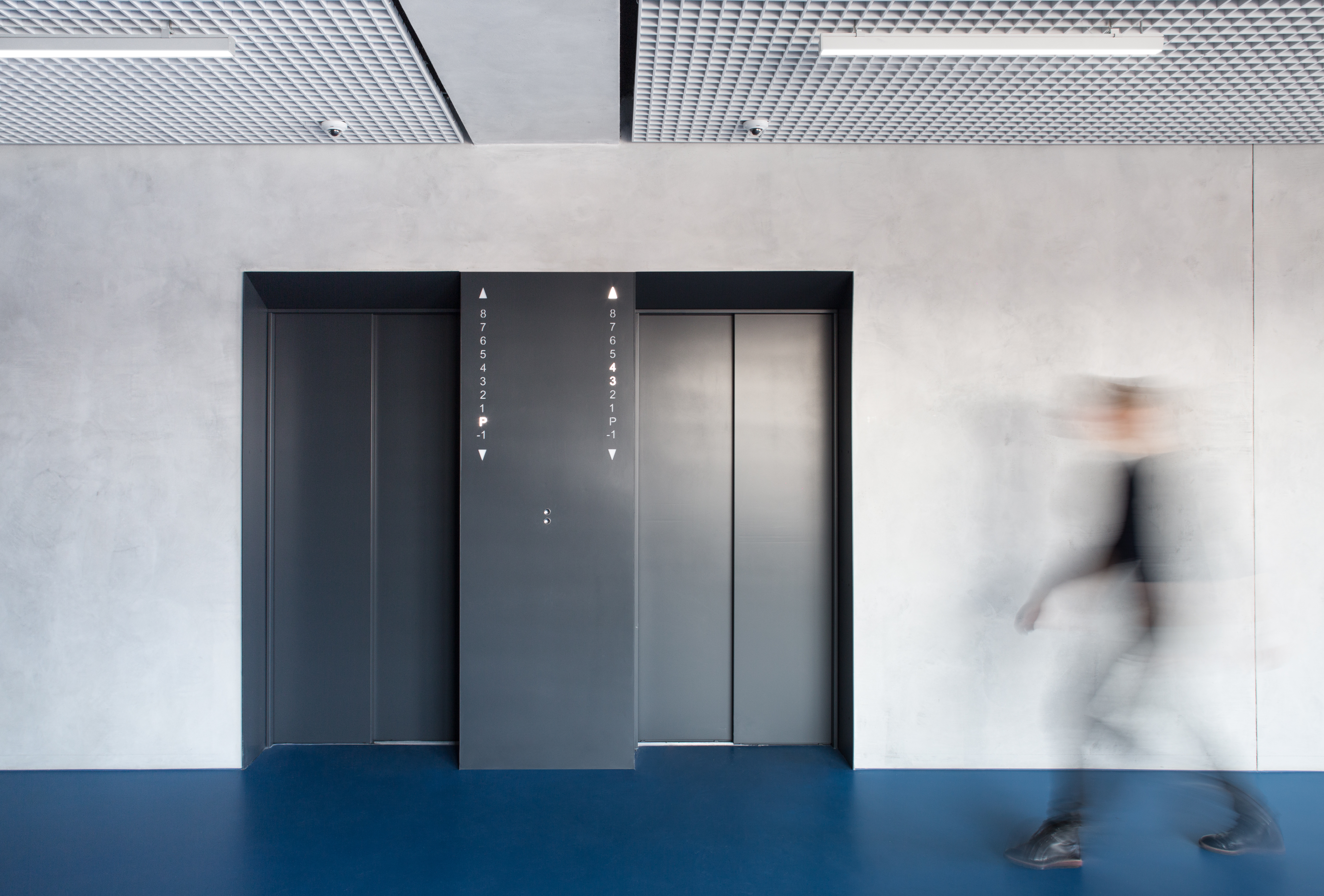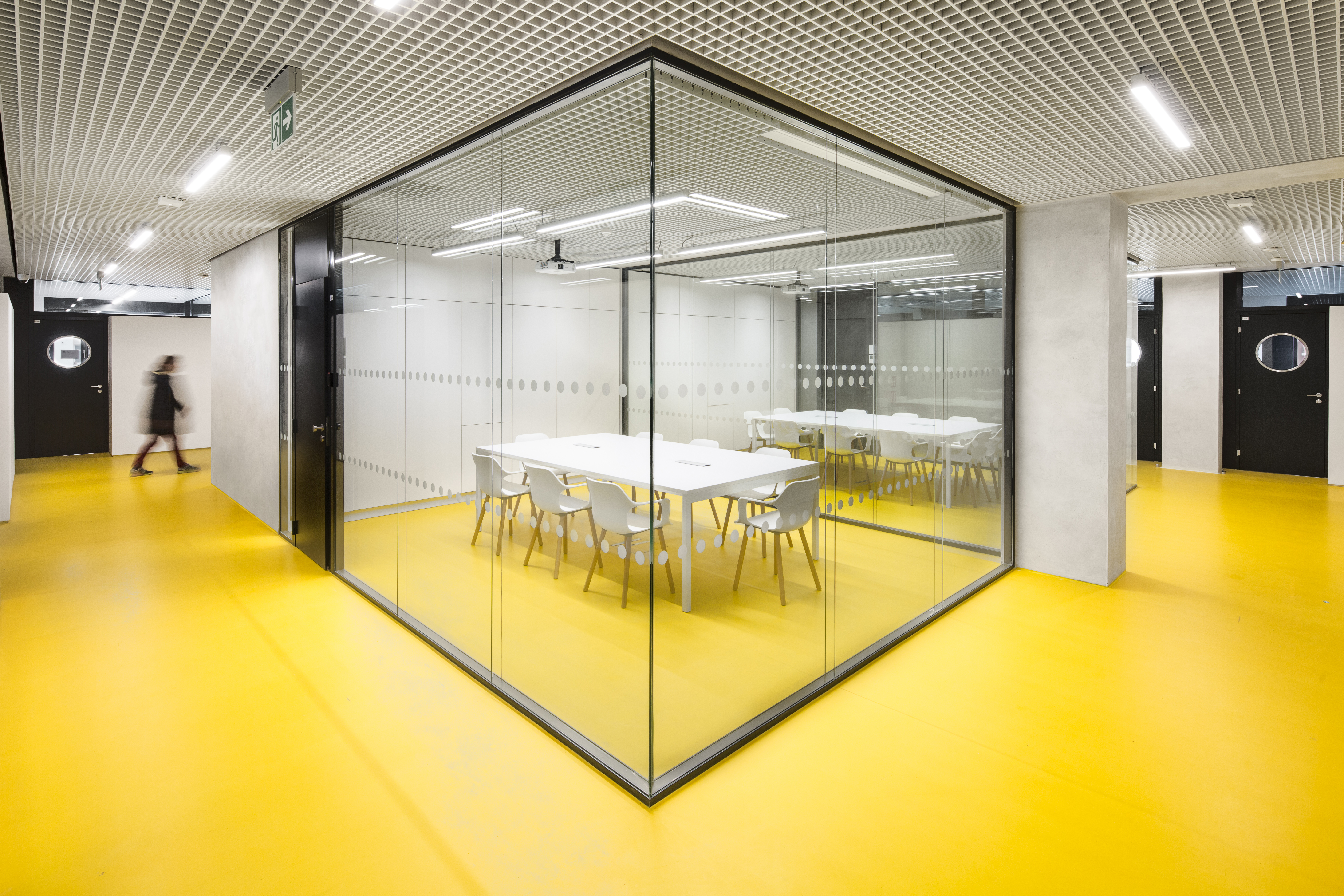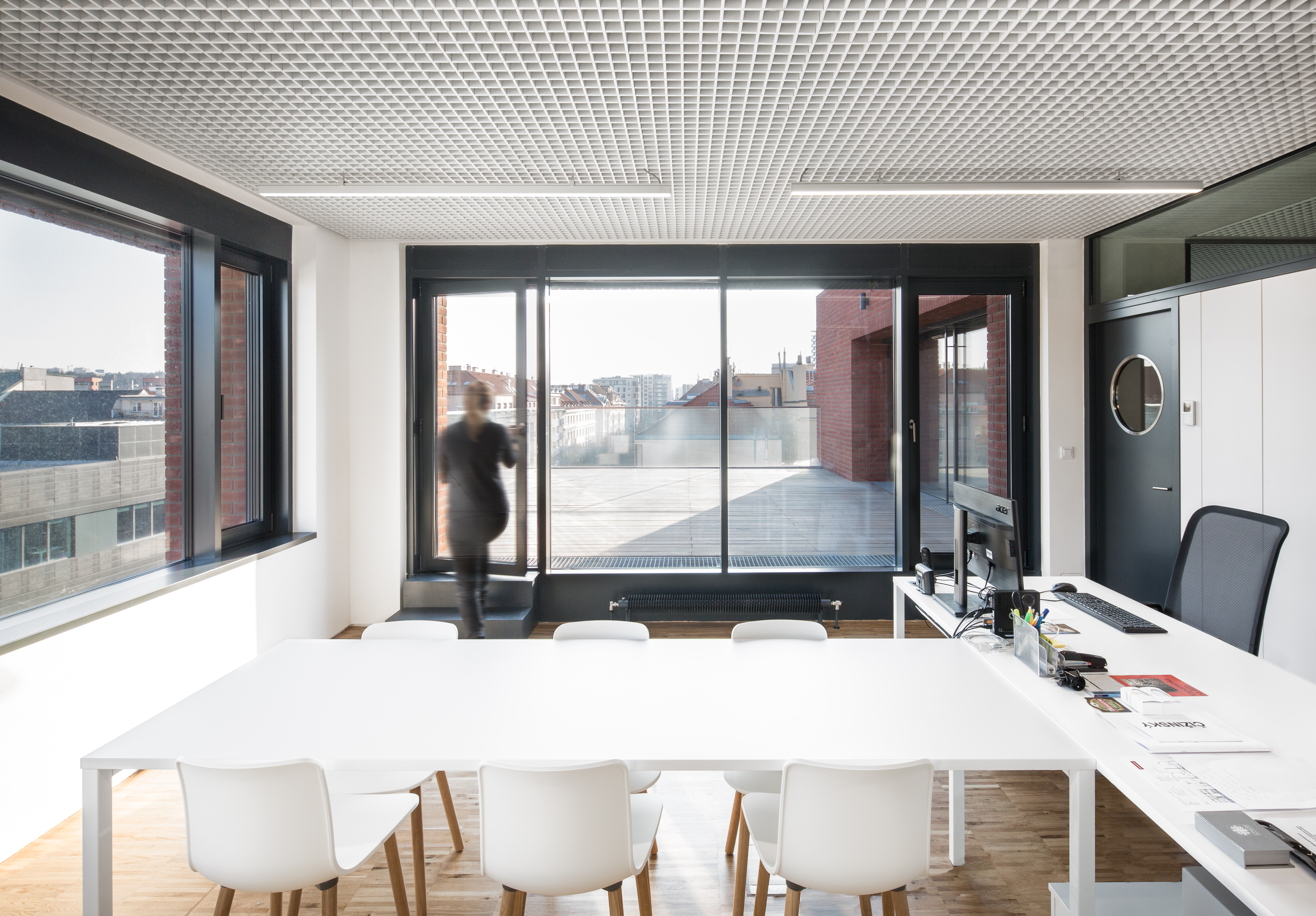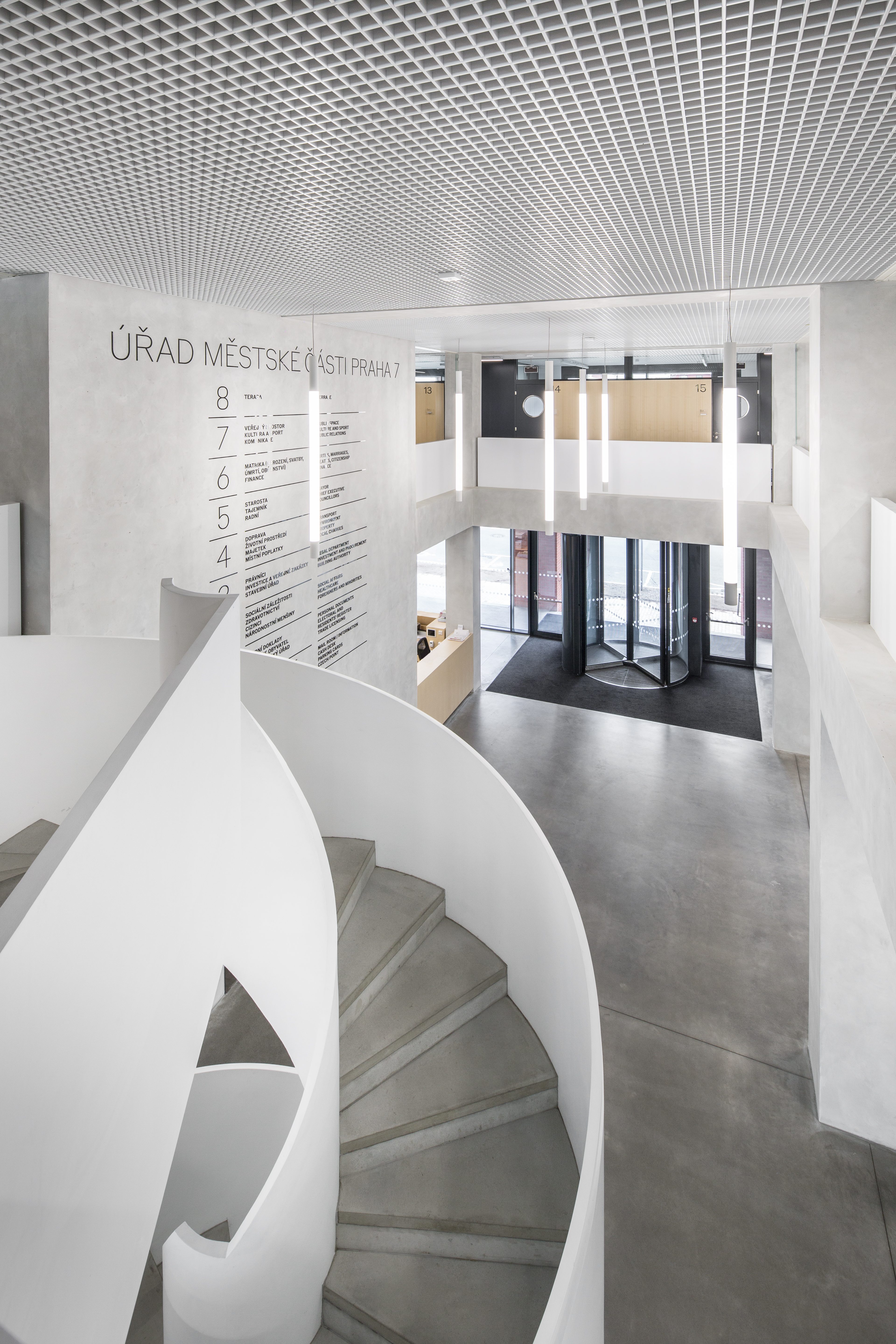 The concept of the interior of the house is based on the rhythmization of the spaces, on the use of permanent materials. The structure of the supporting structure is accentuated in the interior. We strive for a clearly recognizable boundary between new and old, between supporting and embedded. This simple consideration, if strictly adhered to, leads to a very pronounced rhythmization of interior corridors. All the new partitions in the corridors never directly reach the load-bearing structure - the spans and the columns. The partitions act as inset boxes - most often they are used as storage space for the office. What ultimately connects the partition and the column is the door with the window and the overlight. This principle also has an operational advantage - there is little visibility into the offices and the corridors inside the building have natural lighting. All the departments and divisions of City Hall are designed in a similar fashion. The building has two halls. The large council chamber is located underground, where the structural height of the building is greater. The council chamber, on the other hand, is located on the top floor. Each floor has its own unique floor colour scheme, which will lead to easier orientation in the building. A prominent feature that connects all the interior spaces is the metal look with acoustic treatment.