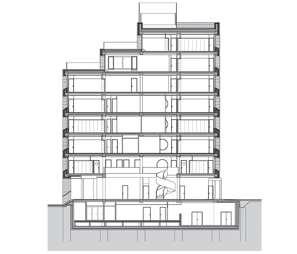 The town hall is a house for the public. Local government is a service to the public. The Town Hall building should inspire respect and SOLEMNITY, the house should represent permanence and solidity, be welcoming but not pandering, but above all it should be open, feeling accessible. This can be achieved through both compositional principles and the materials used. The building refers to engineering thinking by means of expression with an emphasis on tectonics. Tectonic architecture is the architecture of lofty temples, but also of factory halls, of which there are plenty in Holešovice. The industrial history is very strong here, probably even stronger than in Smíchov. The tectonic house, standing firmly on the ground, evokes a feeling of permanence, which the town hall as a house should. The material used - brick has a similar property to tectonics, it is very old, it has been used for more than two thousand years. In Holešovice it can be found on old halls or as an architectural detail on apartment buildings. Apart from its high aesthetic qualities, brick has one huge advantage - it can age, it does not need to be cared for, it can last for hundreds of years and it is beautiful with age. For openness, the town hall is as accessible as possible from its surroundings, the house opens onto U Průhon Street through an arcade with a staircase. Entering the house through the staircase into the arcade space sets the building apart from the common and ordinary. The very act of climbing the stairs inspires respect. The strip of lawn is removed in the section in front of the building to emphasise the importance of the house in the street. The new paved space is also necessary as a dispersal area for visitors.