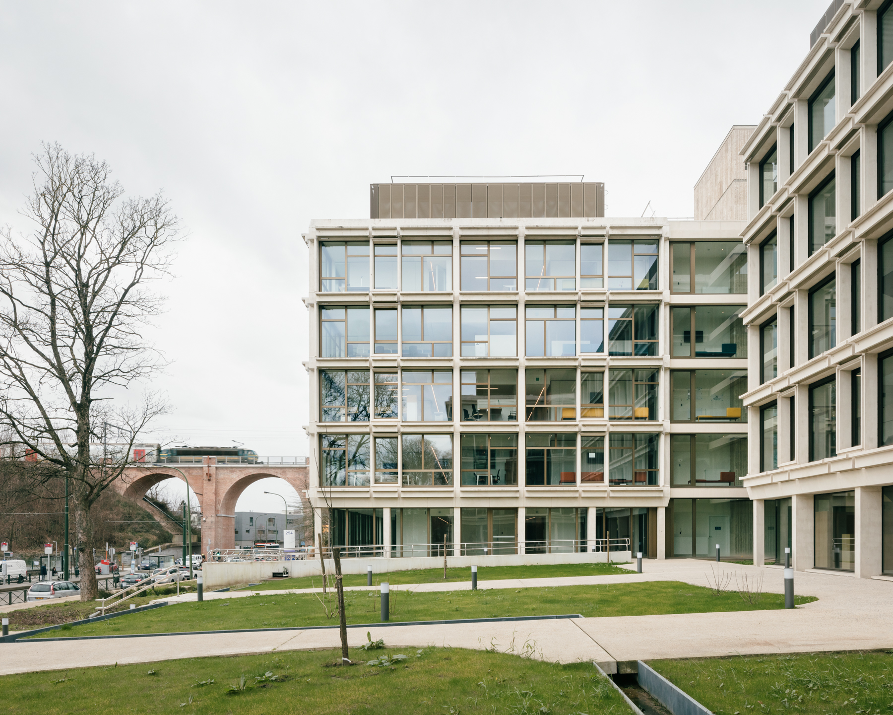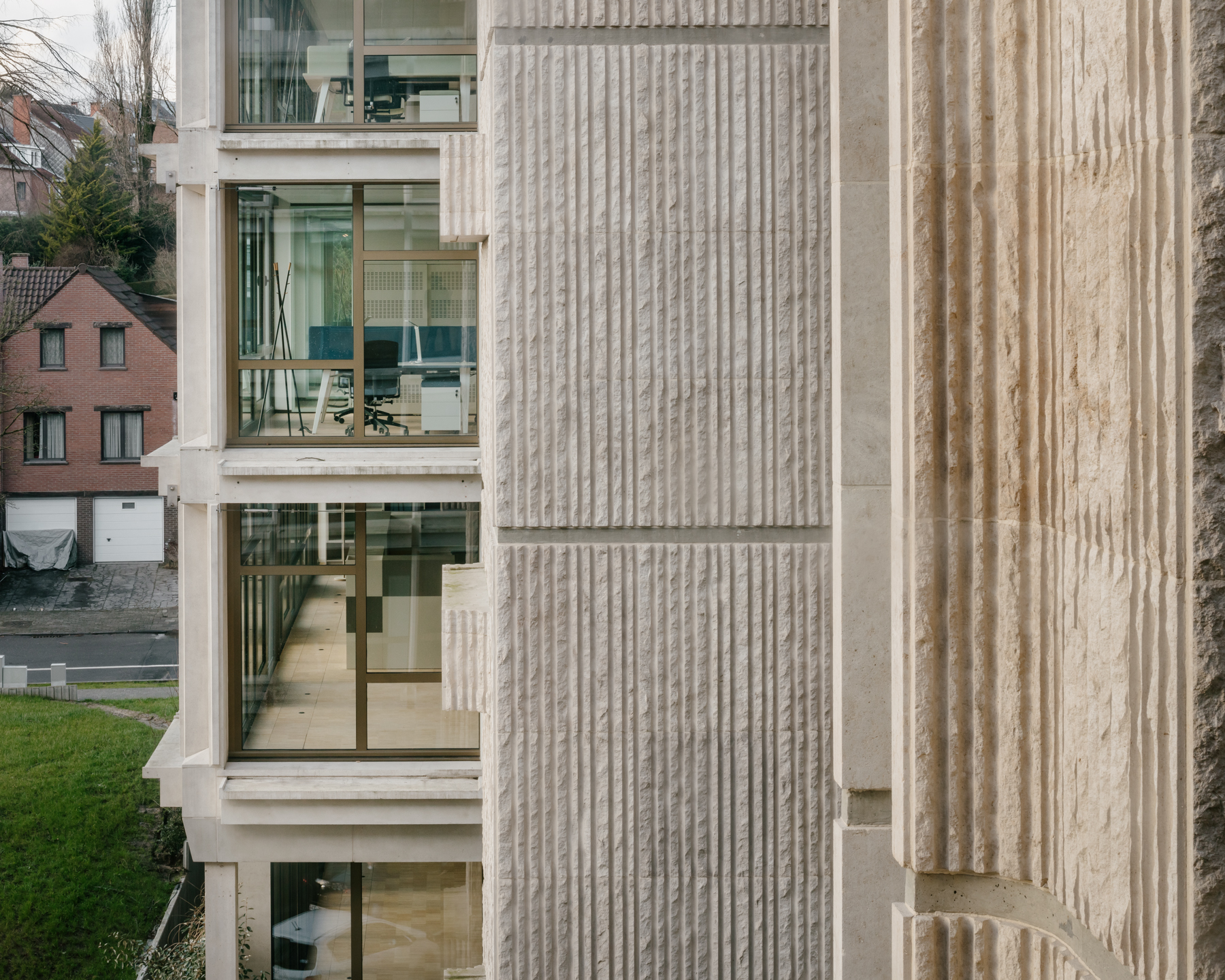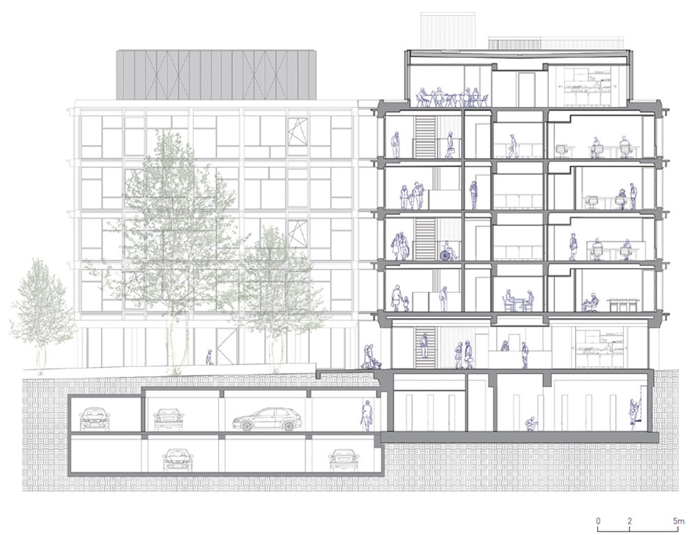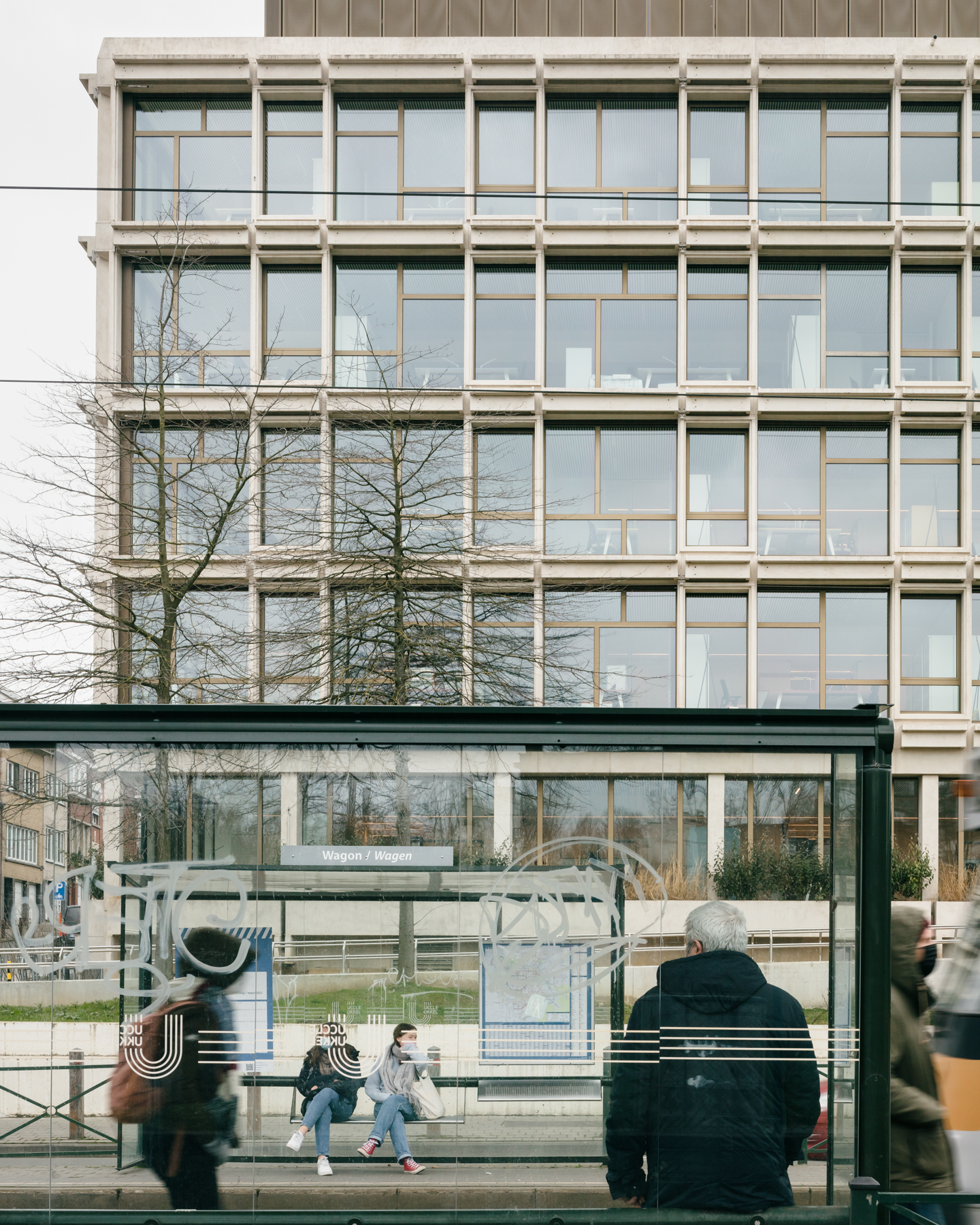 Circular building From the start of the design process, we have looked at this renovation project as part of a larger change in society towards a circular economy. We first made an extensive study of the existing building and the elements that can be reused. We also carefully analysed the energetic performance of the façade to optimally reuse the external elements in concrete. The architectural interventions are subtle and respectful while creating a contemporary identity. The rigorous expression of the building’s structure is preserved. Different window patterns create a link between the floor levels and offer a lighter reading of the façade. For heating and cooling, we have developed with Vivaqua, the public distributor of water in Brussels, a pilot project that uses riothermia: energy derived from wastewater, optimally utilizing existing energy flows and the specific local conditions of the site.