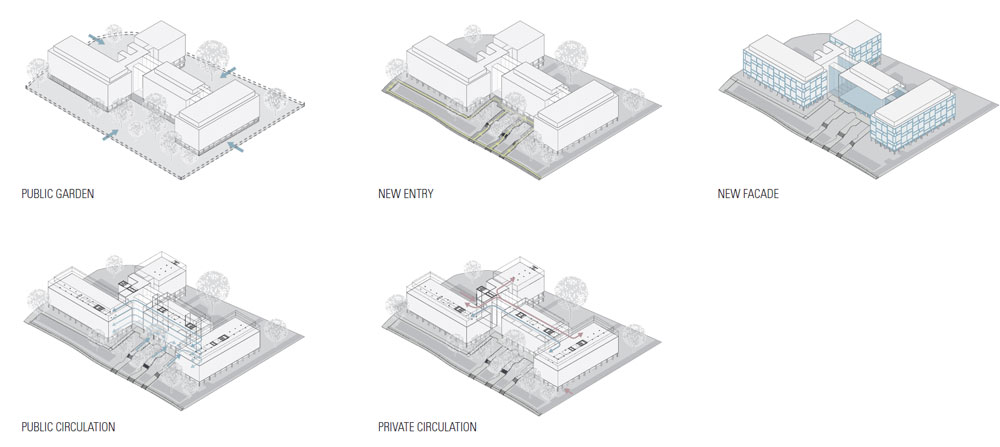 순환하는 건물 설계를 시작할 때부터, 건축가는 이 리노베이션 프로젝트를 순환하는 경제를 향한 더 큰 변화 일부로 보았다. 먼저, 기존 건축물과 재사용될 수 있는 구성요소들에 대한 방대한 연구를 했다. 또한, 콘크리트의 외부 요소를 최적으로 재사용하기 위해 파사드의 에너지 성능을 신중하게 분석했다. 현대적인 정체성을 창조하면서 건축적 개입은 적게, 그리고 존중하는 마음으로 진행했다. 건축물 구조의 엄격한 표현은 보존되었다. 다양한 창문 패턴은 바닥층과 연계되고, 파사드가 더 밝게 읽히도록 한다. 난방과 냉방을 위해 브뤼셀의 공공 수도 분배업체와 함께 폐수로부터 얻어지는 에너지인 리오털미아를 활용하여 현 에너지 흐름 및 대지의 특정한 현지 조건들을 최적으로 사용하는 파일럿 프로젝트를 개발했다.