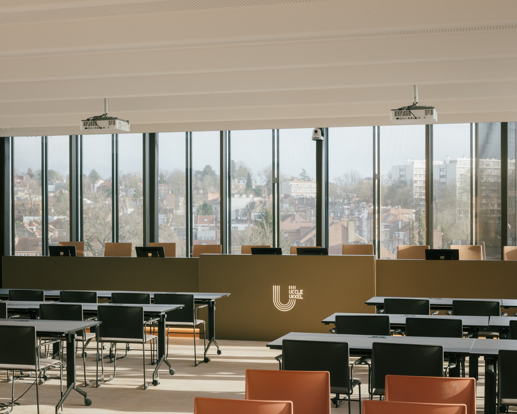 도시를 향해 열리다 시청은 지역 사회를 위해 사람들을 끌어들일 필요가 있다. 건축가는 먼저, 건물 주변의 녹지를 공공 정원으로 재정의했다. 가티 드 가몽(Gatti de Gamond) 거리에서 스탈(Rue Stalle) 거리로 주요 입구를 옮겨, 공공정원이 주 출입구의 일부가 되도록 했다. 공무원과 시민의 교류를 활성화하기 위해 건물 입구에 건물의 각층과 마을회관의 모든 서비스와 연결되는 대형 ‘시민 지역’을 조성했다. 옥상의 로비, 회의 공간, 공공 회의실은 마을 회관의 일상적인 활동과 독립적으로 기능할 수 있다.