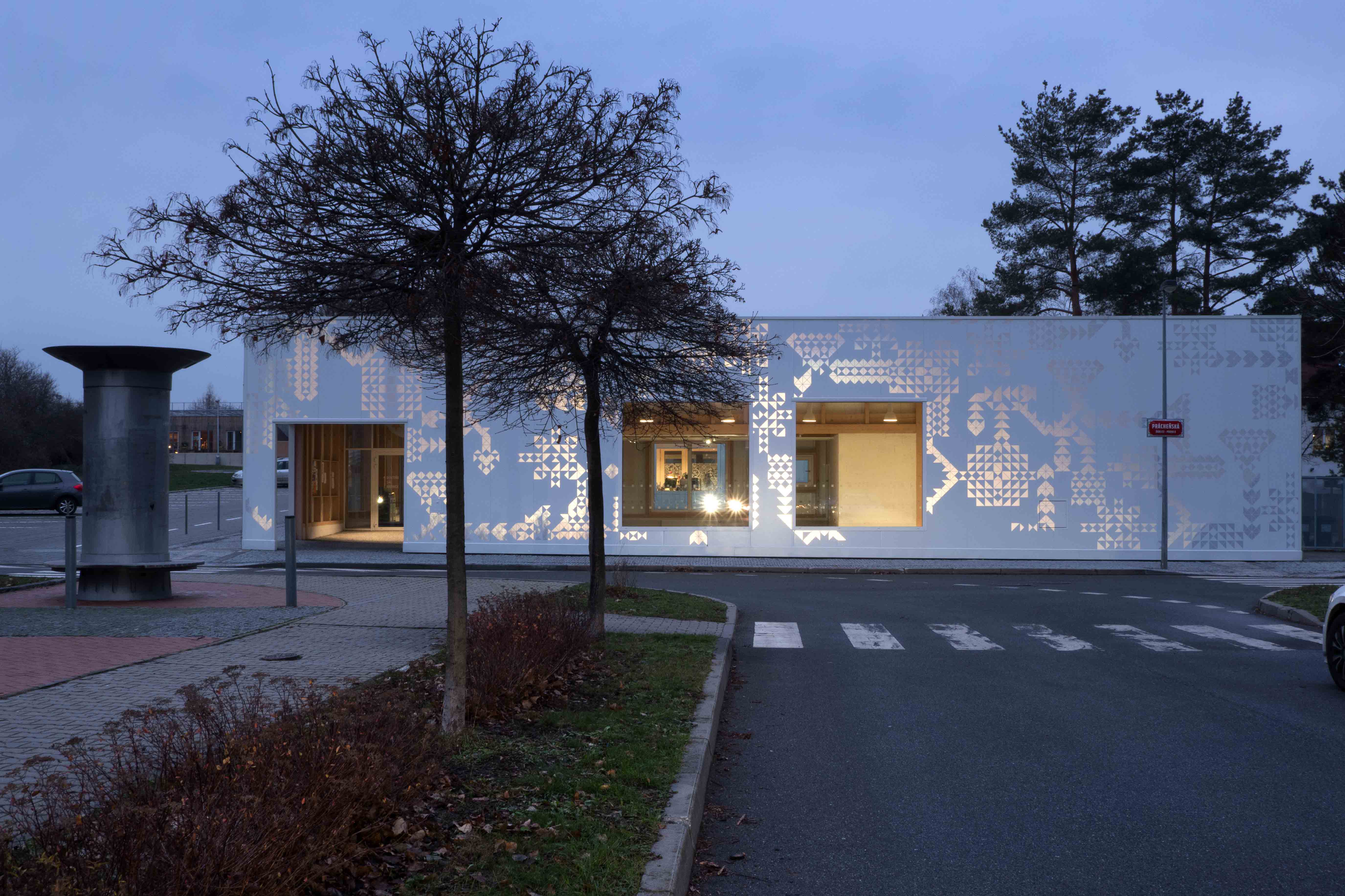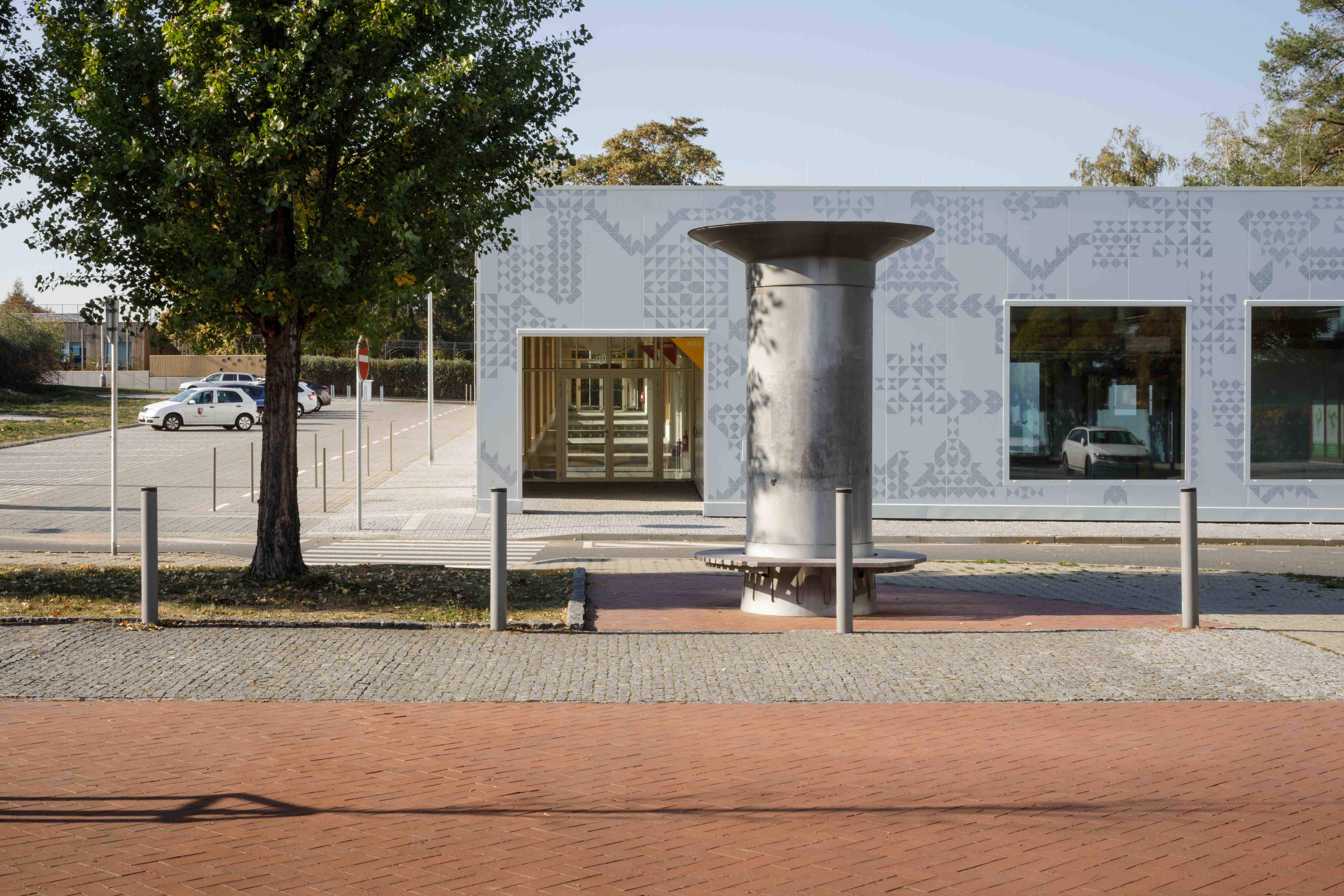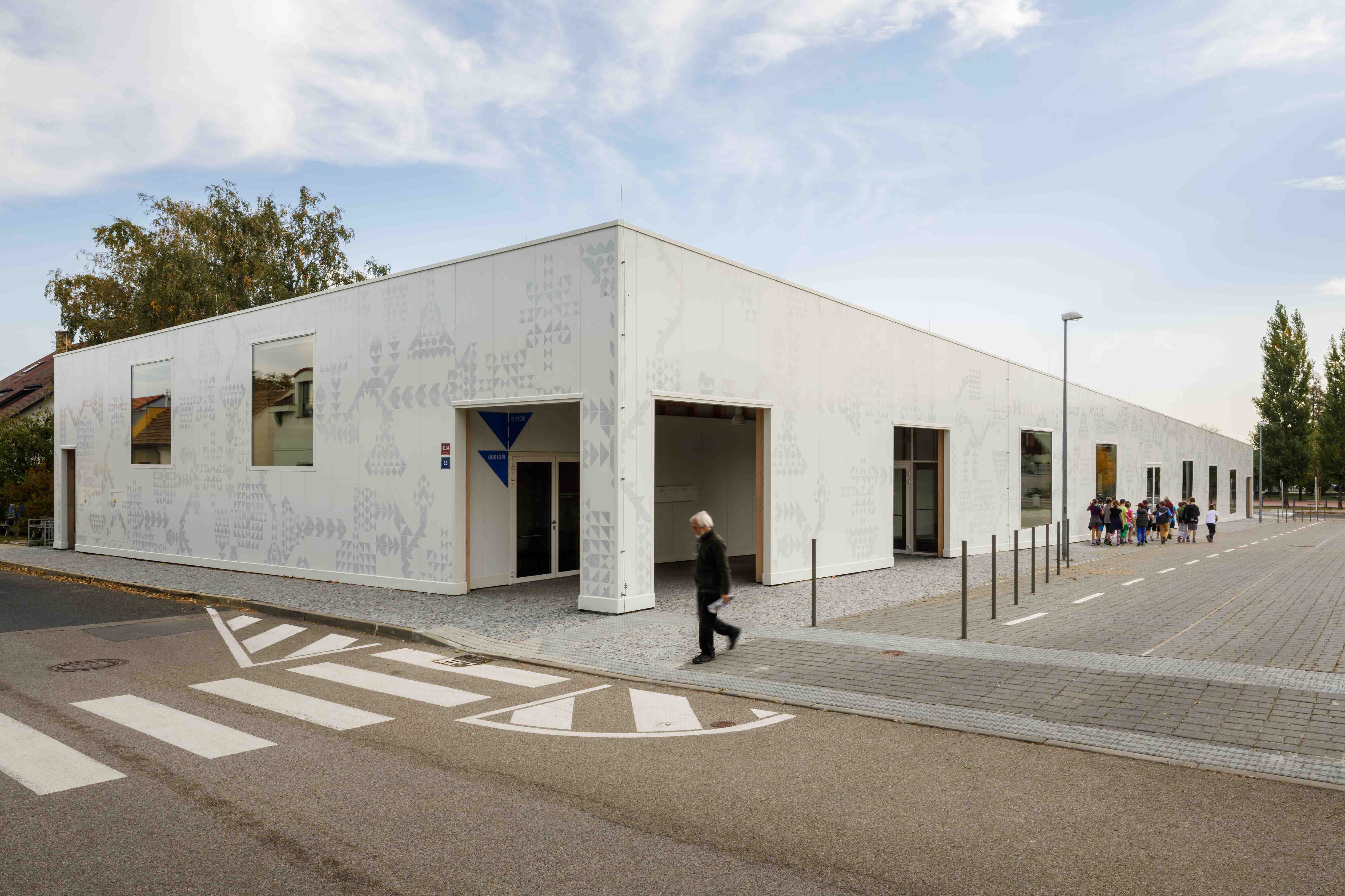 A simple, single-story, accessible house is not a monument but rather an instrument for it’s users of all ages / The essence of the design is maximum openness and transparency, light and air / no demonstration of the magnitude of the building but an emphasis on it’s public service instead / four separate sections (doctors' offices, multifunctional hall, municipality, post office) connected by the vestibule / vestibule as an arcade and a "relieving" area during balls, events and concerts and a occasional space for exhibitions / the inner atrium to illuminate internal spaces / mutual synergy, sections may vary according to the actual use / neutral materials for the civil character of the interior space and the light / front side of the patterned façade has a variable silver-white, reflective effect for greater identification of citizens with a "abstract box" Text by A.LT Architekti