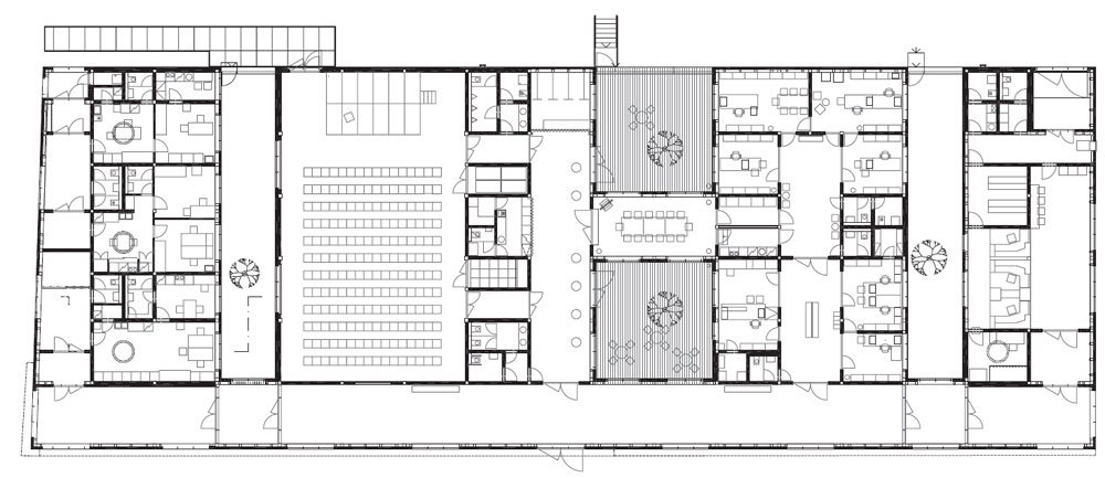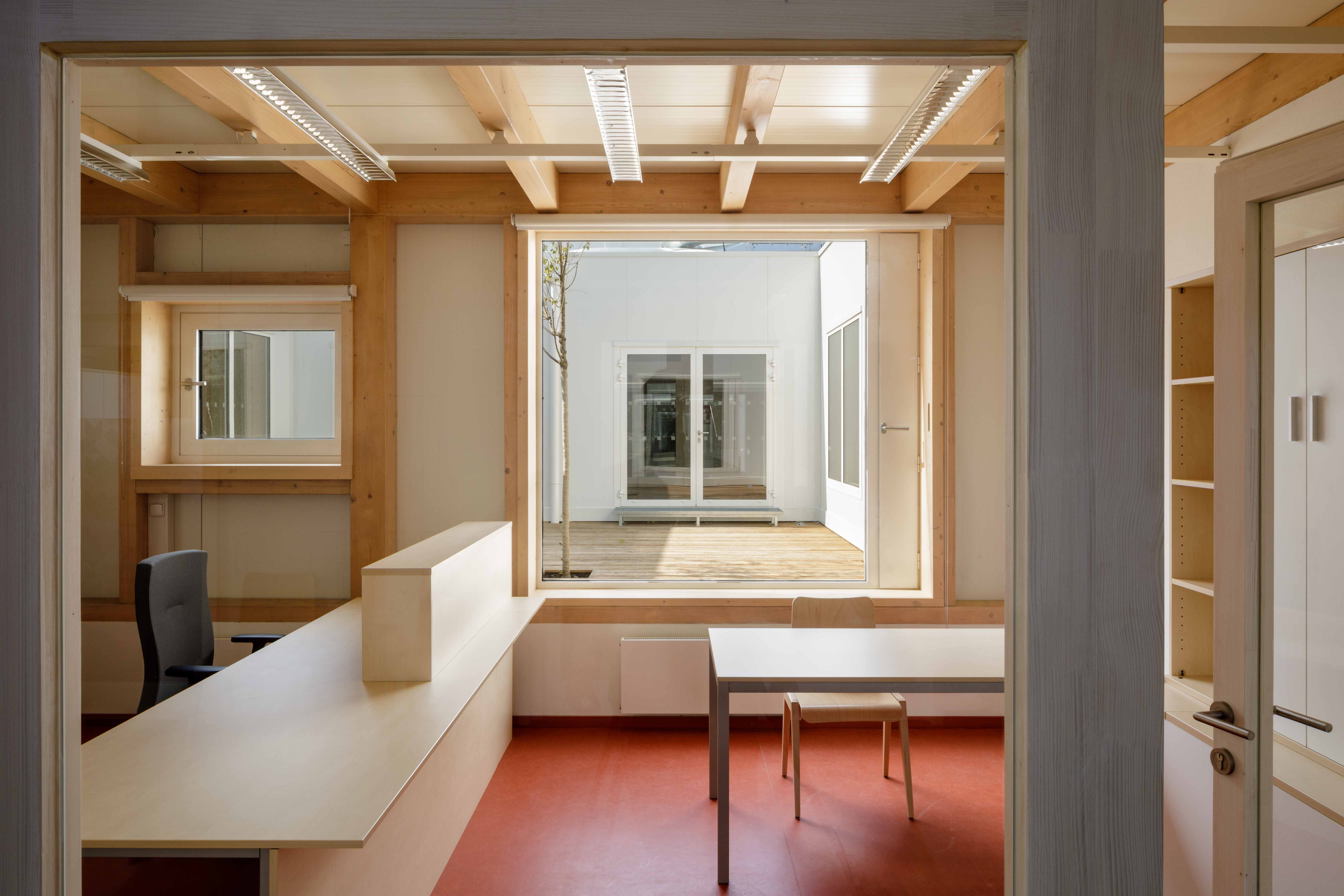 단순한 단층의 모두가 접근할 수 있는 집은 기념비적인 건물이 아닌 모든 연령대가 사용할 수 있는 도구다. 설계의 주안점은 최대한의 개방성과 투명성, 빛과 공기였다. 또, 건물의 규모를 보여주는 것이 아닌 공공 서비스를 강조하고자 했다. 연결통로와 이어진 분리된 4개의 구역에는 의사 사무실, 다목적 홀, 자치단체, 우체국이 있다. 연결통로는 무도회, 행사와 콘서트 등의 다양한 프로그램을 진행할수 있게 하는 ‘보조’ 공간으로 가끔 전시가 열리기도 한다. 내부 아트리움은 내부 공간을 비춘다. 서로 시너지를 줄 수 있는 공간으로 실제 사용에 따라 다양한 역할을 할 수 있다. 실내 공간의 빛과 인테리어는 시민의 성격을 반영한 중립적인 재료를 사용했다. 반짝이는 은백색의 패턴이 들어간 입면은 반짝이며 시민들이 어 잘 알아볼 수 있도록 한다.