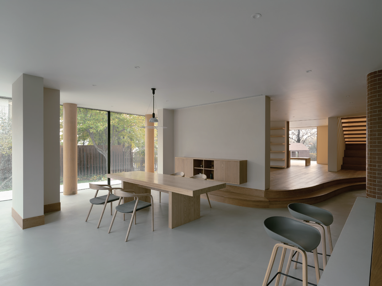 The garden has a manicured atmosphere. The planter stand at the entrance adopts a herringbone frame, reflecting the roof shape of the building. Vines become its surface, as if ‘a green awning was installed’. Past the planter stand stands an old persimmon tree in front of the door, which seems to show an interesting life that goes through a kind of order. On the north side of the house there is a series of terraces that curve downwards, providing several playgrounds. Like two ‘floating islands’, the small observation deck and brick pavilion on the lower level are places good for chatting. In addition, the stone road outside connects the front and back yards, providing an oriental romance. The landscape design shows both openness and privacy. The designer invited WILD-SCAPE, a plant design team, to work together to add a wild and natural feel on the edge of the building site. Now, the ideal house has sweet memories and hopes, and the house becomes a multidimensional space that grows in the countryside. As time goes by in this space, one can enjoy a deep rest that is free, full of breath, honest and true, as if you are in the wilderness.