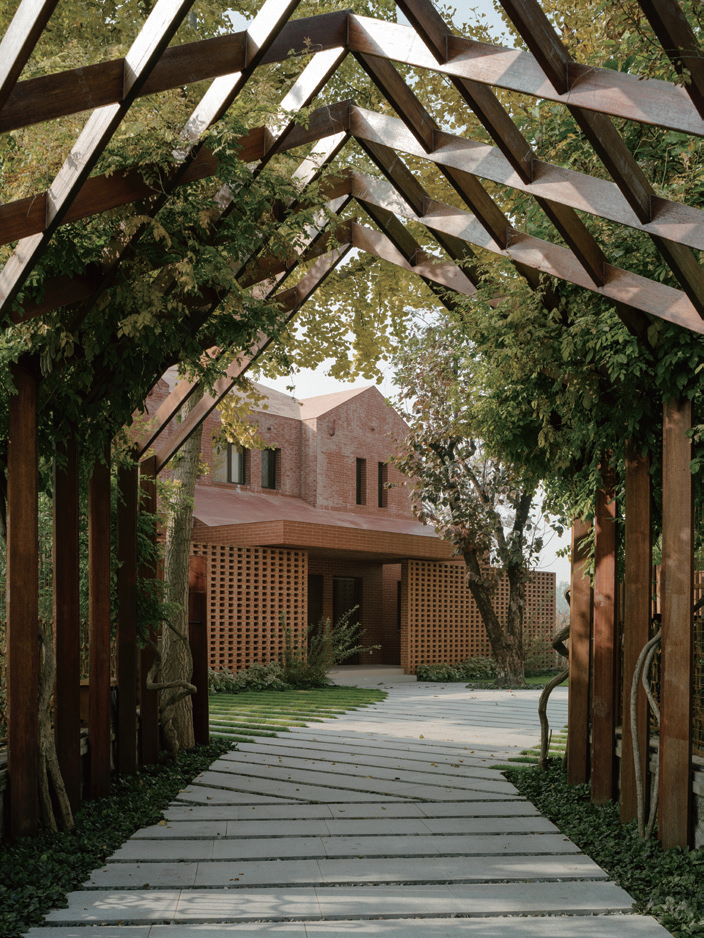 그 정원에는 다듬어진 분위기가 스며 있다. 입구의 화분대는 헤링본 틀을 채택하여 건물의 지붕 형태를 반영한다. ‘녹색 차양이 설치된 것’처럼 덩굴이 그것의 표면이 된다. 화분대를 지나서, 문 앞에 오래된 감나무가 서 있는데, 일종의 질서를 거치는 흥미로운 삶을 보여주는 듯하다. 집의 북쪽에는 아래쪽으로 굽은 일련의 테라스가 있어 여러 개의 놀이터를 제공한다. 두 개의 ‘떠다니는 섬’처럼 낮은 층의 작은 전망실과 벽돌 정자는 수다를 떨기에 좋은 장소이다. 또한 외부의 돌길은 앞마당과 뒷마당을 연결하여 동양적인 낭만을 선사한다. 조경 설계에서는 개방성과 프라이버시가 모두 엿보인다. 디자이너는 건물의 부지의 가장자리는 야생적이고 자연스러운 느낌을 더하기 위해 식물 디자이너팀 와일드-케이프를 초청하여 함께 작업했다. 이제 이상적인 집은 달콤한 추억과 희망이 있고, 그 집은 시골에서 자라는 다차원적인 공간이 된다. 이 공간에서는 시간이 지남에 따라 마치 황야에 있는 것처럼 자유롭고 숨결이 가득하고 정직하고 진실한 깊은 휴식을 취할 수 있다.
