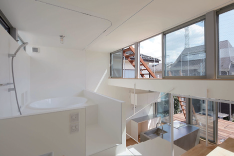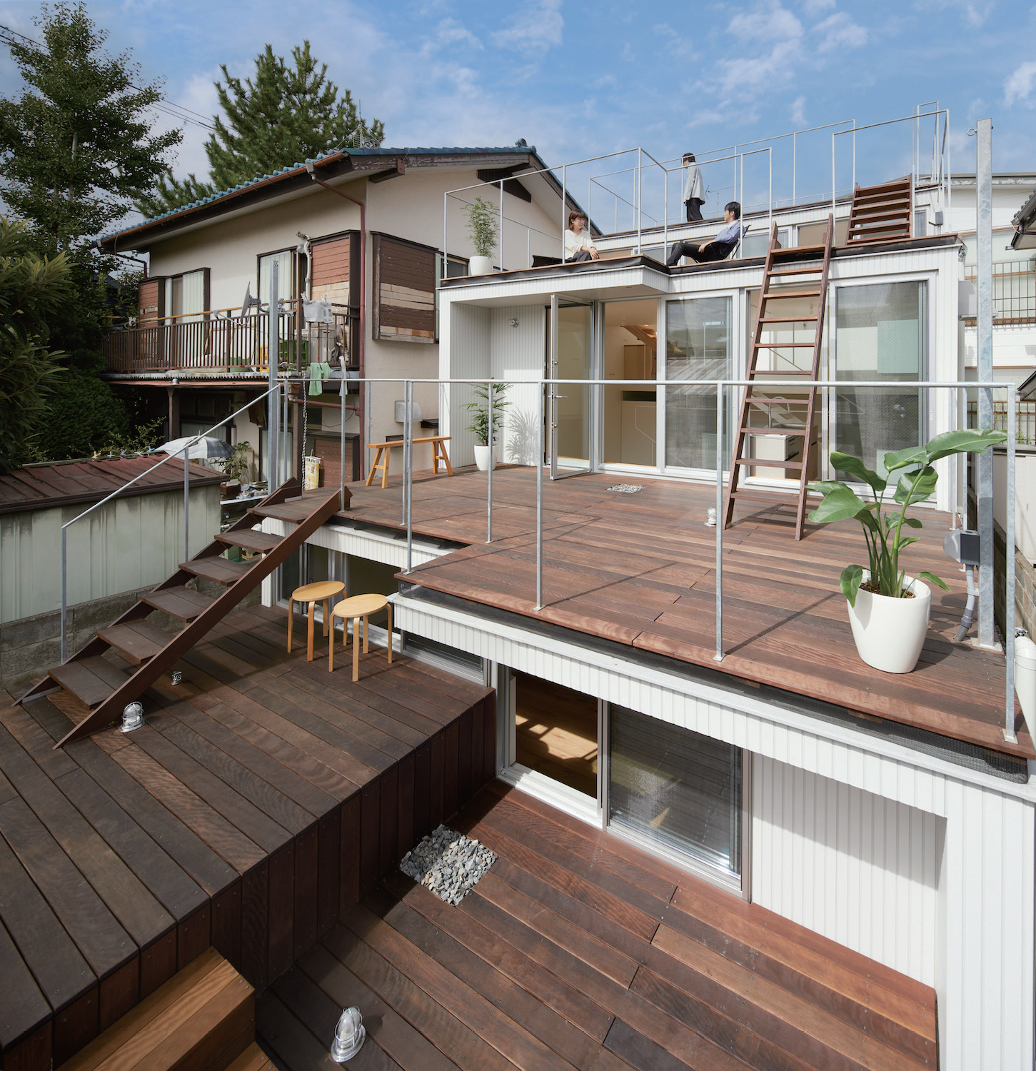 Step Garden House receives warm sunlight throughout the entire space, despite being located in a densely populated residential area. Its innovative design incorporates a terraced structure that gracefully retreats towards the north to maximize sun exposure, suffusing the entire dwelling with warm, natural light and the entire house is used as a garden. When you enter the house, there are wooden decks arranged like a step hill, and this continues up to the rooftop. The first floor is a semi-basement, and the main entrance is on the second floor. When you pass through the approach, you will encounter a wooden deck on the first floor. The interior is planned as a skip floor, connecting the movement outside the house directly. The movement outside and inside the house are connected to each other. The sunlight that the entire house receives shines through the gaps in the interior and illuminates the lower floor. There are stairs and ladders everywhere, allowing free movement between the outside and inside. The wooden decks on each floor are connected to adjacent rooms and can be used as expanded spaces. Some of them become living rooms, dining rooms, workspaces, places to dry laundry, and places to grow vegetables. The wooden decks are all places to spend time in the same way as indoors, providing a feeling of infinite vastness beyond the actual area. It becomes both a garden and a living space.