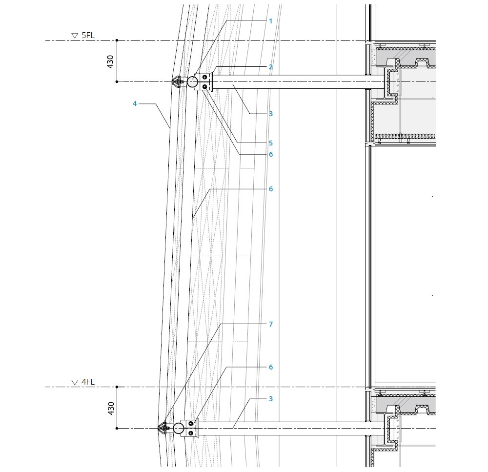 방음, 조망, 채광, 차양, 사용 시간에 따른 요청사항은 공간별로 달랐다. 또한, 건물이 준공된 후에도 쓰임에 따라 이러한 공간에 대한 요구사항은 변경될 필요가 있었다. 따라서, 건축가는 각 실을 어떻게 사용하고 있는지, 창문이 열려 있는지에 상관없이 통일된 외관을 가지도록 더블 스킨 파사드로 설계했다. 높은 고도에서 흔들리고, 최적의 스카이뷰 비율을 허용하기 위해 모든 방향으로 깔끔한 둥근 형태로 만들었으며, 빛과 공기가 순환할 수 있는 다공성 메쉬막을 사용했다.