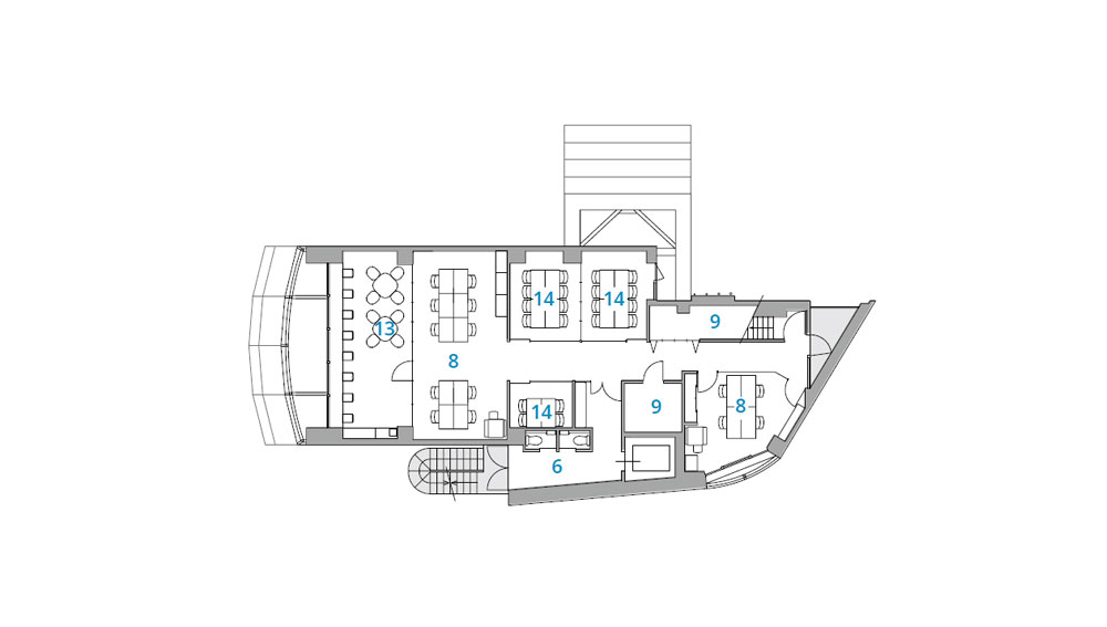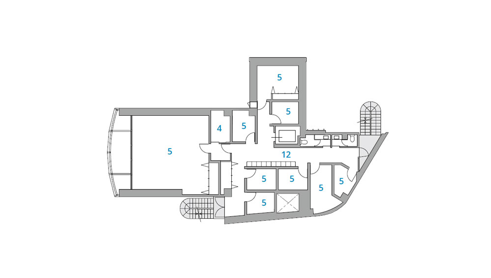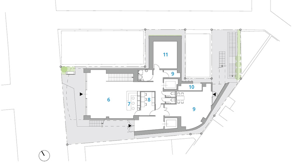 This commercial complex for a music company with a long history includes music classrooms, instrument sales and storage spaces, and the company’s main offices. Located in the Kanda-Ochanomizu area of Tokyo, which is known for its many music stores, the lot is small and irregularly shaped. The client requested a building that efficiently combined a variety of functions, including rooms for lessons in piano, violin, and other instruments; a hall for recitals; a professional recording equipment shop; storage for wholesale instrument sales; and offices to manage these various aspects of the businesses.