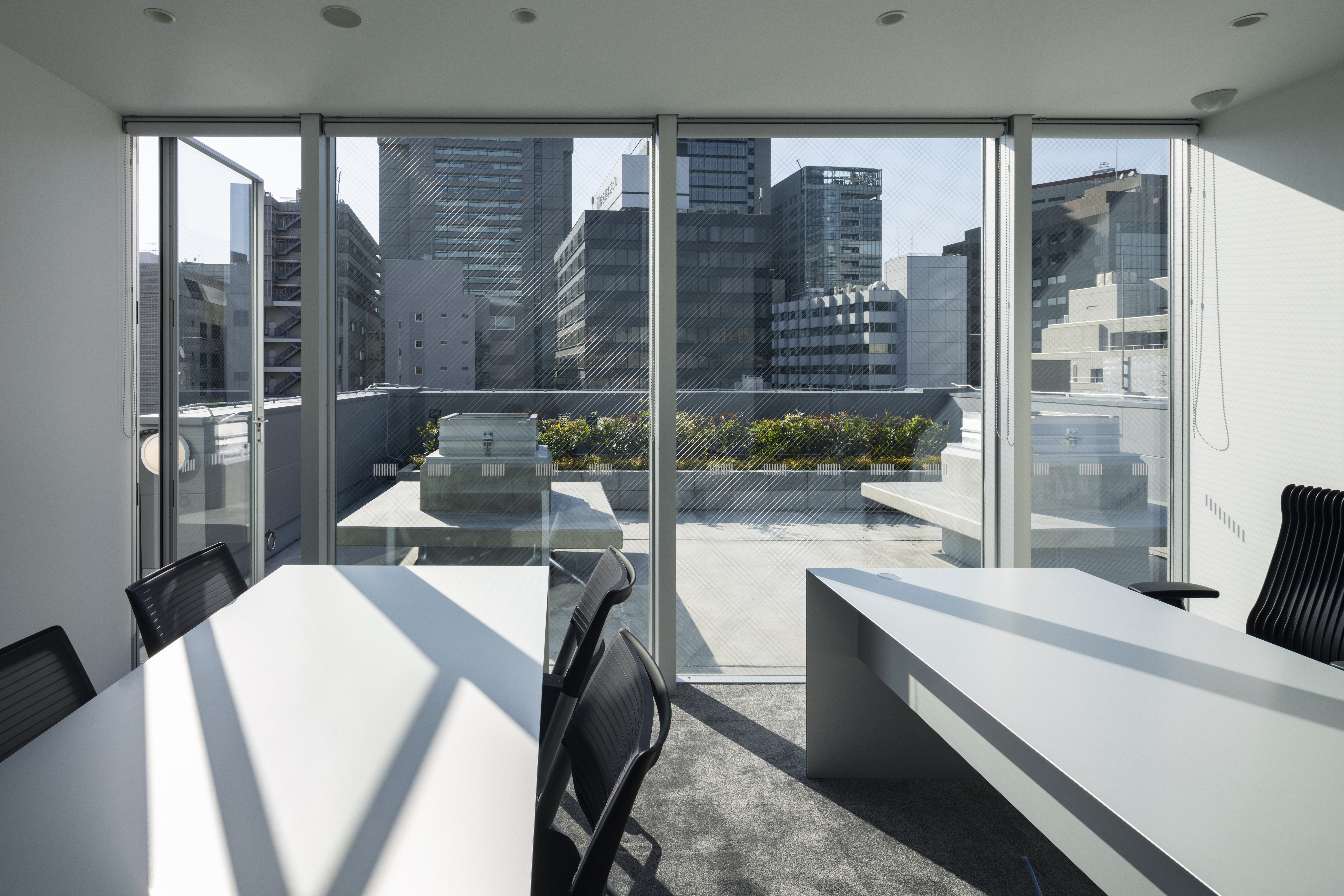 Made of polyester fibers coated with PVC resin, the fireproof exterior mesh membrane blocks visibility from the outside while allowing those inside to see out. A solar reflectance rate of 33 percent lowers the air conditioning load by 28 percent. The membrane can be bent three-dimensionally, and because it is light and perforated, there is little structural stress from either the weight of the material itself or wind pressure. Because there is no danger related to the material falling to the ground, it is easy to replace and maintain and can be reused. The covid-19 pandemic has increased the appeal of facades such as this that enhance natural ventilation while maintaining privacy.