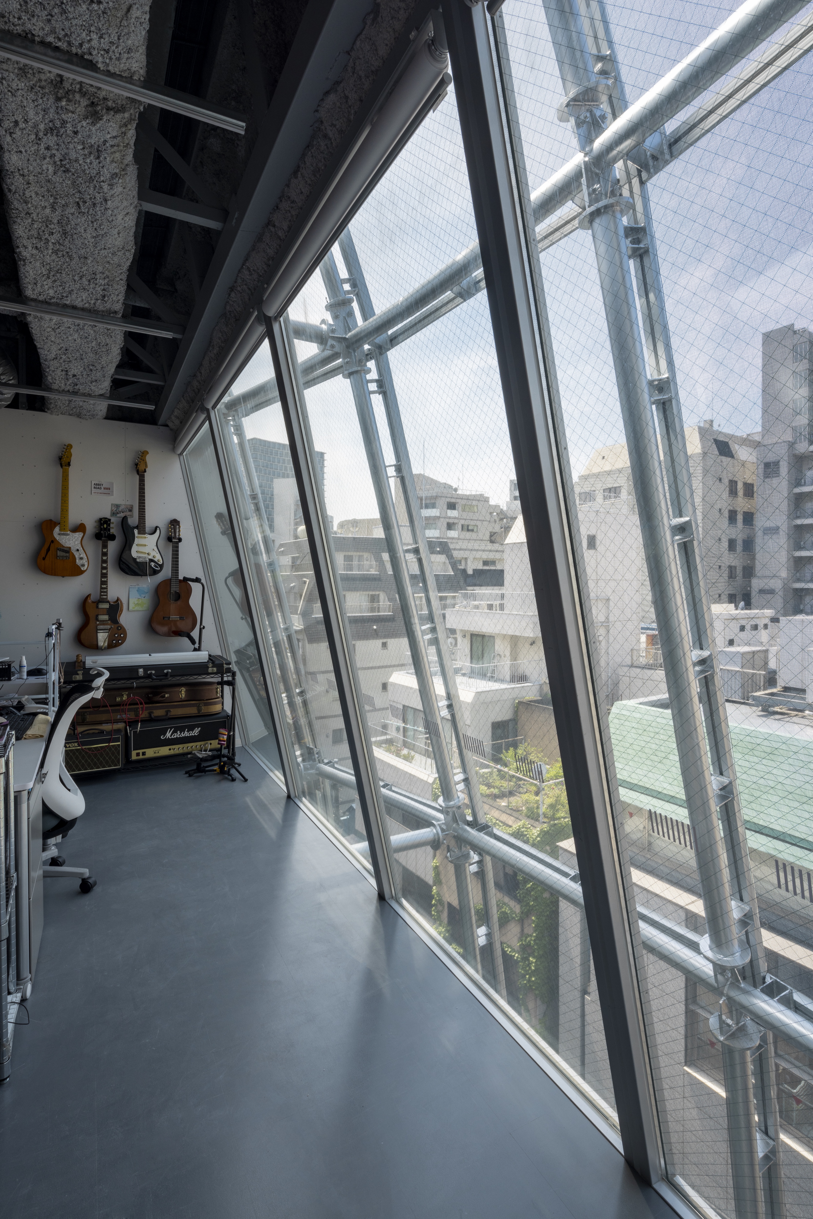 The form of the building takes into account the irregular lot shape, codes related to height and setback, and necessary elements such as emergency stairs, balconies, plumbing, and wiring as well as the need to express the company’s identity. We incorporated shapes inspired by various musical instruments, adjusted to maximize capacity. The mesh-covered façade evokes a speaker sending music into the neighborhood, transforming the building into a giant sign advertising the company inside.