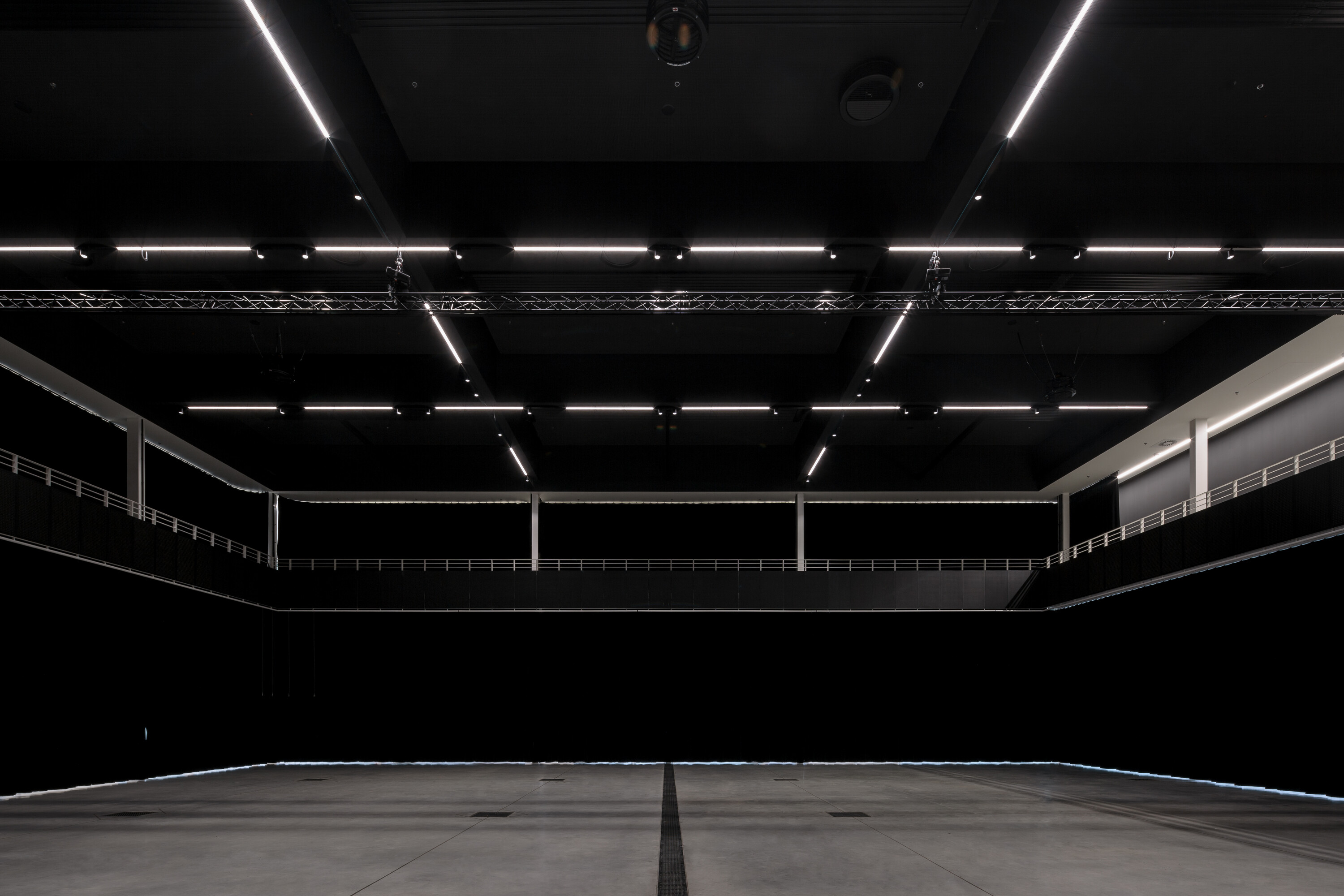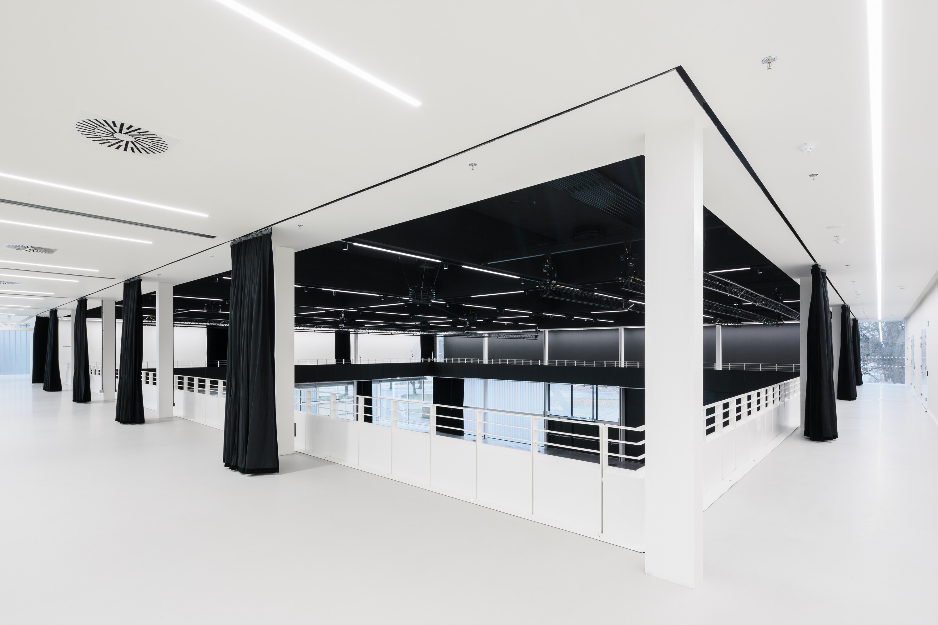 The interior is designed to be open and flexible. In order to create as much space as possible, all the ancillary facilities were concentrated in the outermost wing, leaving the rest of the building free. The pavilion can thus be modified by a system of draperies - curtains from the exhibition or gallery space to the closed concert hall. When the curtains are opened, the surrounding greenery flows directly into the interior of the hall, while when they are closed, a perfect blackbox is created. One finds oneself inside and in the green at the same time. A limiting yet beautiful element was the existing structure of the building, where the exposed steel structures were preserved, thus further de-masking the entire space and drawing out its original structure - the soul. This principle also determined the design direction of the interior, where, in contrast to the almost minimalist exterior, a more technicist approach was taken on the edge of high-tech architecture. Thus, various technical equipment systems, from the massive HVAC ducts to the red piping of the fire system, accompany us through the interior. The atmosphere of the interior is softened by the soft light permeating through the copilite wall, which also shows the outlines of the events of the exterior.