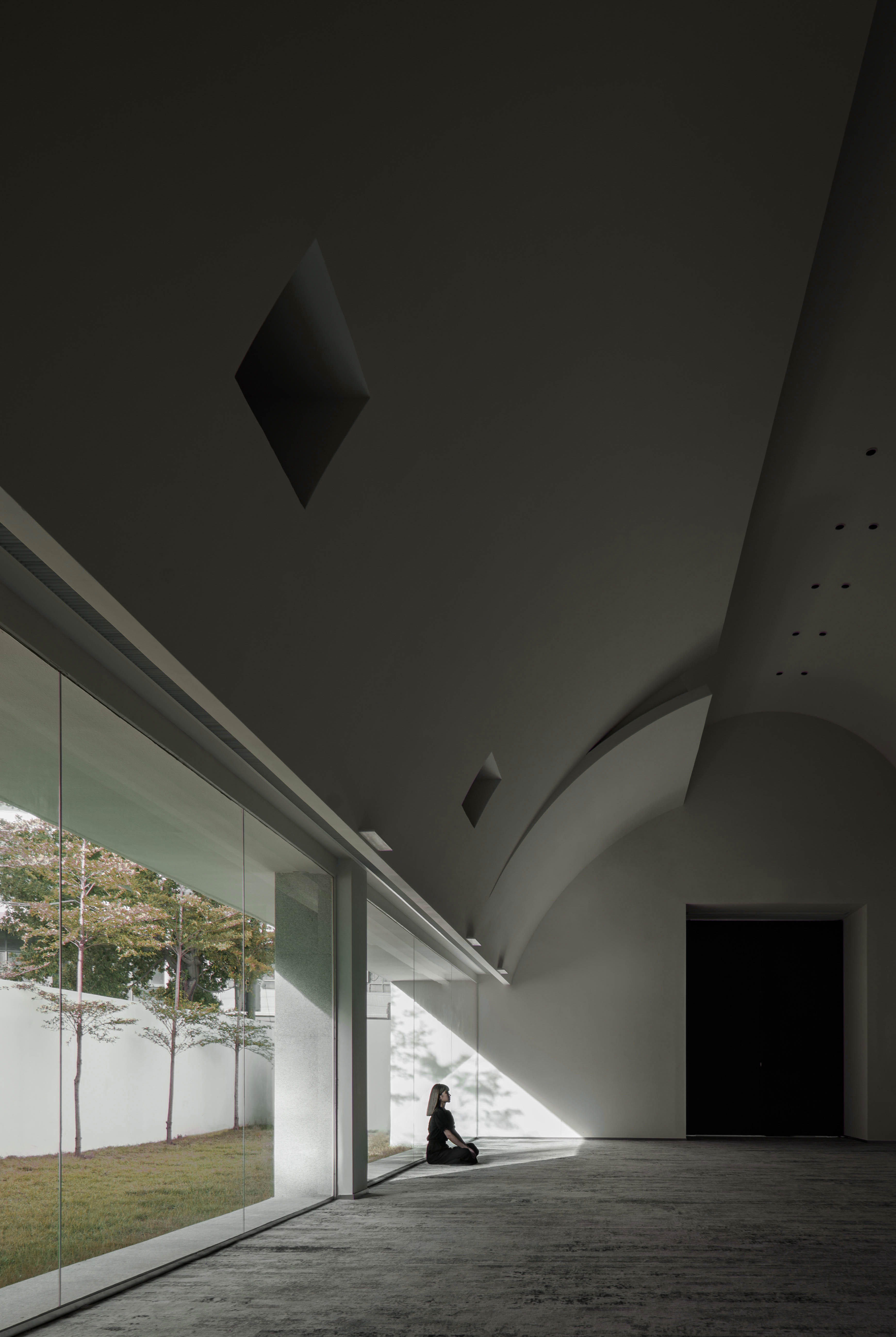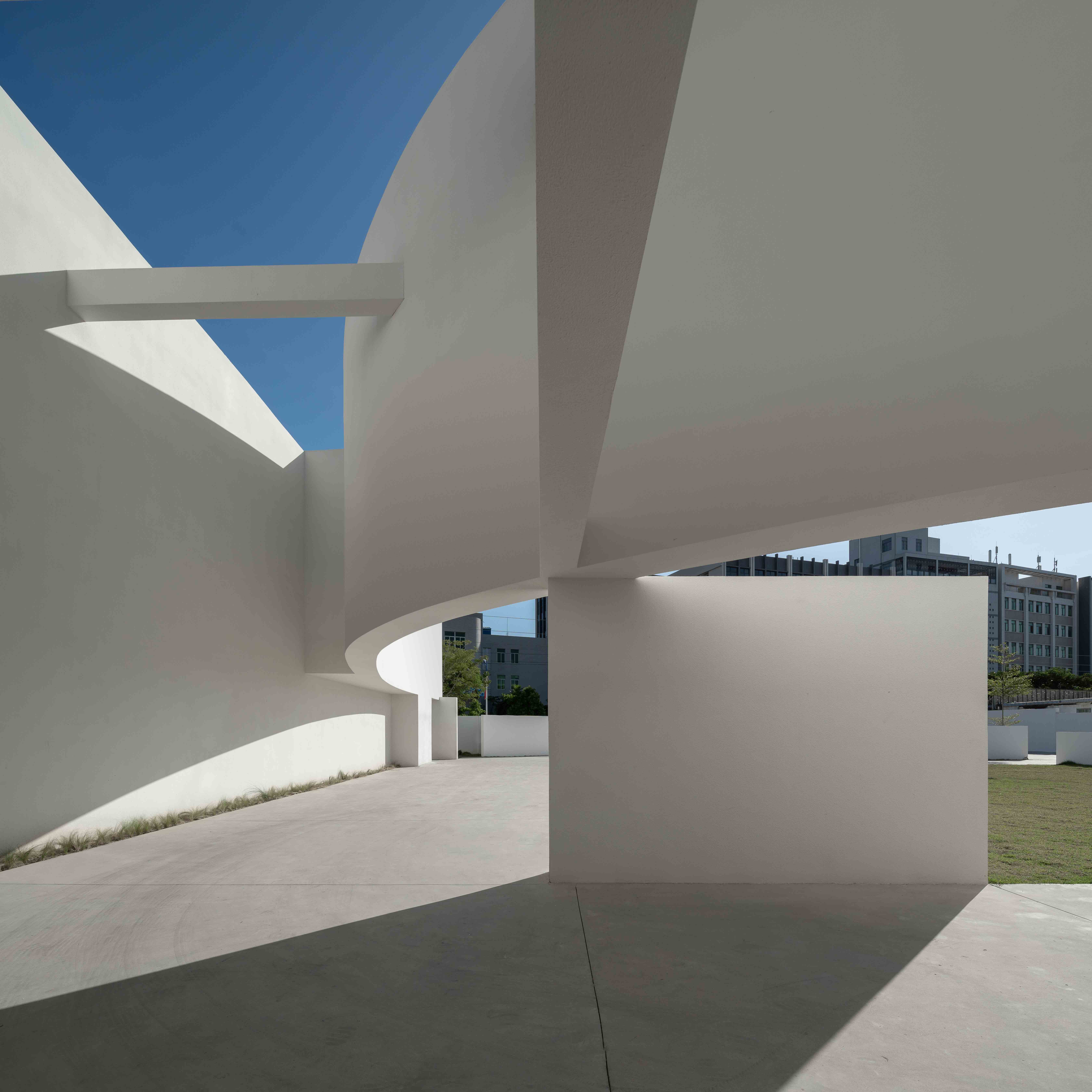 Playing with abstract geometry, the design team created a simplistic, artistic building that invites visitors to explore. Drawing on the wisdom of traditional courtyards, the inner and outer yards gather people and present a modern form. The architecture creates an iconic skyline, with a curve producing an eye-catching visual identity, which adds an aesthetic and artistic touch to the mediocre village. The free changes of light and shadows enrich the form of the space throughout the day, resulting a varying aesthetic and a more intriguing space. The free light and shadow effects are preset through design strategies. The light sets off structures and space. A simple building is featured common steel structures and large white wall surfaces, and ensured the perfect execution of the design scheme. The minimalist aesthetics of the building conveys a sense of affinity. It's simple, yet inclusive.