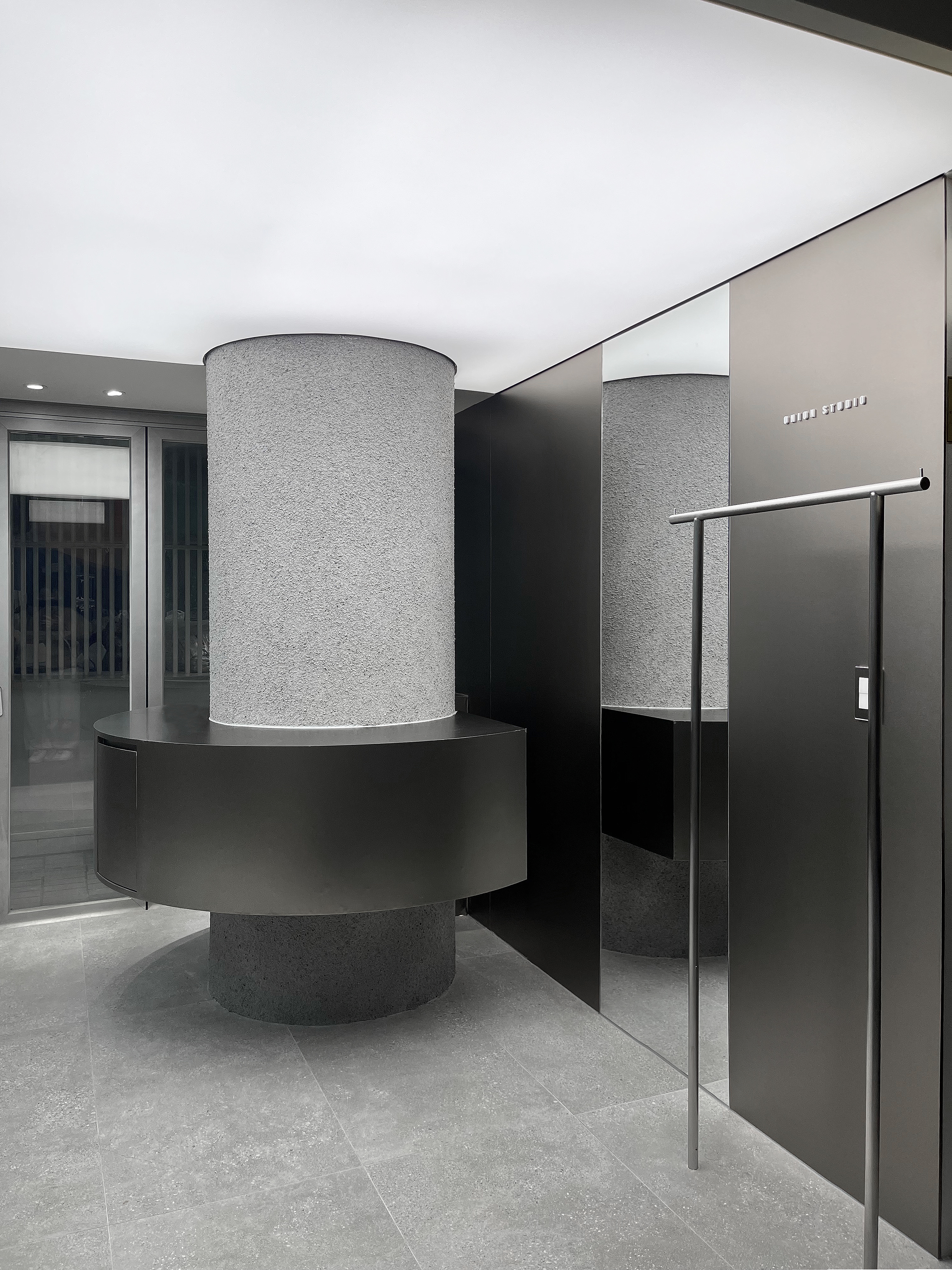 15m²의 매장에 많은 면적을 차지하고 있어 단점이 될 수 있는 요소인 1000Ø의 기둥은 튜브 형태의 카운터로 활용하였습니다. 화강석의 거친 질감을 가진 테라코타 마감재를 사용하여 조형물로 보여지도록 했으며 많은 의류 매장 사이에서 주목도를 높이는 것을 의도했습니다.