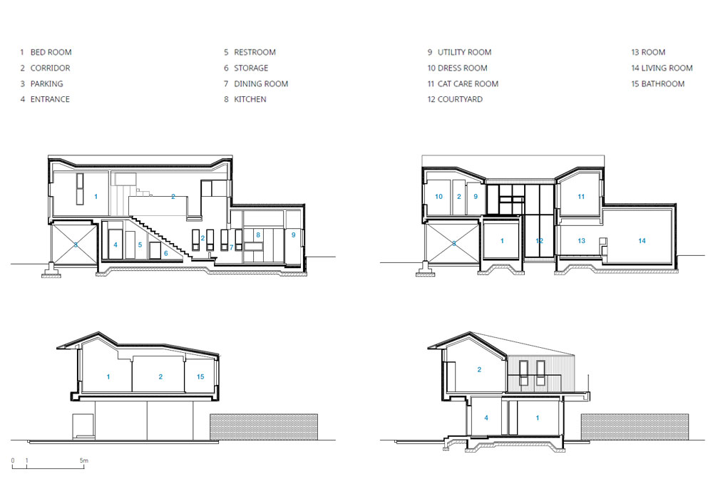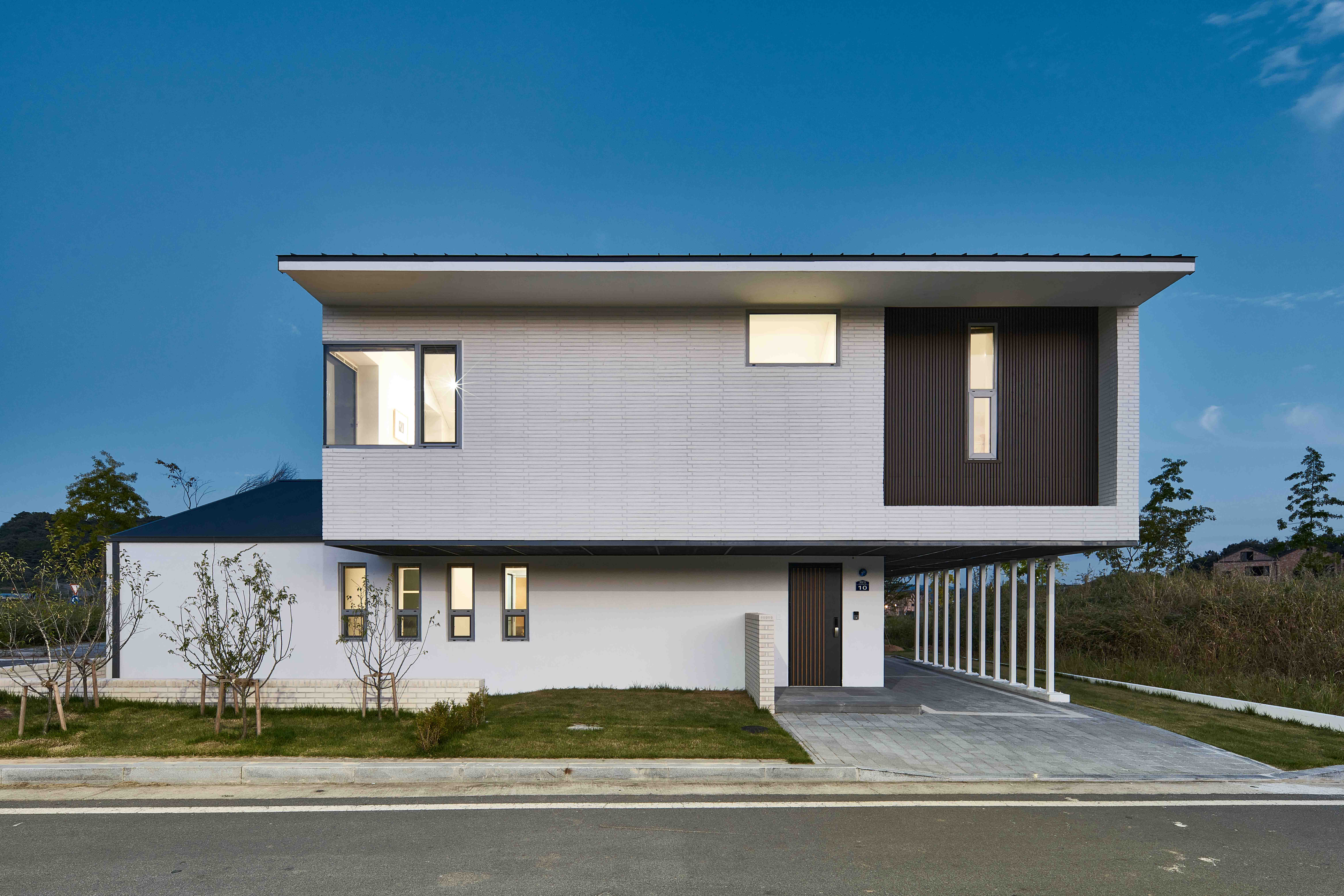 2층이 지면과 분리된 형상과 반대로 1층은 외부 대지와 적극적으로 조응하는 집이다. 높은 층고의 거실을 원하는 건축주의 요구에 맞춰 거실의 지붕을 올리고 바닥을 내렸다. 내린 바닥에 맞춰 낮은 정원을 배치하고, 낮은 담을 두어 남쪽의 옆집과 접하는 마당과 구분하였다. 정원을 바라보며 앉을 수 있게 2층 캐노피 바닥 하부엔 벽돌을 둘렀다. 정원은 2층 옥상과 연결되는 자그마한 소정원으로 연결되고 거실 옆에 붙은 작은 내실에서 내밀히 바라볼 수 있도록 계획하였고, 복도 건너편엔 식사 공간과 마주하는 작은 정원을 두었다. 1층과 2층이 교차하는 부분은 최소한의 동선 공간을 제외하곤 모두 비웠다. 커튼월 창을 통해 들어오는 빛을 담을 수 있도록 다소 높은 막힌 난간벽으로 계단을 두르고, 유리 난간과 벽 난간을 교차로 계획하여 공간의 변화를 줬다. 2층 천장면은 박공 지붕면을 따라 계획하여 특이한 공간적 경험을 할 수 있다.