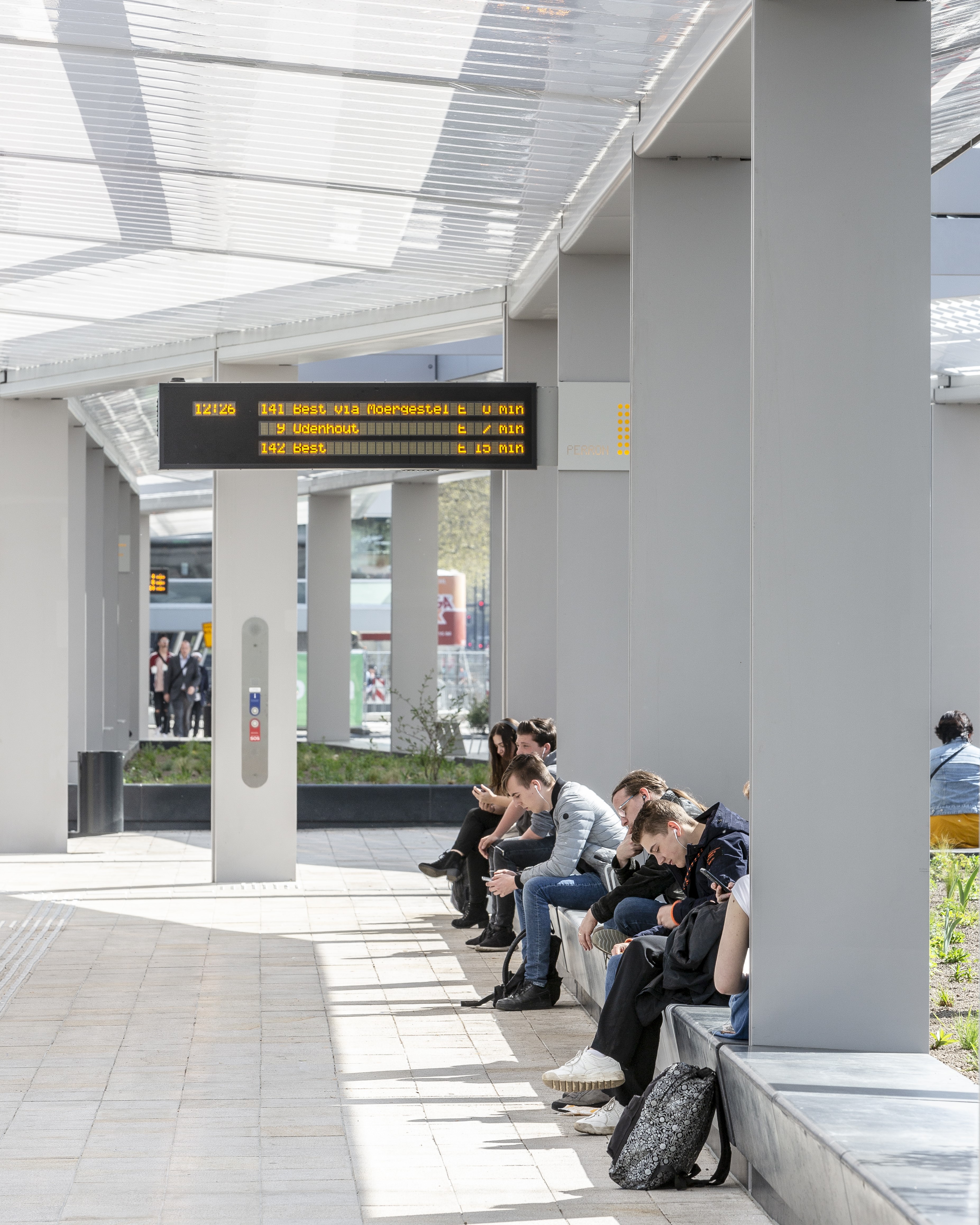 Recently, the new bus station in Tilburg was taken into use. Just like the renovation of the train station and the new bicycle parkings in the railway zone, the bus station was designed by cepezed architects. The new public transport facility generates its own energy and its design is thoroughly integrated. The new bus station is a part of the large-scale revitalization of the Tilburg public transport hub. It is fully tailored to the comfort of the travellers and to a clear and pleasant traffic flow. The facility is situated on the west side of the train station, roughly at the place that also occupied the former bus station, but with the location of the former Tilburion apartment block included on the far west side. The basic setup consists of a series of very thin columns with an evenly minimalistic awning structure on top of them. The construction forms a triangular circuit with a length of over 160 meters and an open space in the centre. The bus positions are arranged around the outer side; six for boarding and one for deboarding. The awning circulation runs from 14 to 30 meters width in total and has two offsets in its contour. These are primarily functional and align with the urban context, but visually, they also resonate elegantly with the monumental roof structure of the train station. This also has an articulated structure and moreover seems to float, just like the bus station awning.