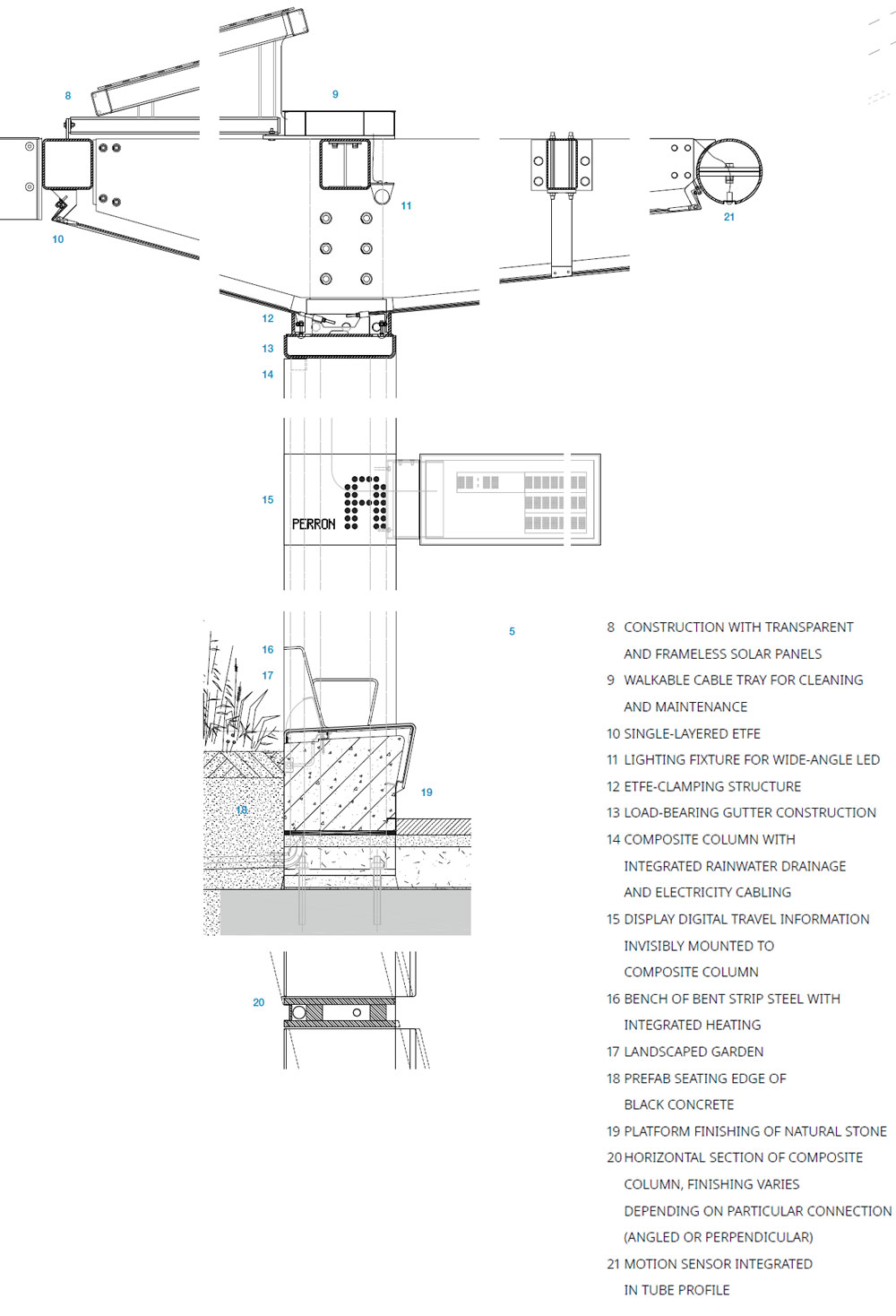 미적인 부분은 물론, 편안함과 기능적 측면, 소재 사용 등 여러가지를 고려하였고 가능한 한 기본에 충실한 구조와 구현 그리고 디테일에 보다 많은 신경을 썼다. 건축가 세페즈드는 버스 정류장을 위한 명확하고 순수한 시스템을 구상하고 세심하게 설계했다. 예를 들면, 철판과 스트립으로 구성된 얇은 기둥 안에 배수 및 전기 배선을 넣었고, S.O.S. 버튼과 인터콤도 기둥 하나에 모두 넣었다. 중앙내 하중 안정 빔 역할을 하는 접힌 강판은 홈통 역할도 한다. 파빌리온에 인접한 테라스의 조명은 해당 구역에 차양 구조에 걸쳐 있는 빔으로 합쳐진다. 검은색 콘크리트 좌석 가장자리에는 난방 기능을 탑재한 스트립 스틸로 제작된 여러 좌석이 있다. 내 하중 홈통의 배수구는 늘어난 ETFE 호일을 고정하기 위해 사용했으며 디지털 정보가 담겨있는 디스플레이는 보이지 않게 고정되어 있다. 파빌리온은 차양의 전반적인 안정성을 위한 기능을 갖추고 있다. 또한, 동작 센서는 14m마다 차양의 강철 가장자리에 있으면서 버스와 사람의 움직임에 반응하여 에너지 사용은 최소화 하면서 모든 상황에서 조명이 충분히 작동하도록 해준다. 버스 정류장은 포용성 또한 고려하여 설계되었다. 예를 들어 경사로가 있어 휠체어를 타고서도 높은 테라스에 갈 수 있으며 테라스와 플랫폼 사이의 핸드레일에는 점자 표시가 되어 있다. 차양의 ETFE 호일은 자체 청소 기능이 있어 유지 관리가 비교적 용이하다. 태양열 패널과 전기 장비의 관리를 위해 차양 순환은 파빌리온과 걸을 수 있는 케이블 홈통을 통해 오고 갈 수 있다. 모서리를 최소화 하고 전체적으로 장식이 없는 디자인은 청소 비용을 줄여준다. 또한, 미래를 대비하여 전기 버스 사용의 증가에 따른 전기 버스를 빠르게 충전할 수 있는 추가 전기 장비를 배치할 준비도 되어 있다.