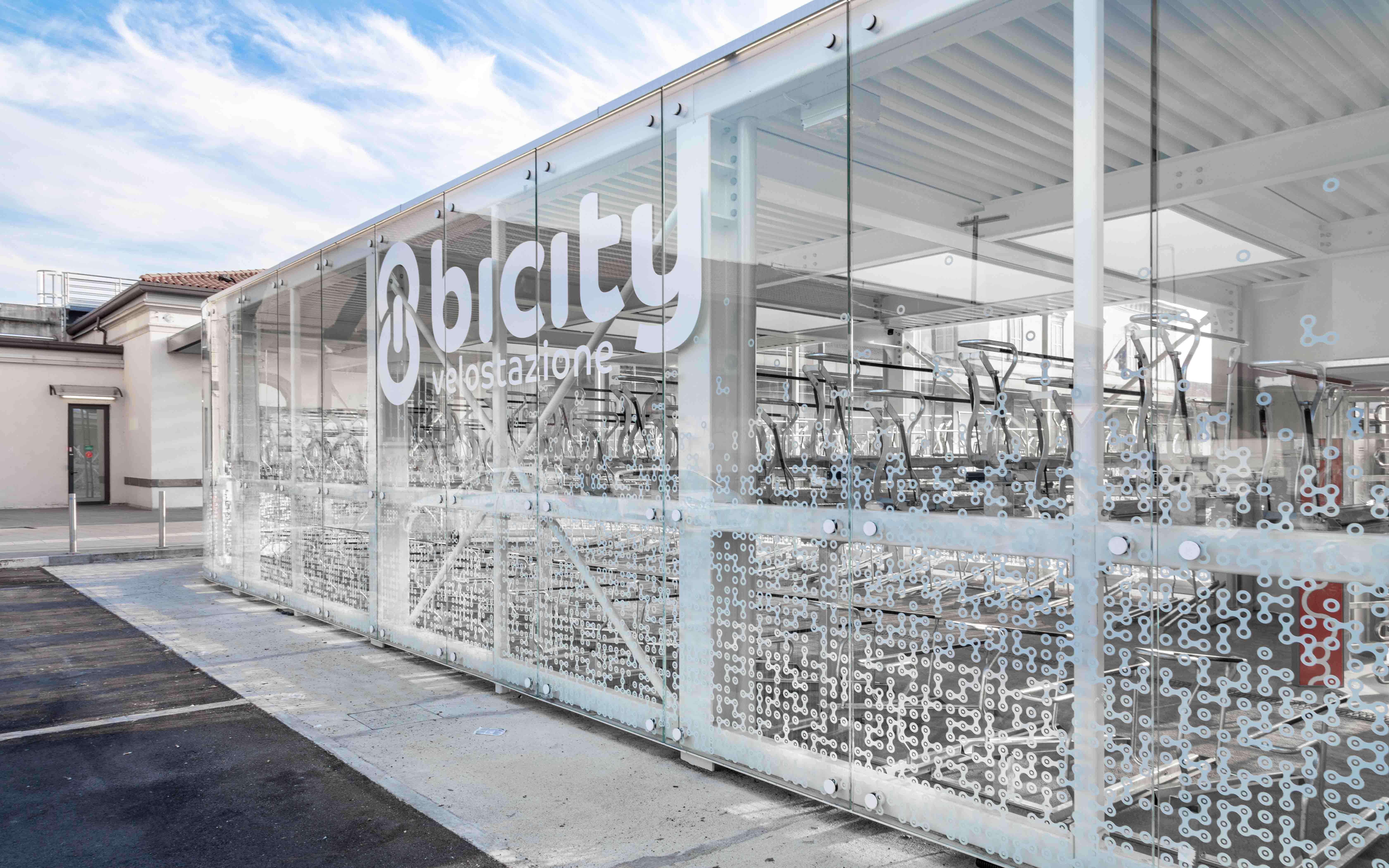 The first bicycle station in Bergamo is set in a strategic and highly relevant location on the edge of the historic centre and close to the train station. The facility was designed by Studio Capitanio to carry out the green policies on cycling enablement as integral part of the intermodal connection hub and the future urban regeneration of Porta Sud train station. The low-tech infrastructure, completely reversible, where transparence becomes expression of safety and accessibility, stands on the east side of Piazzale Marconi, recently requalified in a major upgrade by Portuguese architect Ines Lobo. The objective of the project was to insert a new element, integrated in the contemporary development of the square, providing a centre of interchange between modes of transport: public transport, cycling and walking. The new service for citizens and tourists, catering for 132 bicycles, was dry laid on only 200 sqm of an already developed area. Bicity is the name of the latest element of soft mobility offered by Bergamo City Council, which sees the first bicycle station being built with financial support from the Ministry for Environmental Transition.