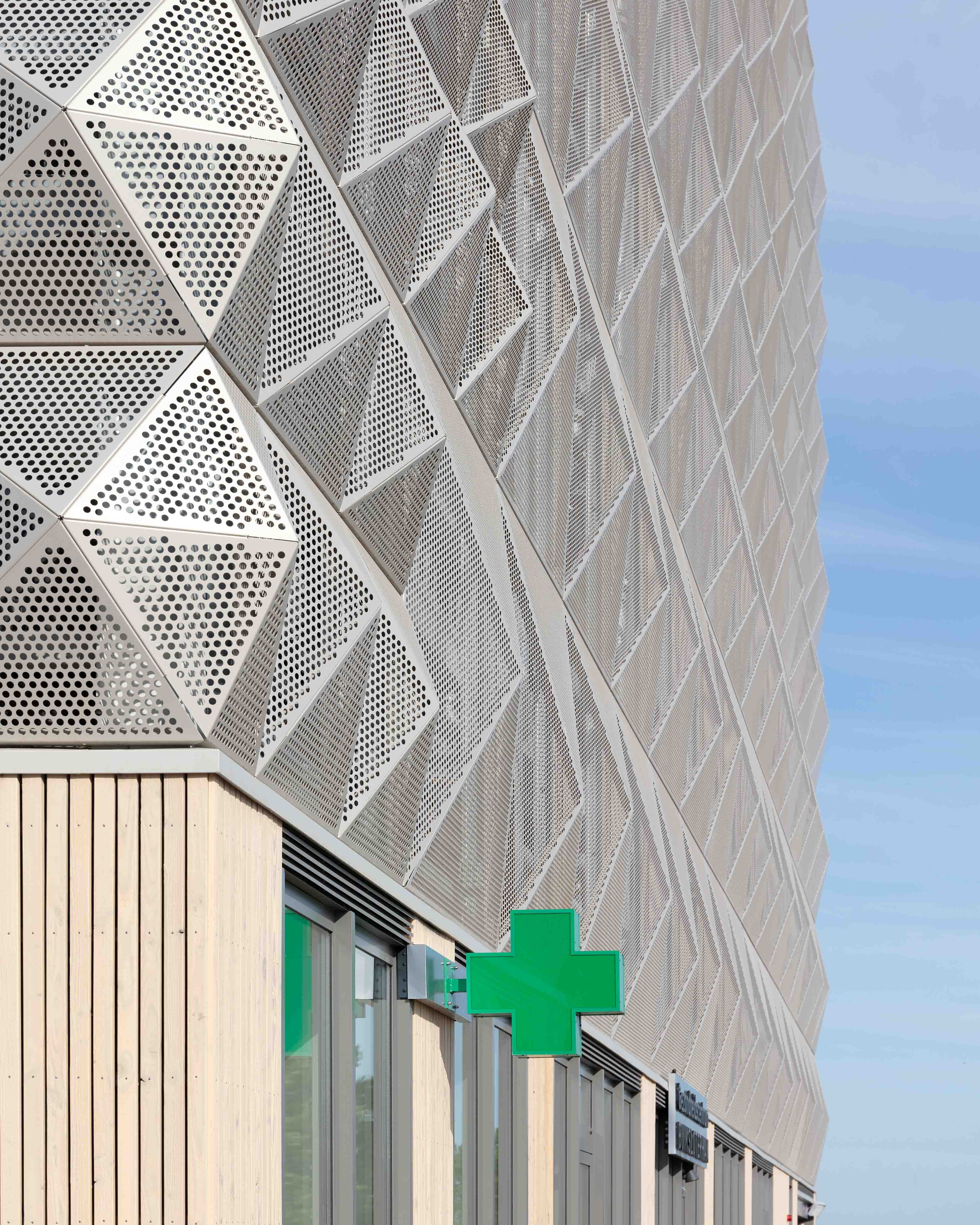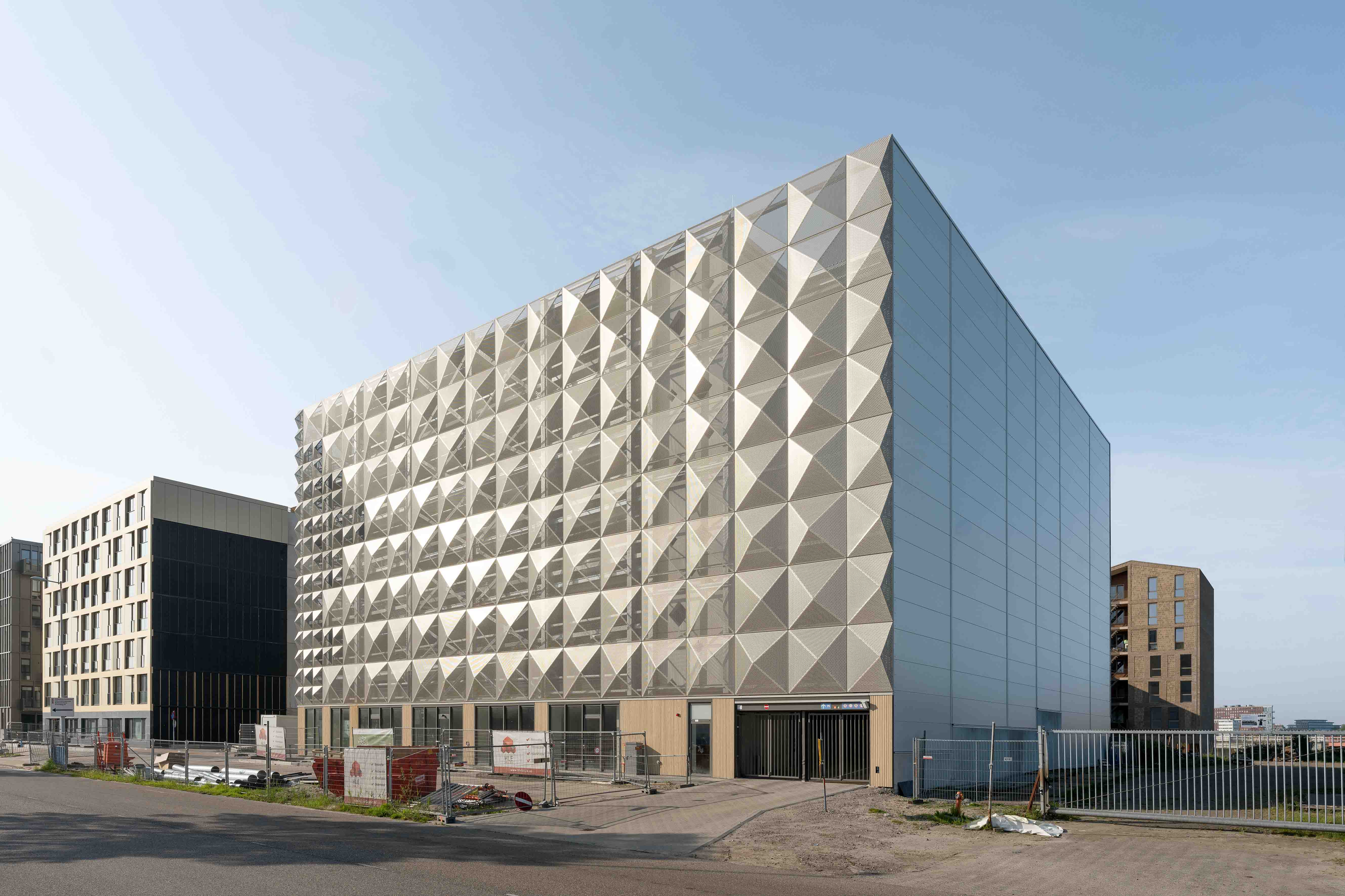 The architect has completed a 250-space community car park incorporating a health centre at ground level in Buiksloterham in the north of Amsterdam. The design of Parkeergarage A1 had to answer the question of how this transport infrastructure building could find its rightful place in its largely new dense mixed-use neighbourhood. How does a car park relate to the houses and apartments built next to it? The distinctive quality of the steel mesh diagrid elevations of Parkeergarage A1 addresses this question by making it read less like a car park per se and more like an entrance to the neighbourhood. The relief pattern of the facade catches the light and animates its form in ways that break down the volume of the building while playing on the industrial past of its context and its particular building typologies, like the non-descript sheds that give little indication of what is contained within them. On the street level, timber slatted cladding introduces a warmer, tactile and more human interface. The natural wooden finish contrasts with the cooler sleek steel architecture above.