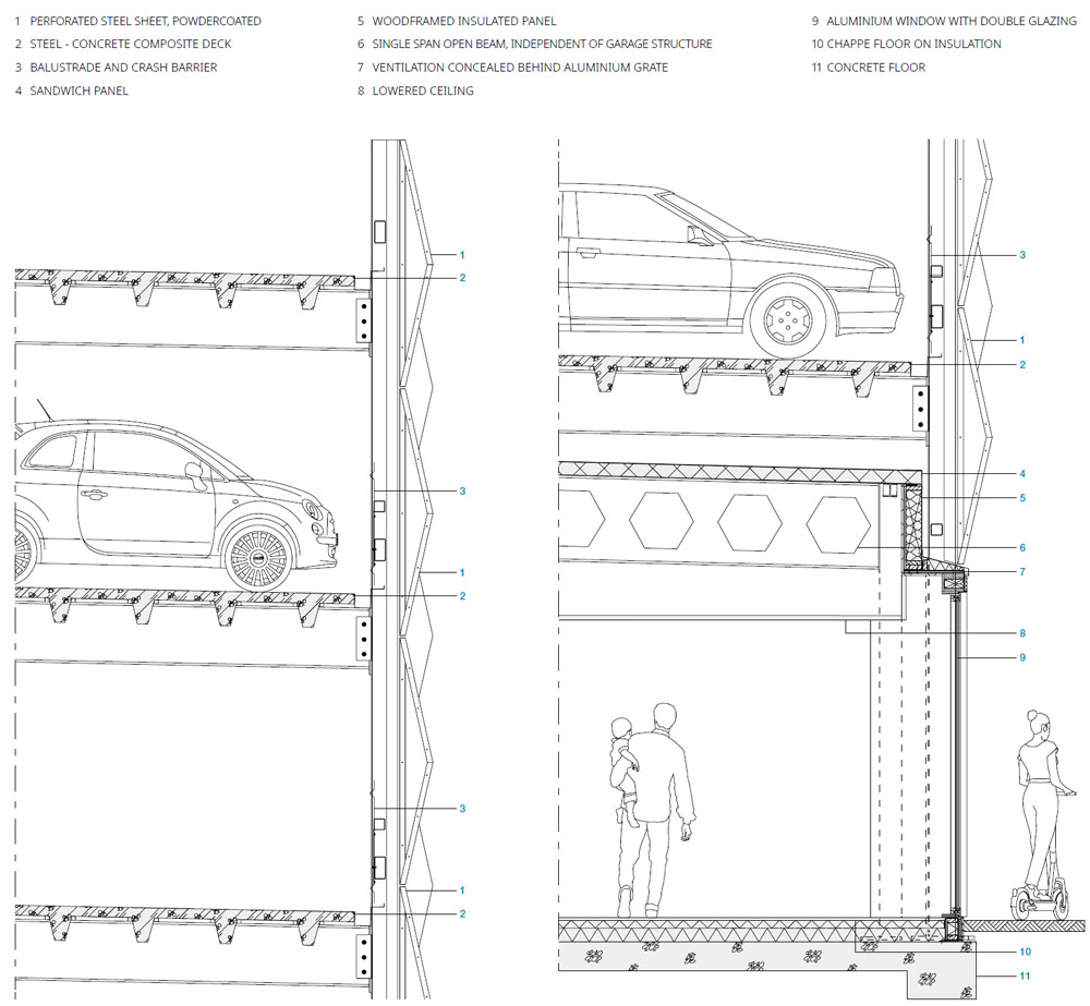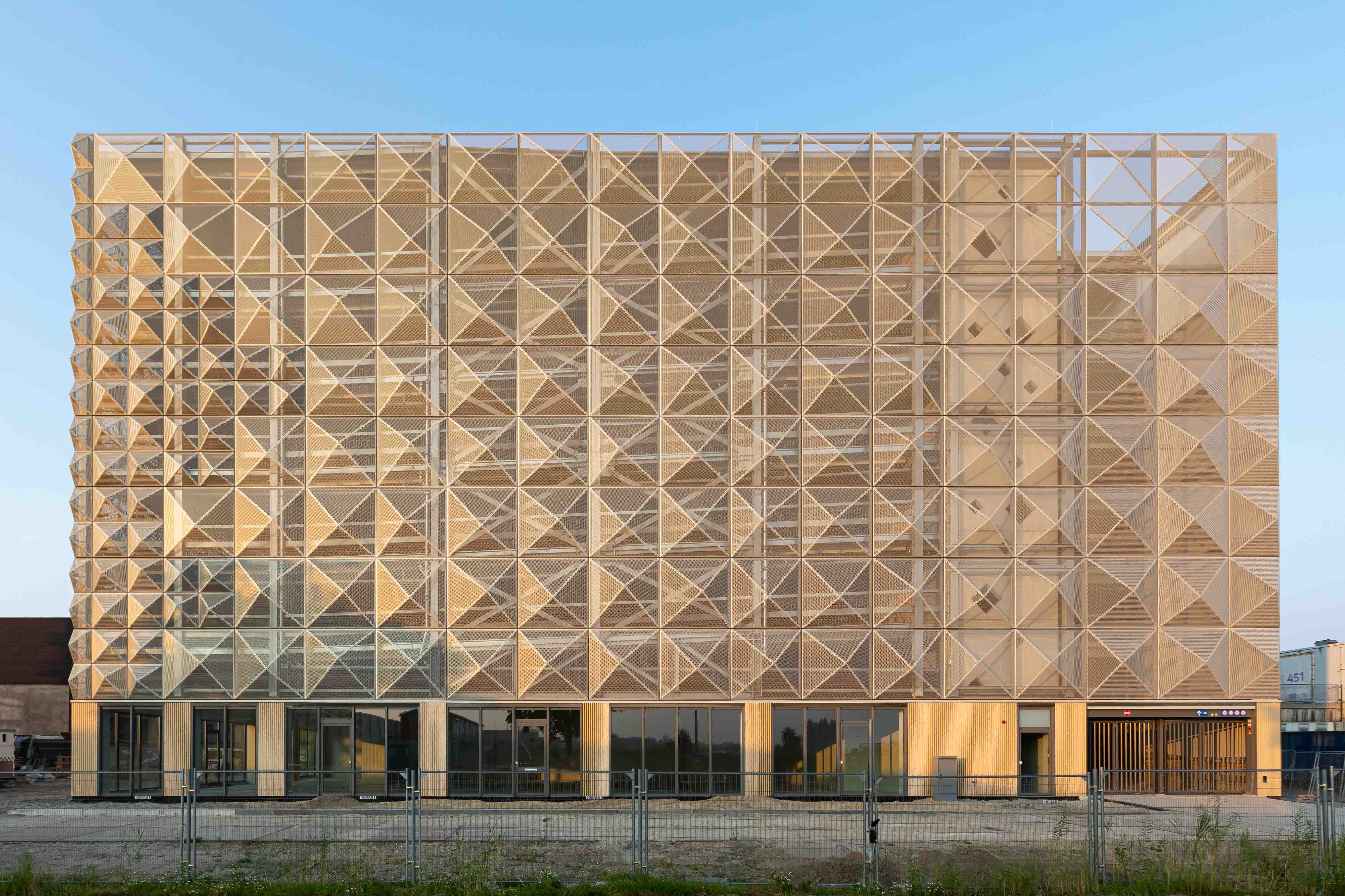 The architect has completed a 250-space community car park incorporating a health centre at ground level in Buiksloterham in the north of Amsterdam. The design of Parkeergarage A1 had to answer the question of how this transport infrastructure building could find its rightful place in its largely new dense mixed-use neighbourhood. How does a car park relate to the houses and apartments built next to it? The distinctive quality of the steel mesh diagrid elevations of Parkeergarage A1 addresses this question by making it read less like a car park per se and more like an entrance to the neighbourhood. The relief pattern of the facade catches the light and animates its form in ways that break down the volume of the building while playing on the industrial past of its context and its particular building typologies, like the non-descript sheds that give little indication of what is contained within them. On the street level, timber slatted cladding introduces a warmer, tactile and more human interface. The natural wooden finish contrasts with the cooler sleek steel architecture above.