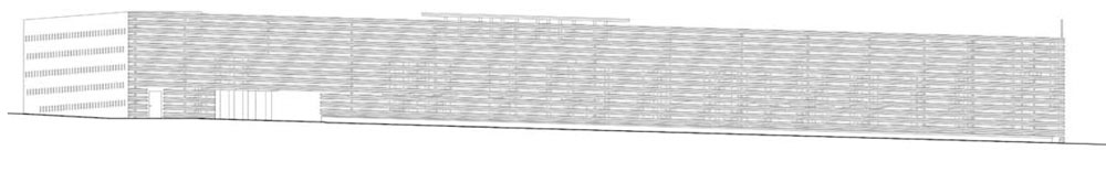 The two-storey building completely from reinforced concrete will allow parking up to 200 cars on three levels. On the plan it forms a triangle with one convexly curved side, it follows slope of the land and respects the terrain. The layout contains parking spaces with a ramp and two communication cores. The facade from the north consists of road barriers with ventilation functions. These barriers are bent to the facade radius = bends. The facades of the east and south are from reinforced concrete with small ventilation holes with diverse pattern and will allow climbing plants to grow. These openings in wall are constructed from fragments of road barriers, the same type such as on the north facade and they are used as lost formwork. They are welded together with different angles. They protect family houses in the immediate vicinity of the parking house from dazzling of car headlights at night. Inside these holes creates filtered interior lighting, scattered fragmented light, similar to what we know from the Orient. Elements of hot-dip galvanized barriers are used in the way that optically and expressively connect all three facades of the building.