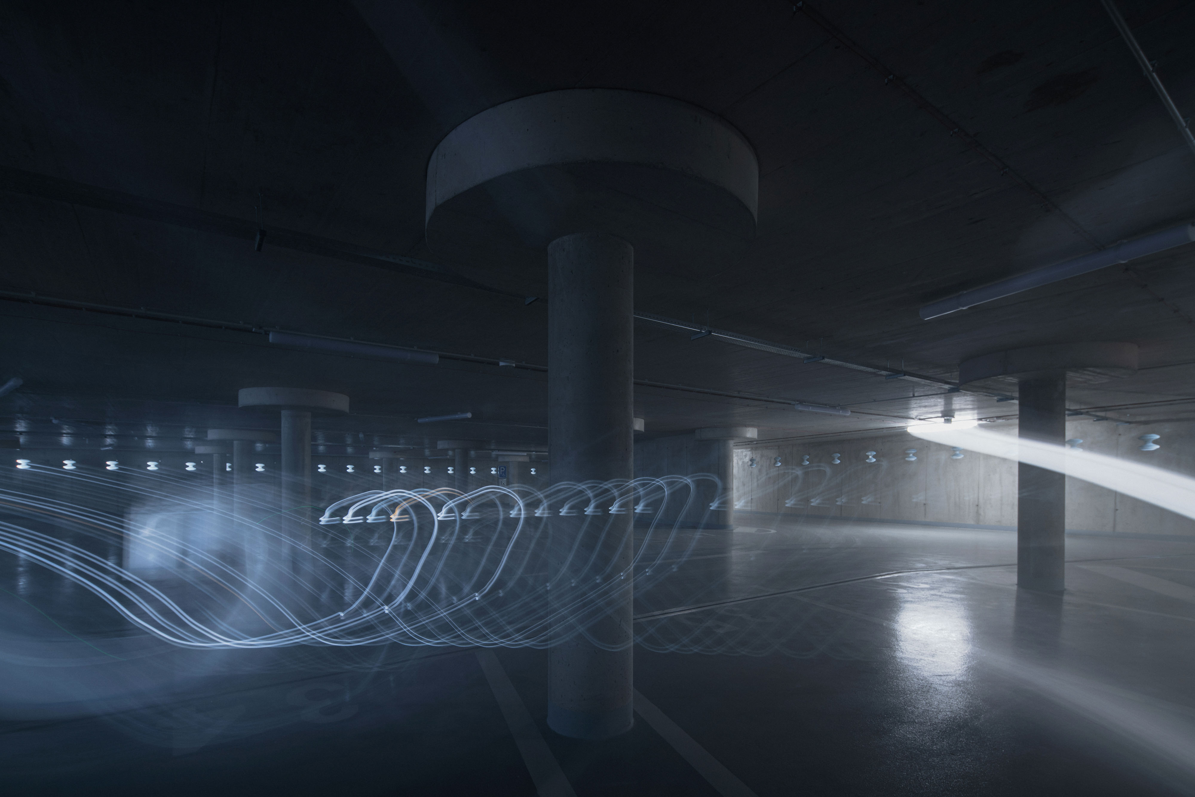 The LED lighting placed on the barriers of the northern facade refers to the long exposure car passage. The pond in front of the parking house collects rainwater and thus helps retention to utilize water. The three roofs at the highest level of the building are covered with vegetation. The whole building should drown in the green in the future.