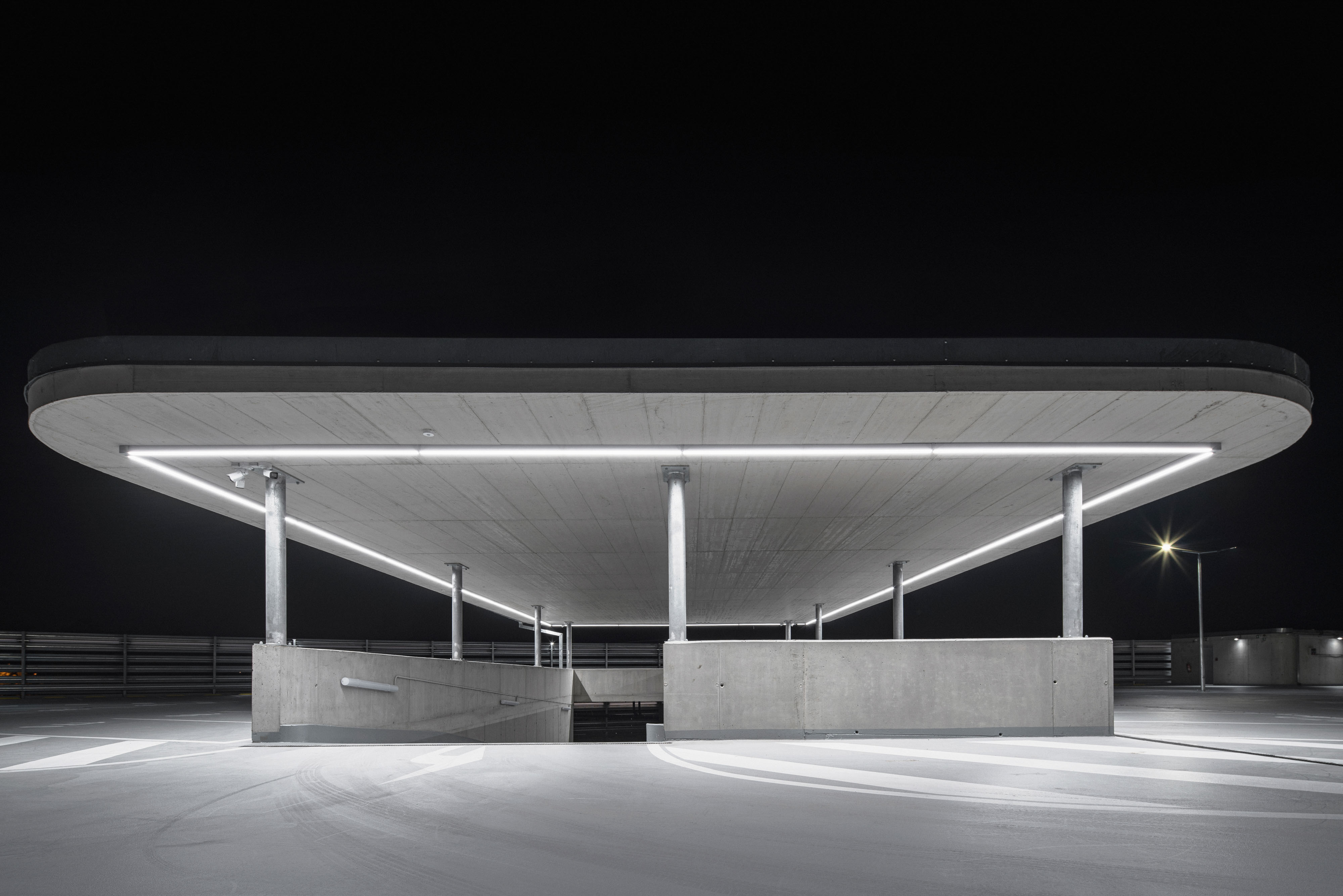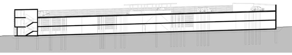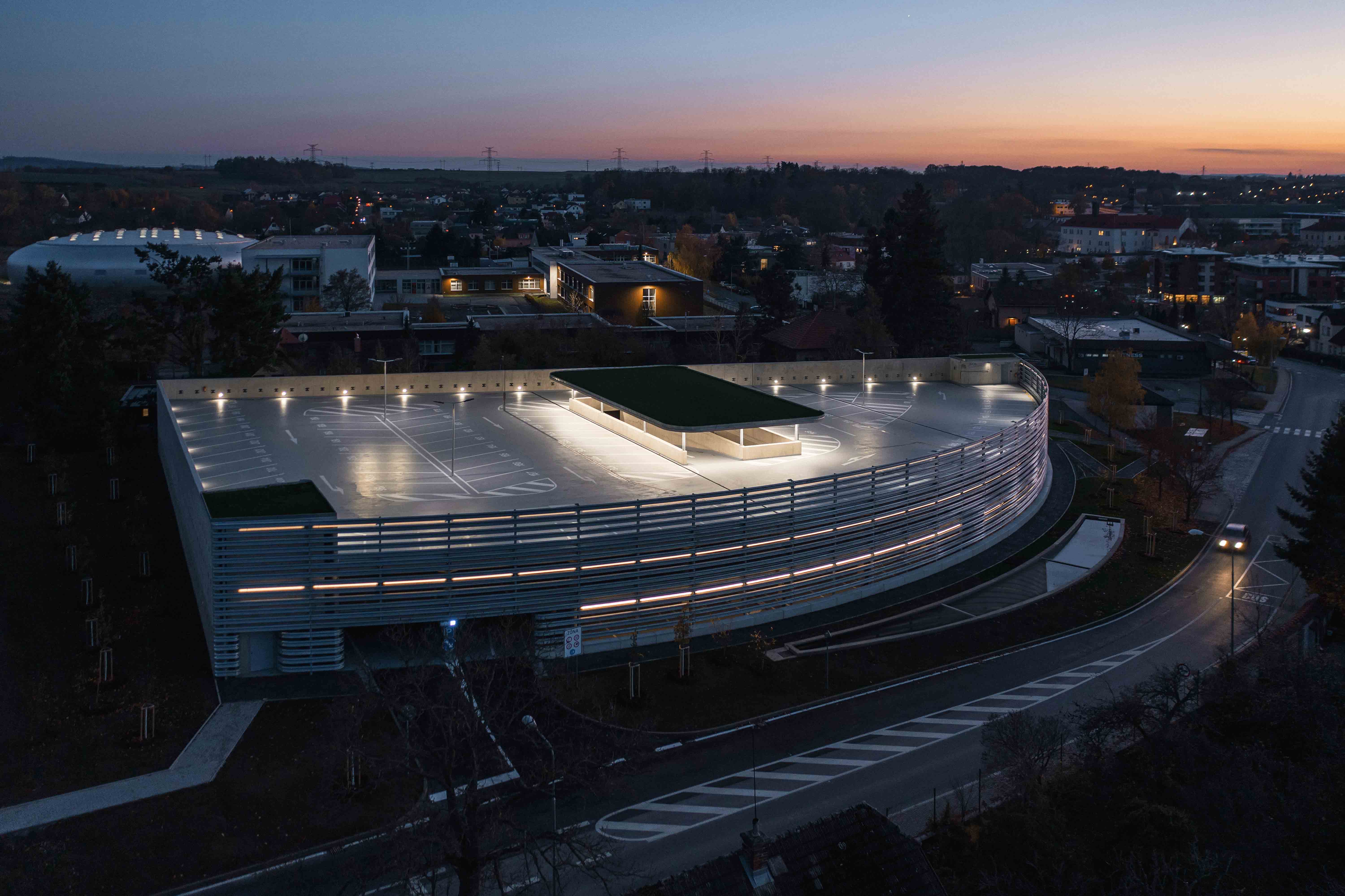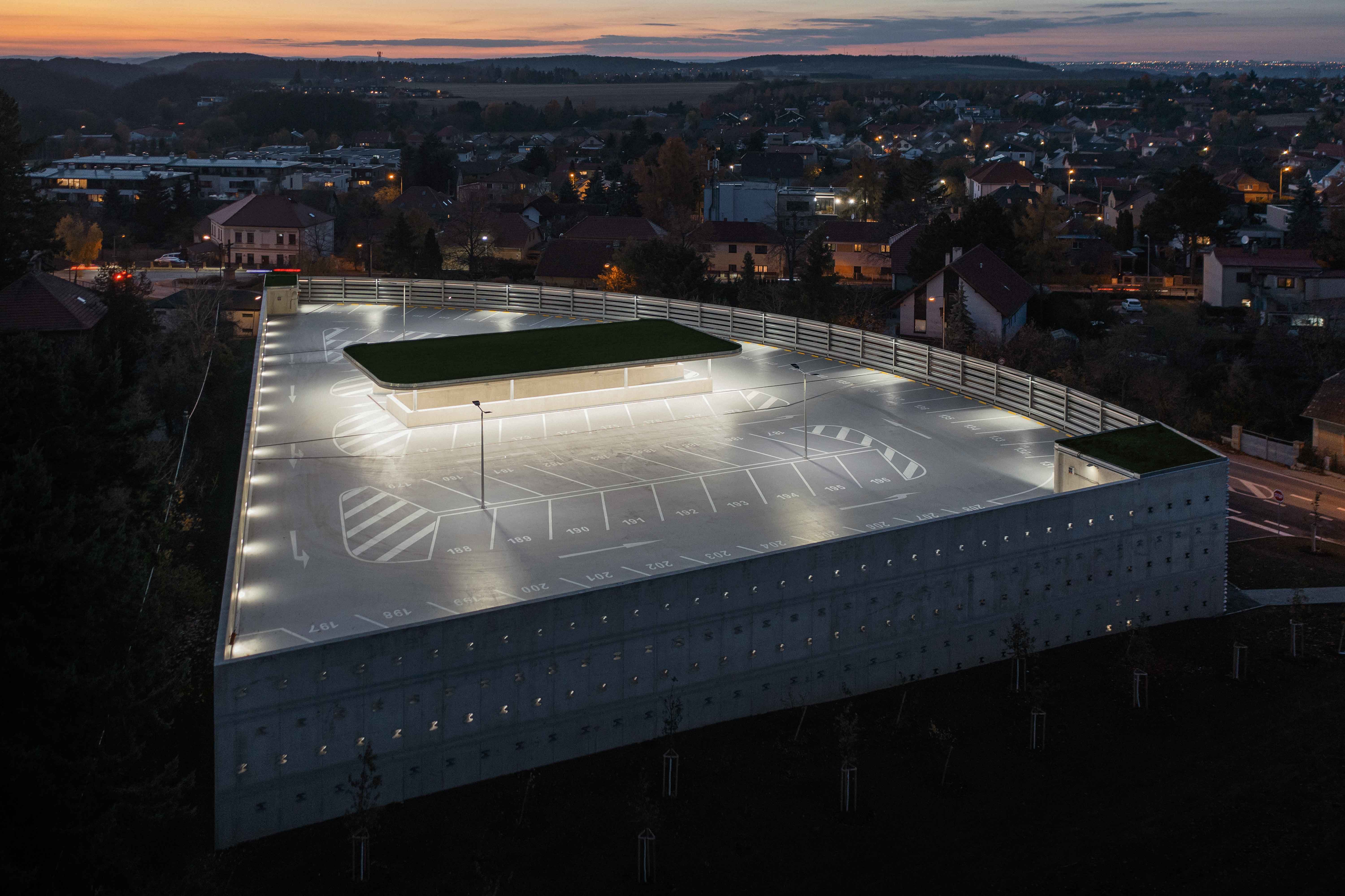 The two-storey building completely from reinforced concrete will allow parking up to 200 cars on three levels. On the plan it forms a triangle with one convexly curved side, it follows slope of the land and respects the terrain. The layout contains parking spaces with a ramp and two communication cores. The facade from the north consists of road barriers with ventilation functions. These barriers are bent to the facade radius = bends. The facades of the east and south are from reinforced concrete with small ventilation holes with diverse pattern and will allow climbing plants to grow. These openings in wall are constructed from fragments of road barriers, the same type such as on the north facade and they are used as lost formwork. They are welded together with different angles. They protect family houses in the immediate vicinity of the parking house from dazzling of car headlights at night. Inside these holes creates filtered interior lighting, scattered fragmented light, similar to what we know from the Orient. Elements of hot-dip galvanized barriers are used in the way that optically and expressively connect all three facades of the building.